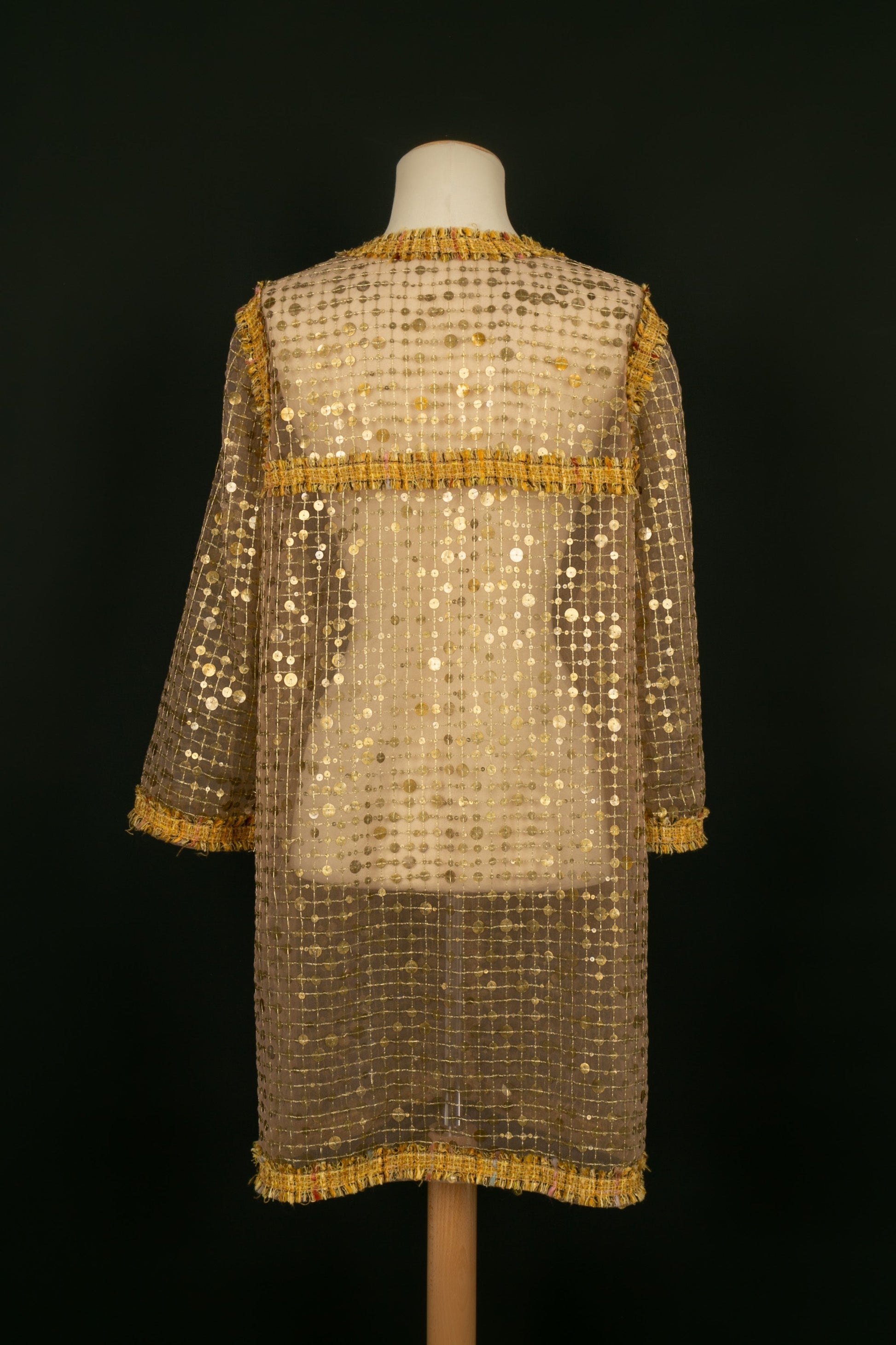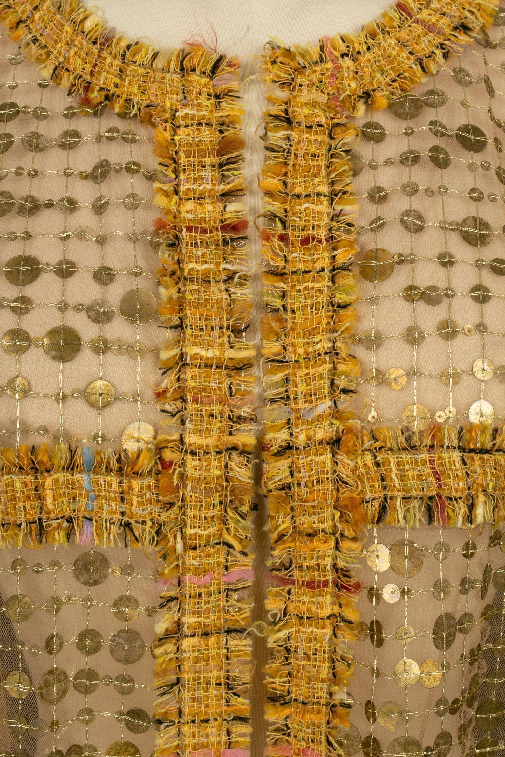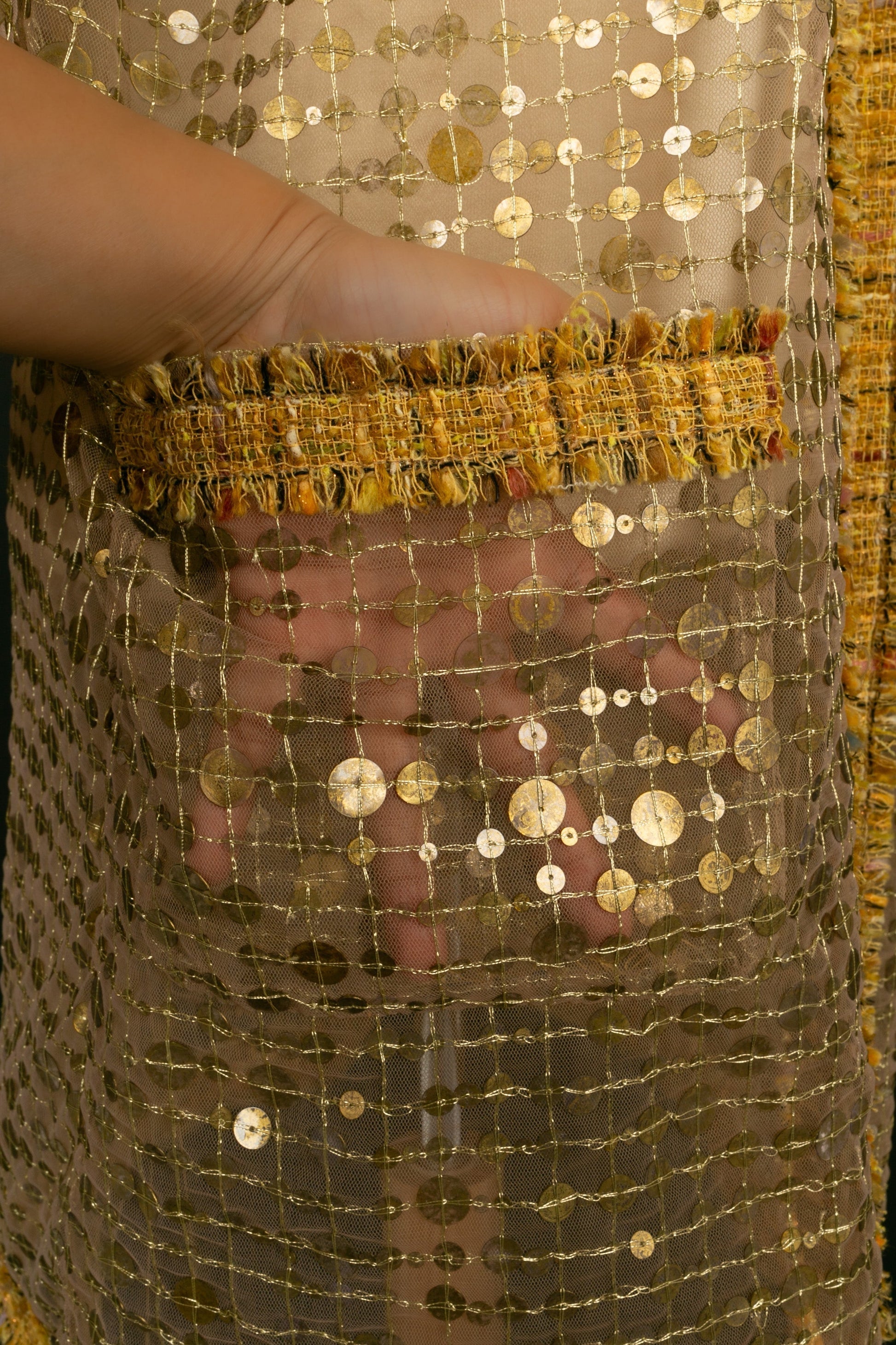 CHANEL - (Made in France) Ensemble compos d'une veste longue ouverte transparente cousue de sequins et d'un jupe en tweed de laine. Taille 44FR. Collection Resort 2011.