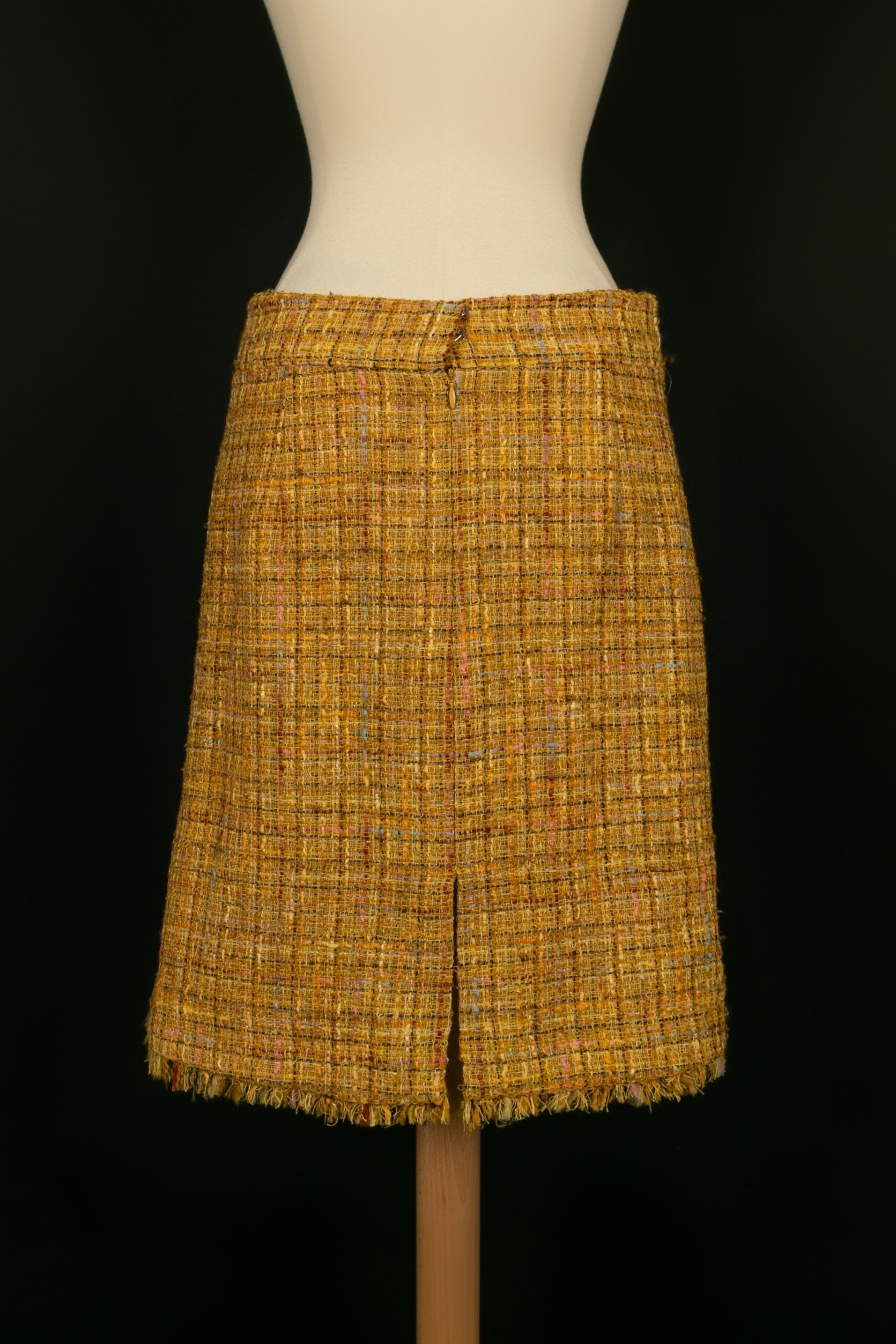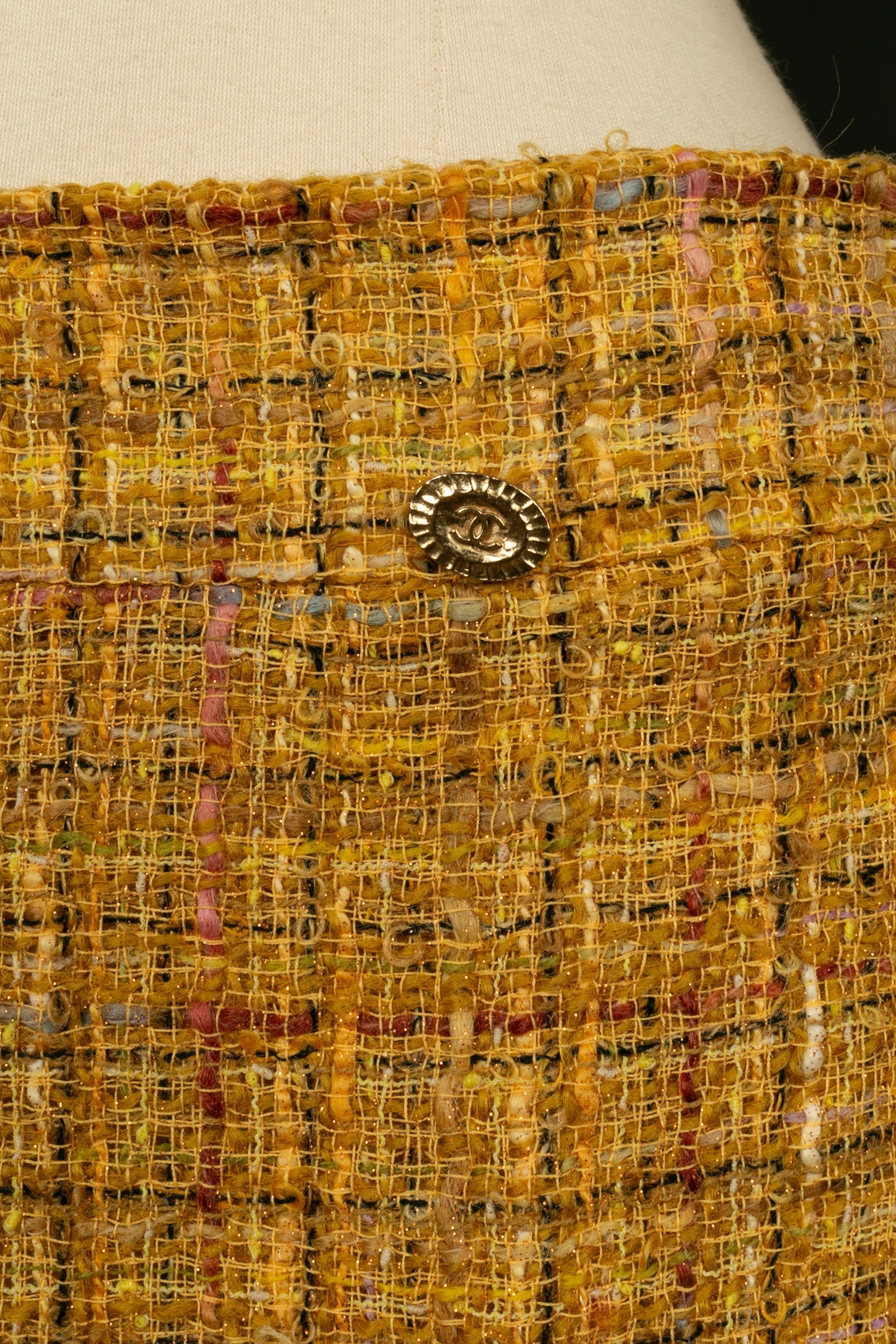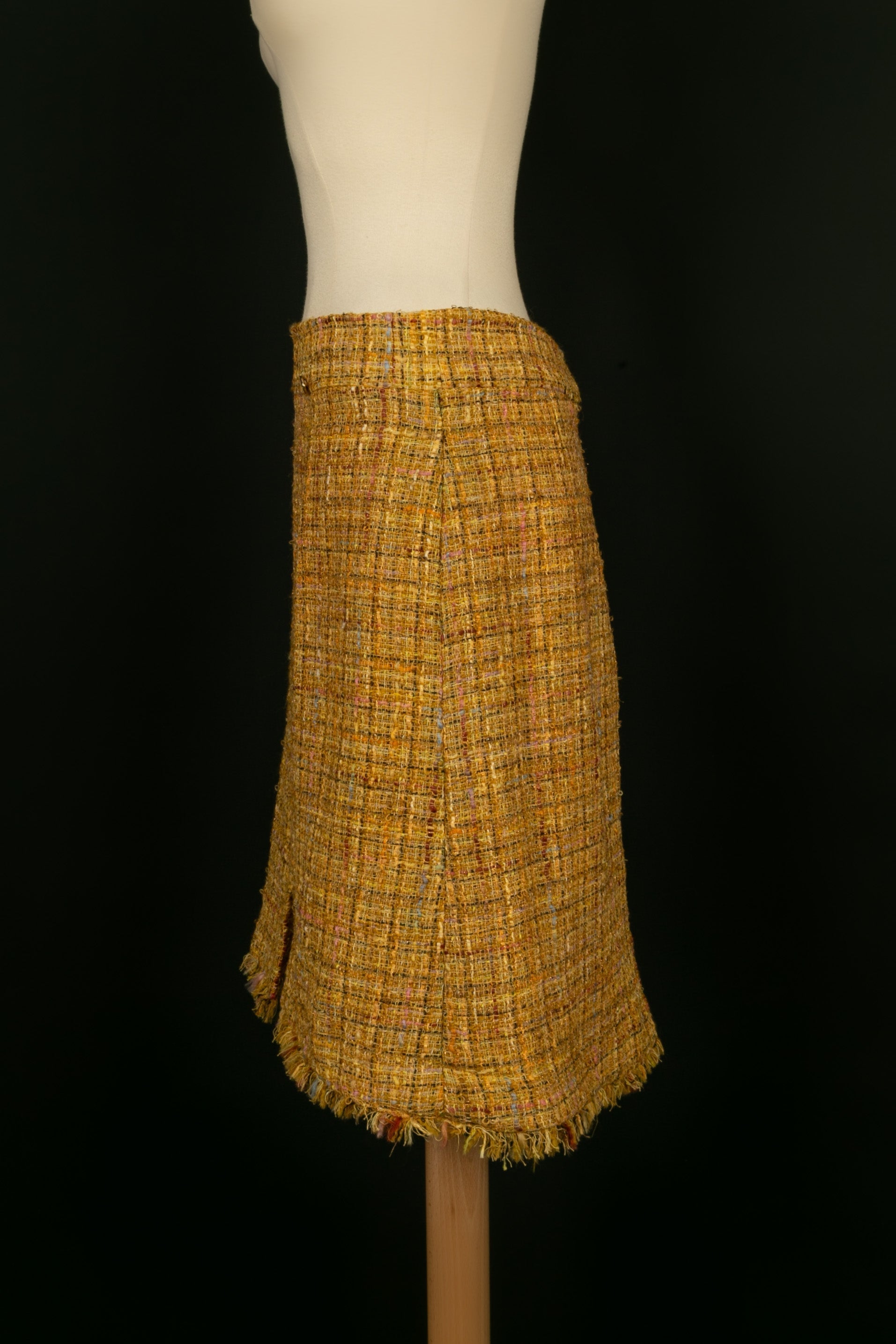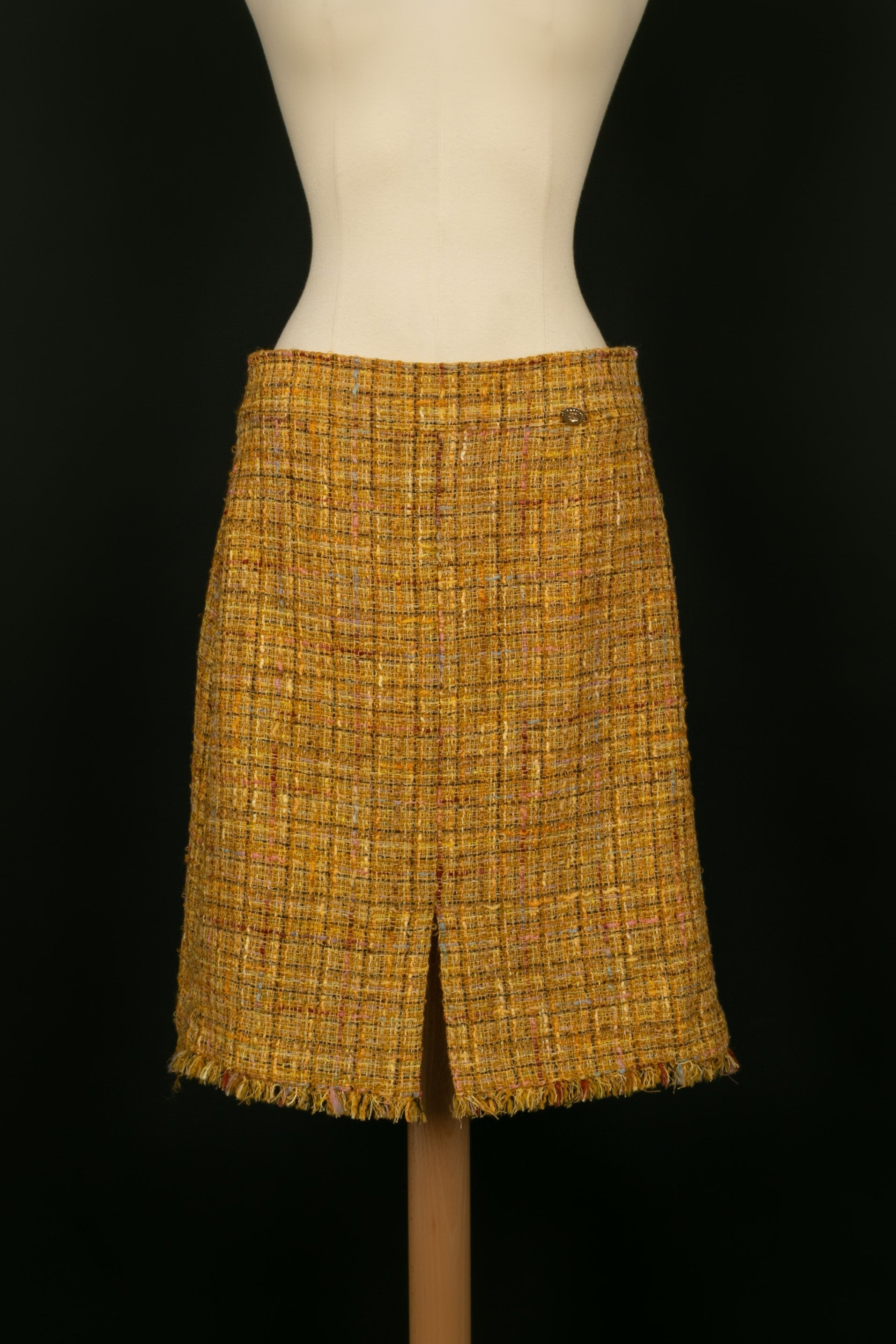 CHANEL - (Made in France) Ensemble compos d'une veste longue ouverte transparente cousue de sequins et d'un jupe en tweed de laine. Taille 44FR. Collection Resort 2011.