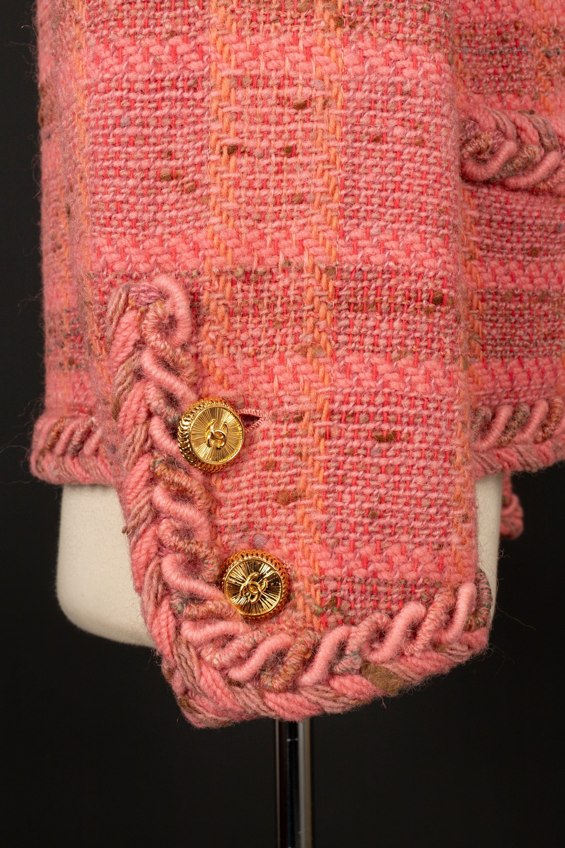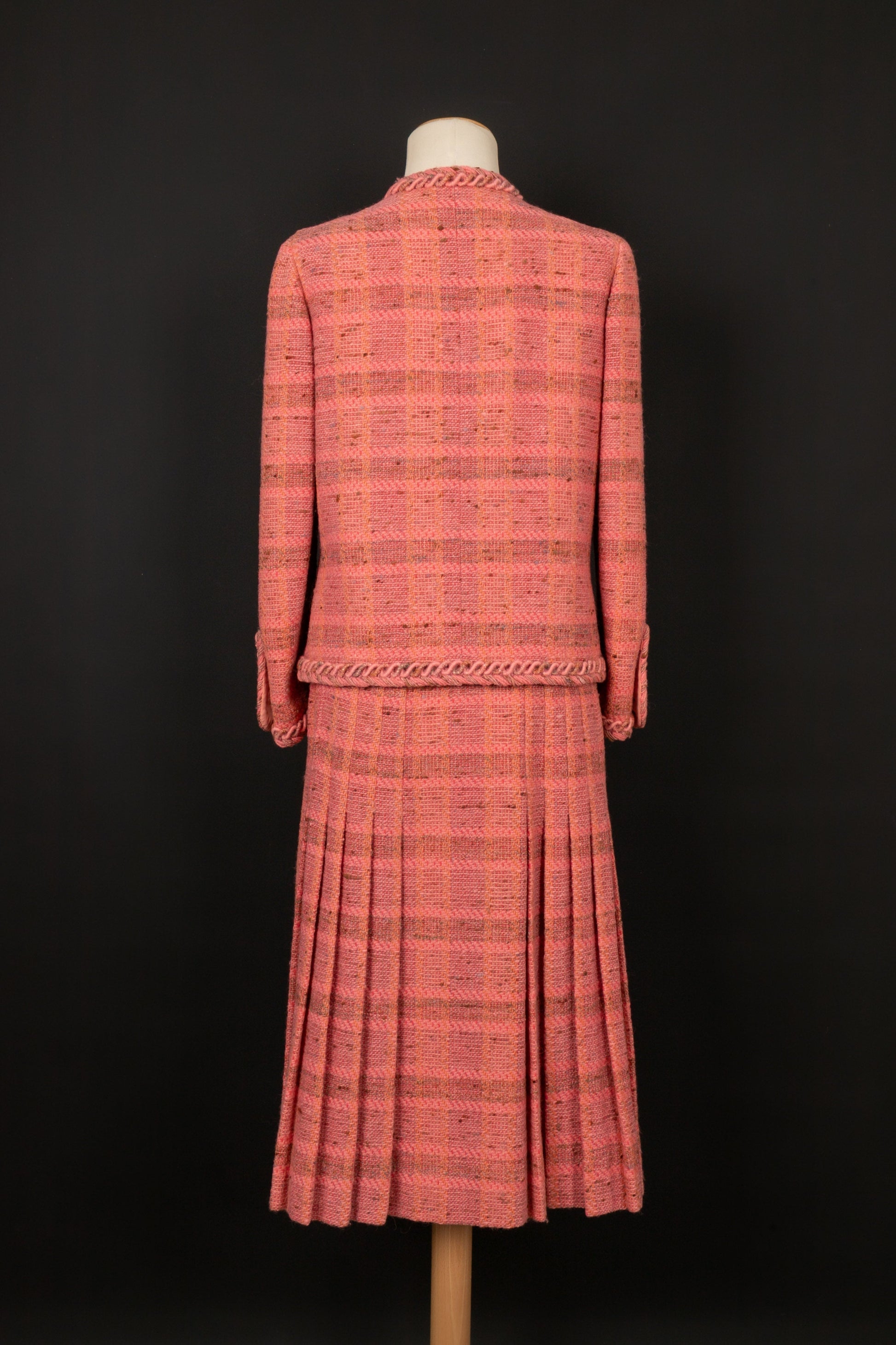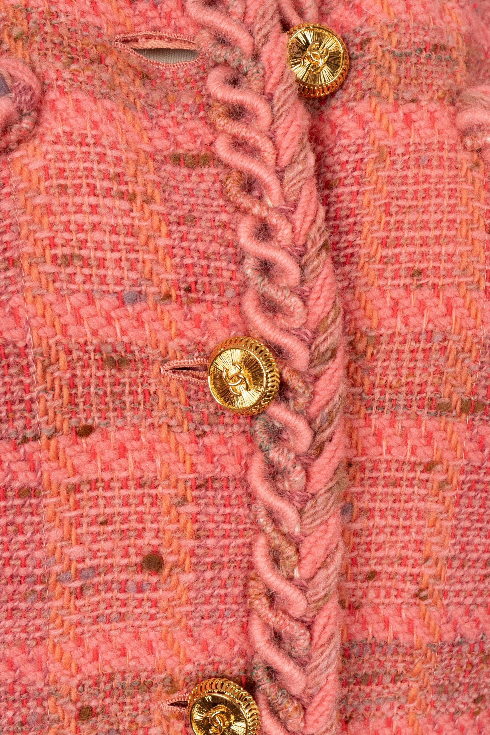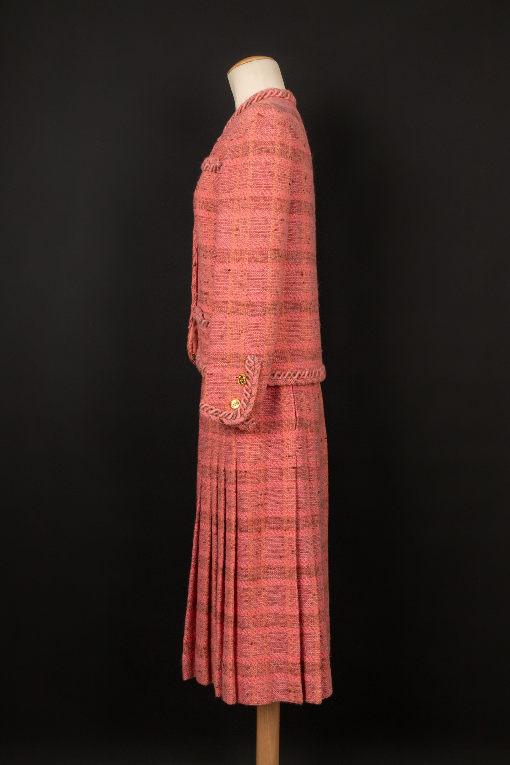CHANEL - Ensemble de tailleur Haute Couture compos d'une jupe et veste en tweed dans les tons de rose, agrment de boutons en mtal dor. Pas de taille indique, il convient un 36 FR.