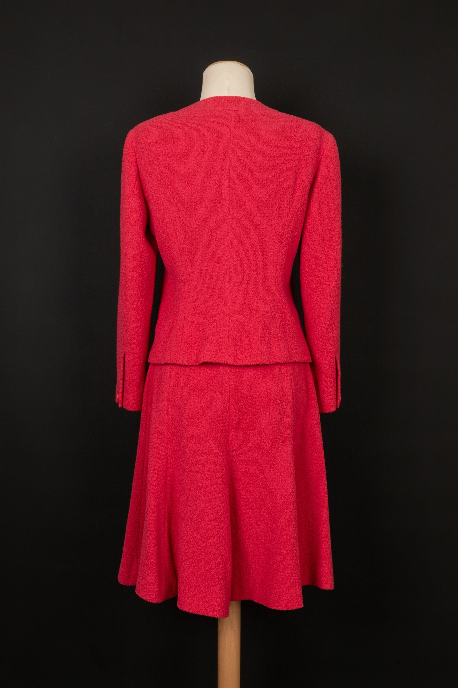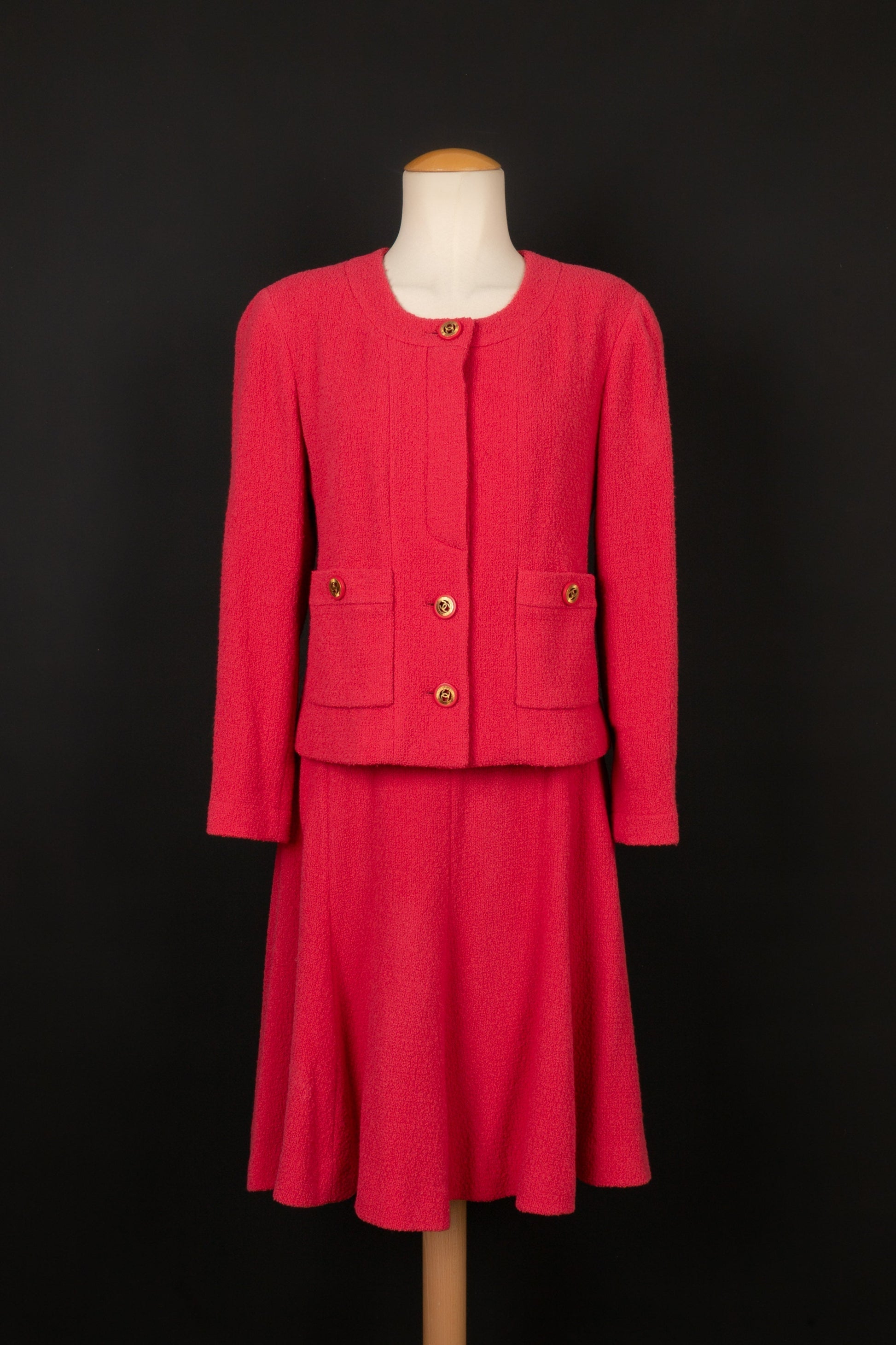 CHANEL - (Made in France) Ensemble compos d'une jupe et veste en laine rose, doublure en soie. Taille indique 40FR.