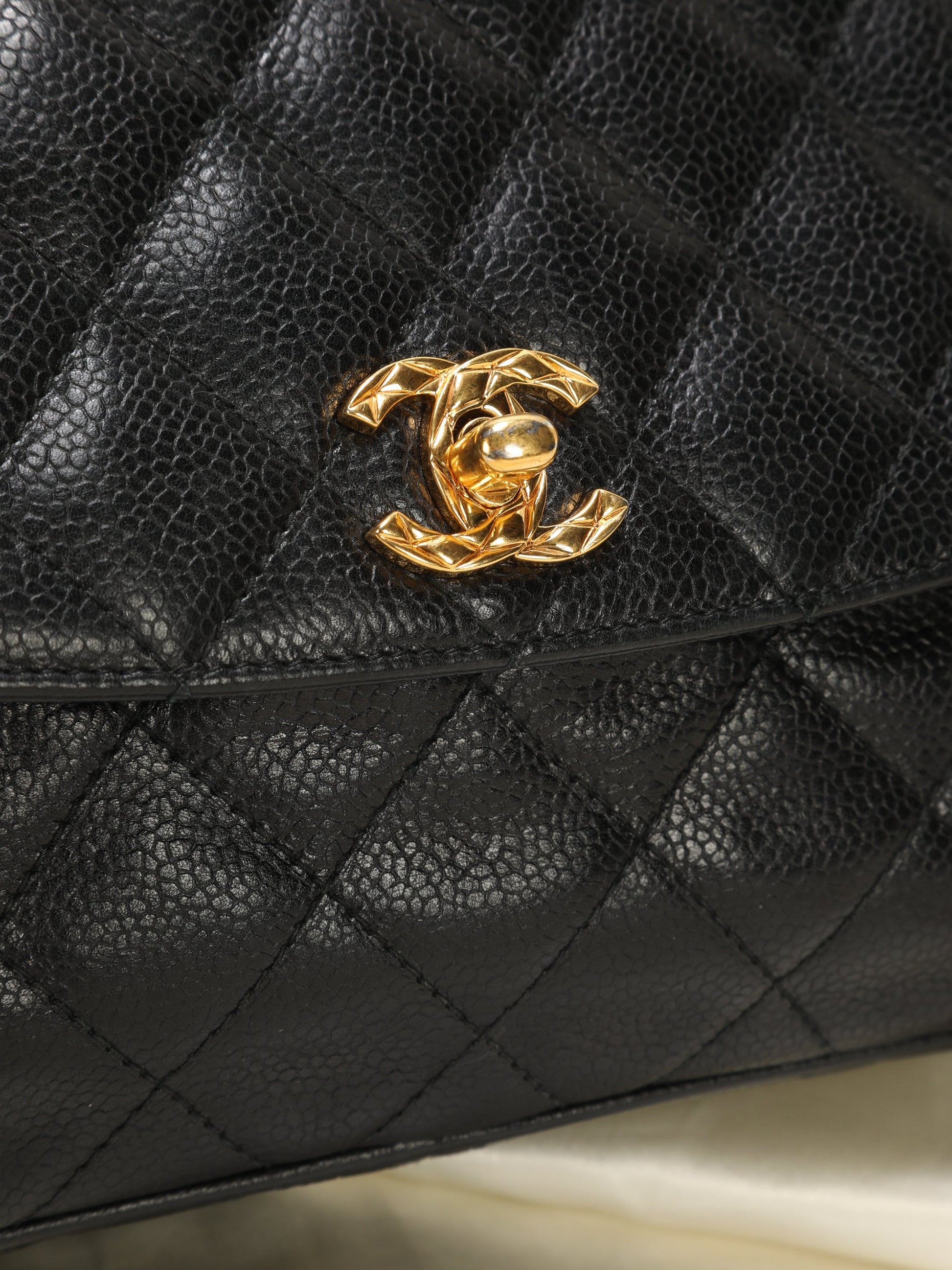 A stunning?black vintage Chanel with a 24k gold plated hardware. What makes this bag incredibly rare is the bijoux chain mixed with the rare CC turnlock logo and IN CAVIAR! Beautiful shoulder bag with a clean interior! Exact bag is currently online for 6000+!