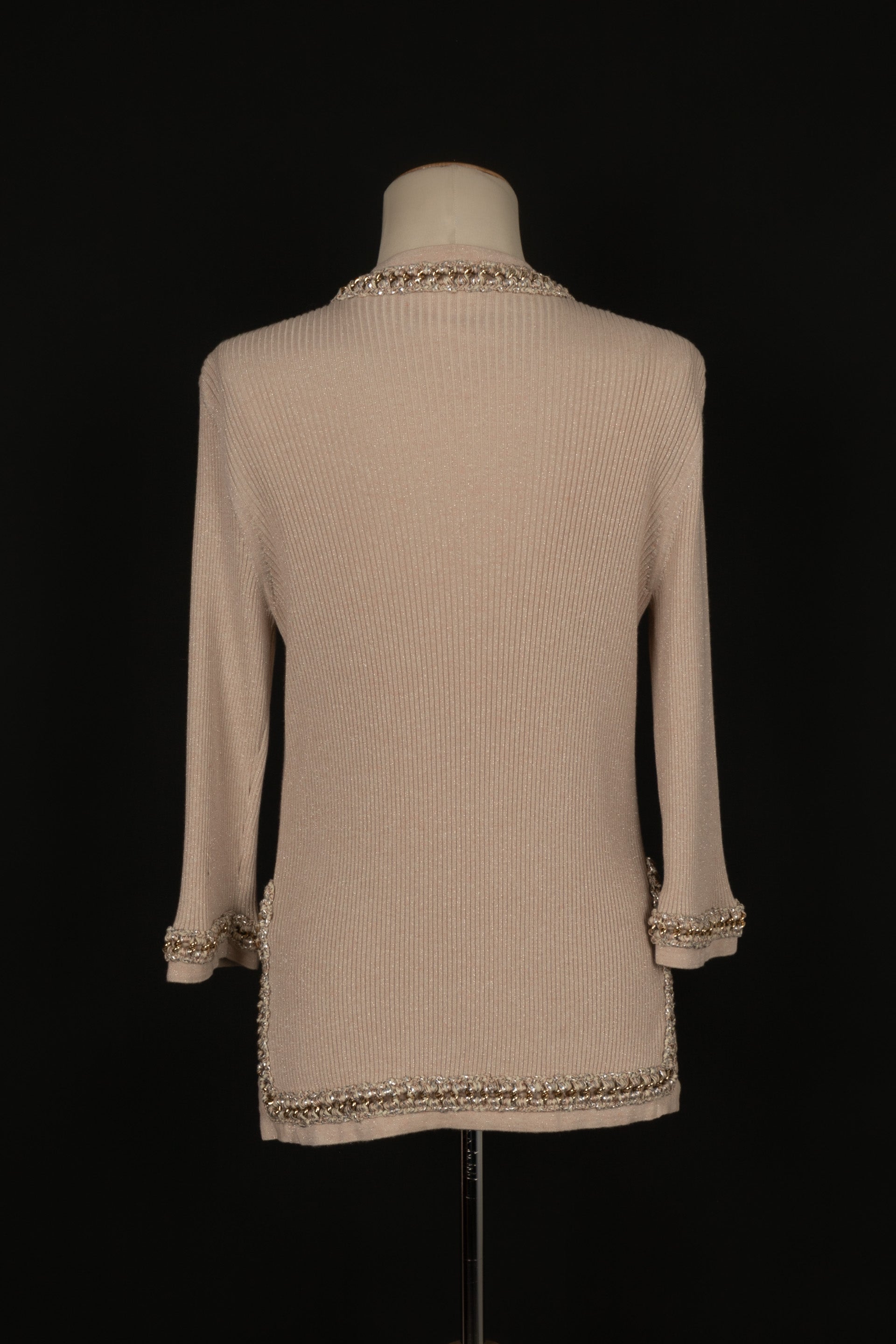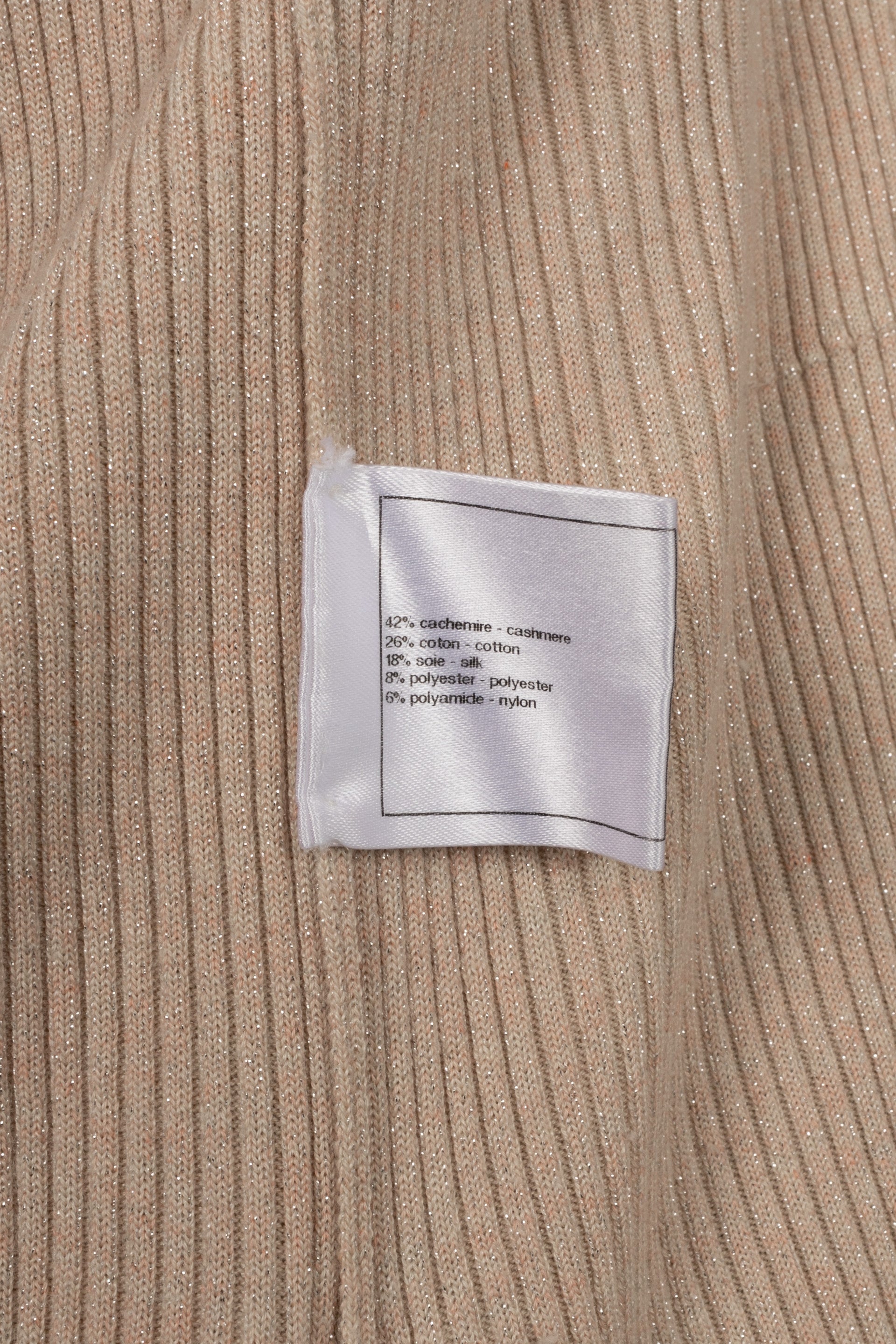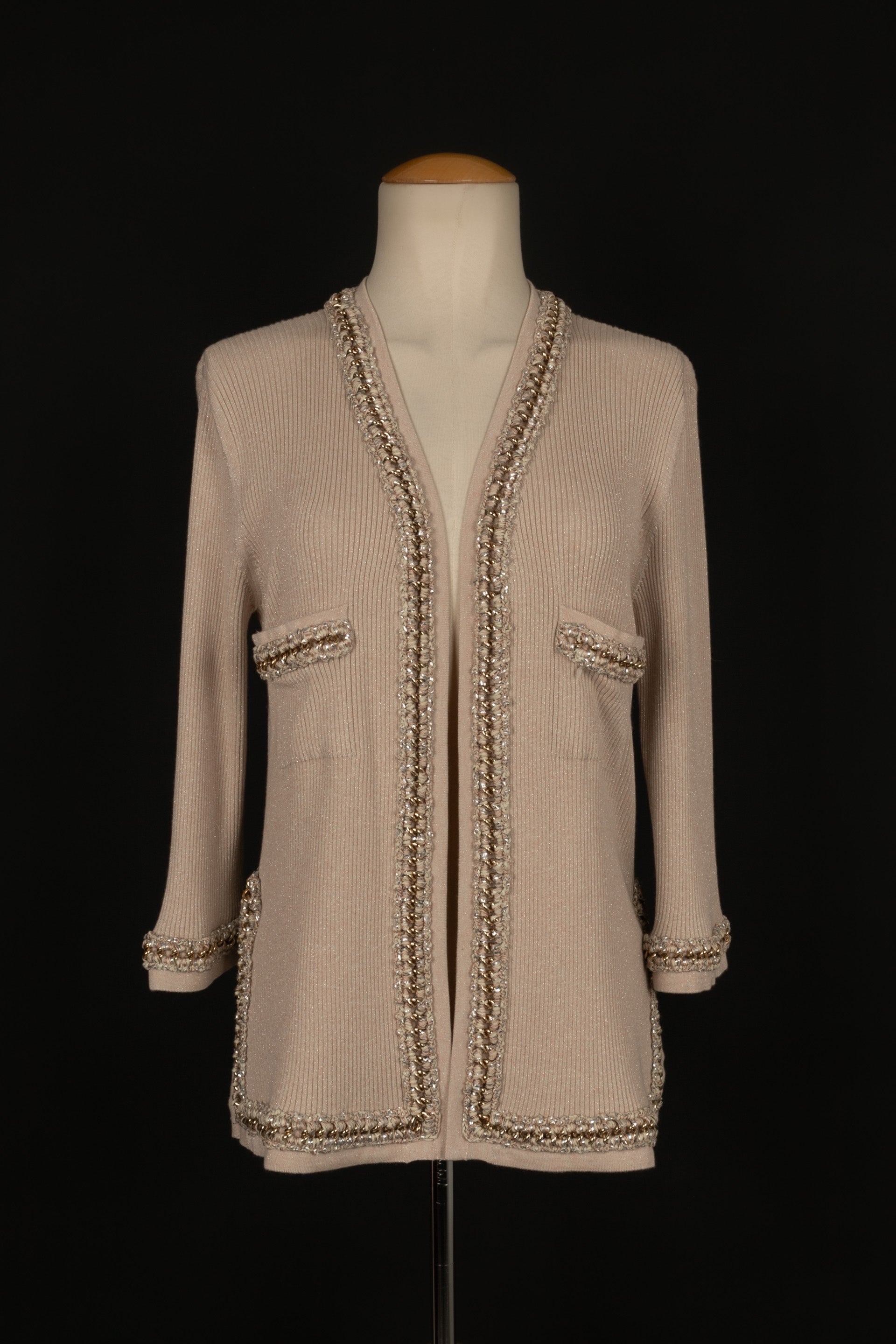 CHANEL - (Made in France) Veste sans bouton en fine maille ctele de cachemire beige iris, parements en passementerie en lam argent et mtal dor. Taille 44FR, il correspond mieux un 38FR.