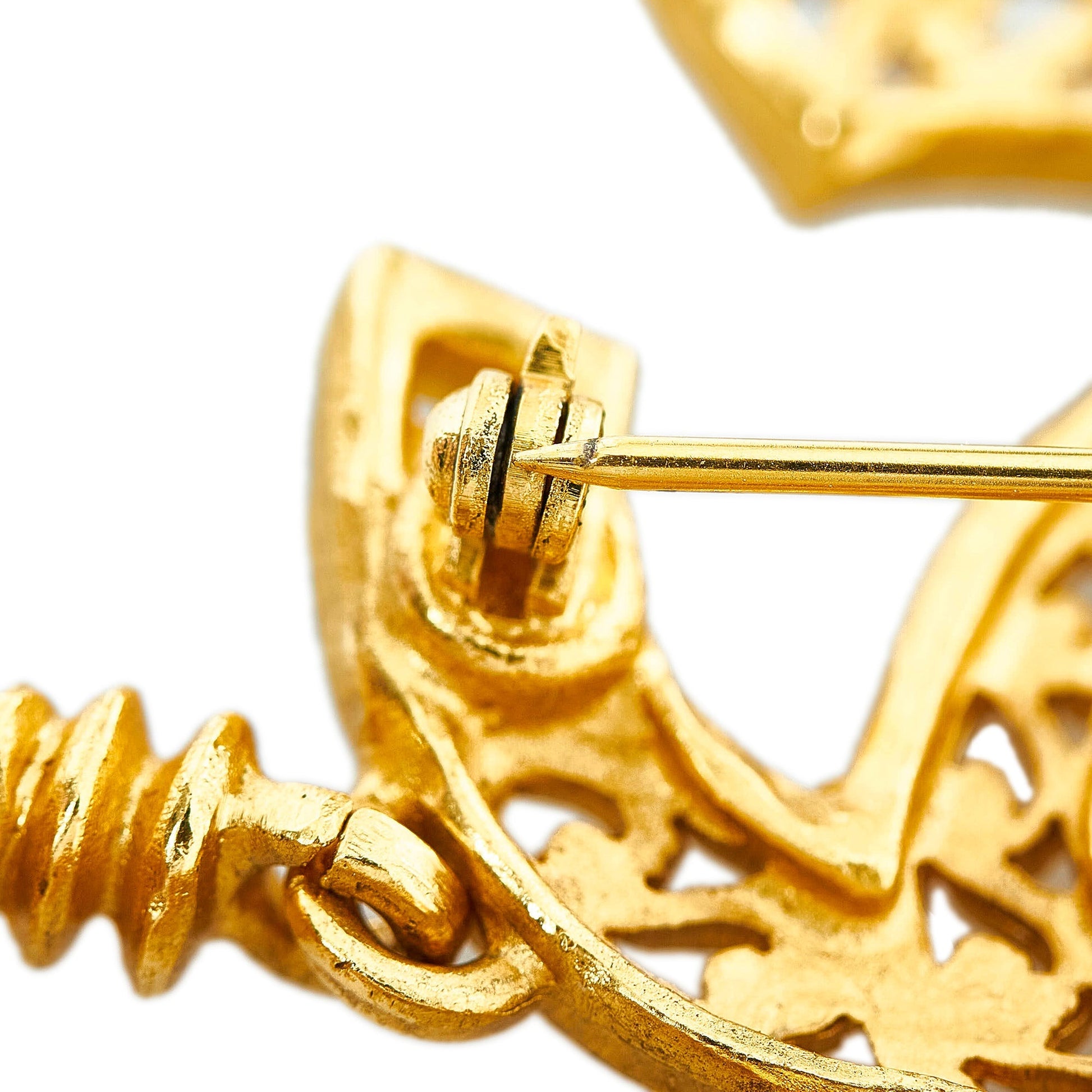 Product Details: Gold Chanel CC Brooch. This brooch features a metal body and a back pin closure. 2.4" L x 1.6" W x 0" D. Serial number 95 A.