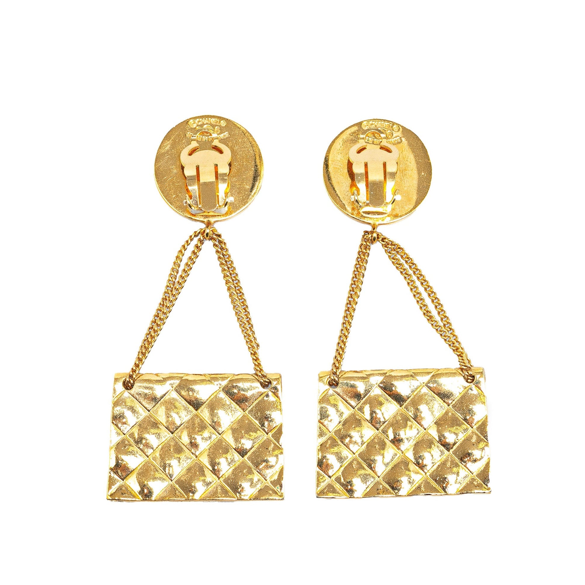 Product Details: Gold Chanel Gold Plated CC 2.55 Flap Bag Clip On Earrings. These earrings feature a gold-plated metal body and clip-on closures. 3" L x 1.3" W x 0" D.