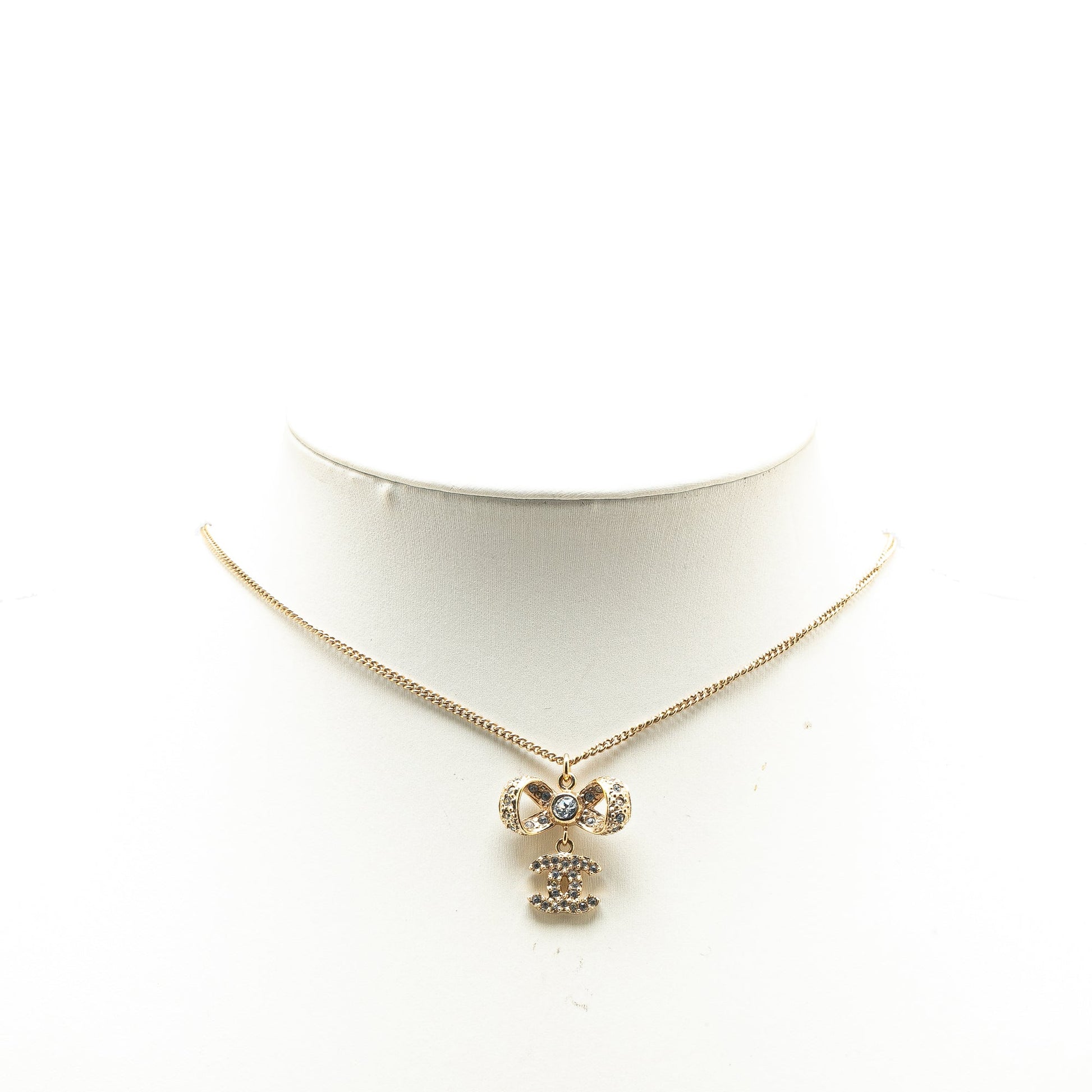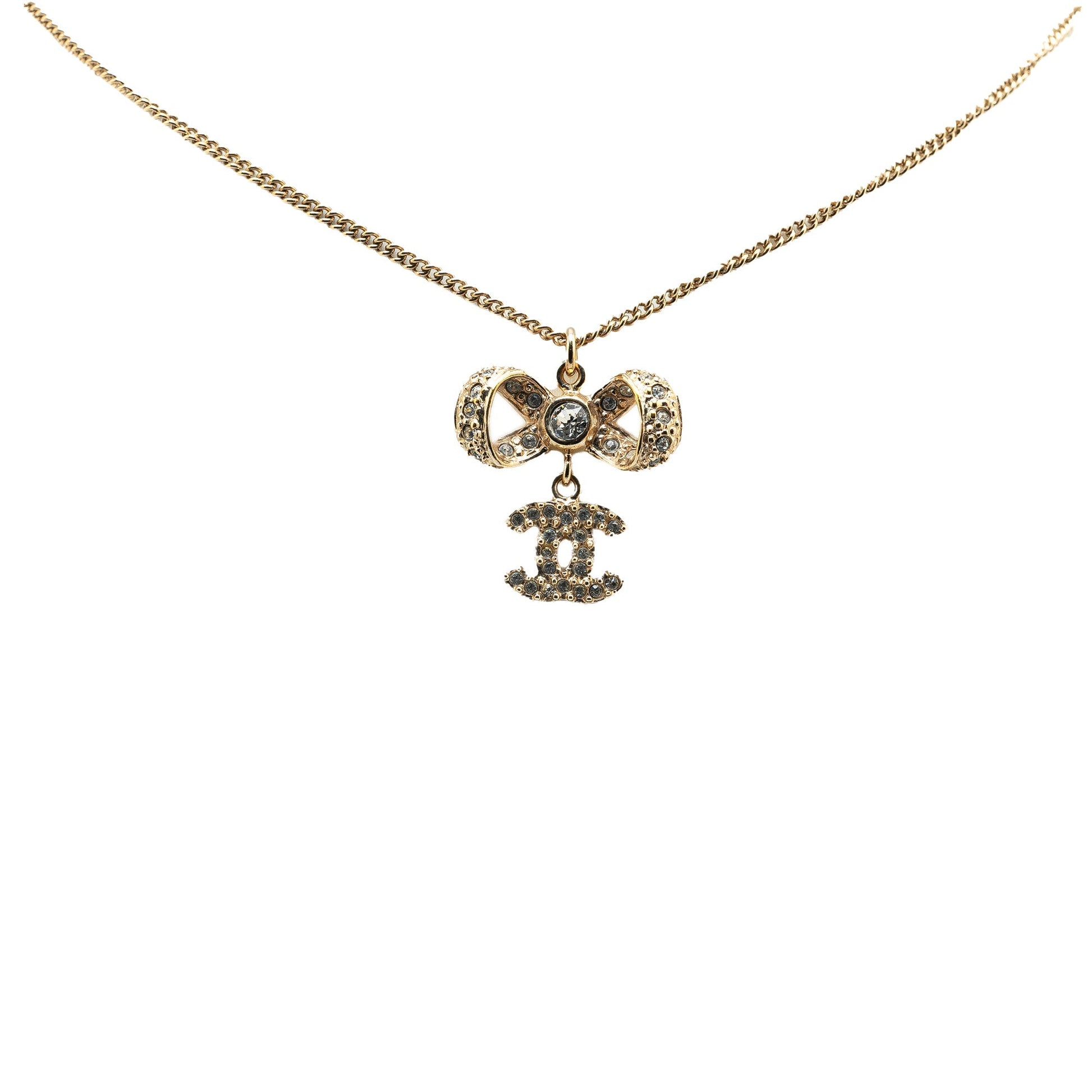 Product Details: Gold Chanel Gold Plated CC Bow Crystal Pendant Necklace. This necklace features a gold plated chain and pendant with crystal details, and a lobster claw closure. 16.7" L x 0.9" W x 0" D. Serial number B16V.