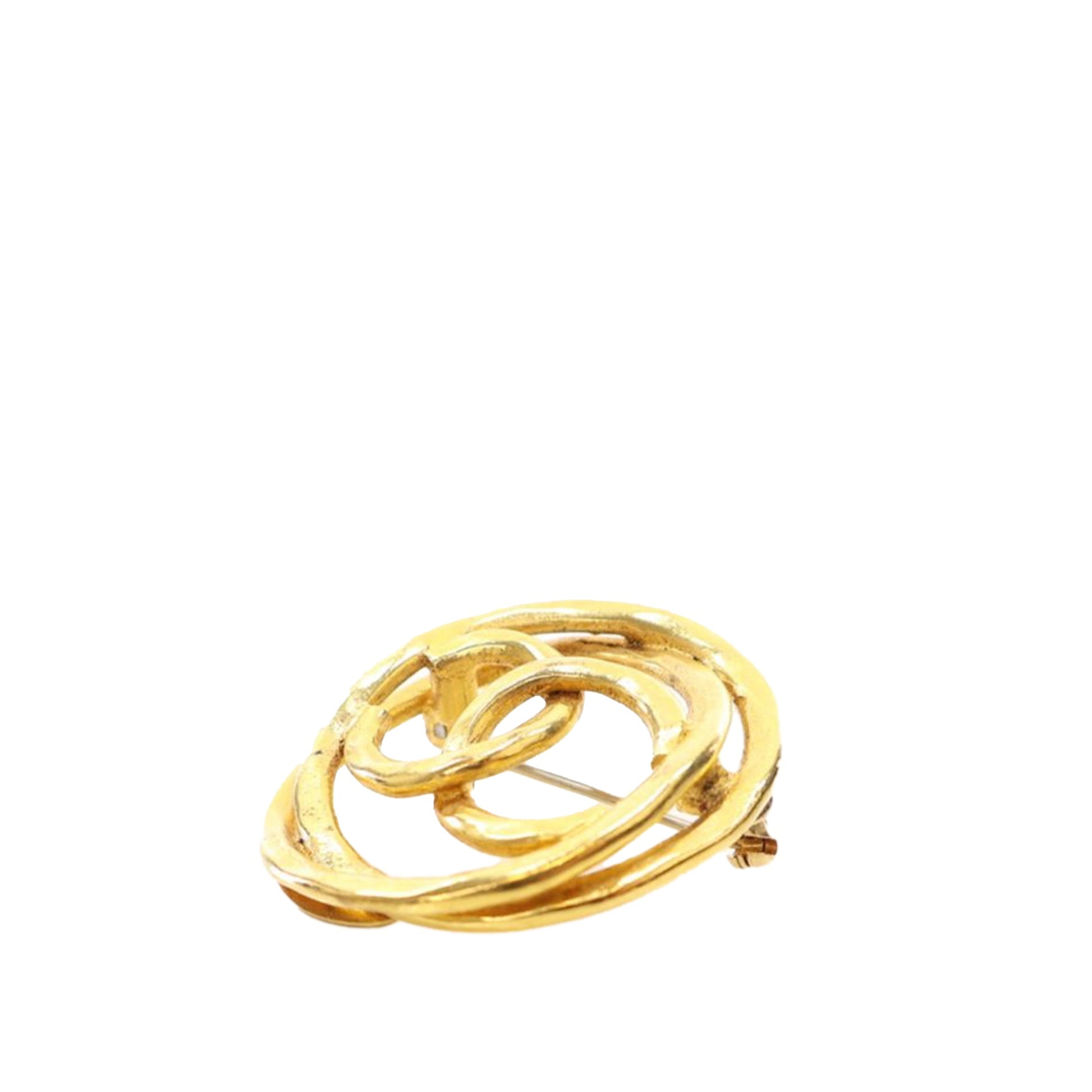 Product Details: Gold Chanel Gold Plated CC Brooch. This brooch features a gold plated metal body, and a back pin closure. 1.5" L x 1.7" W x 0" D.