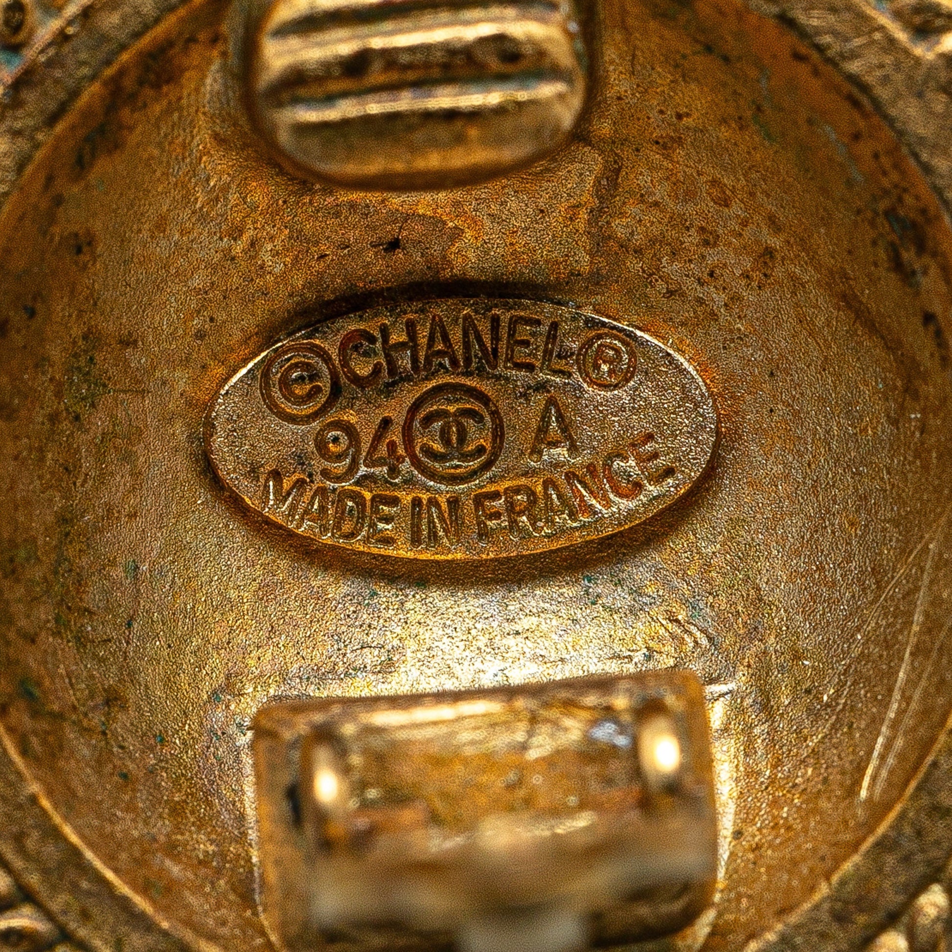 Product Details: Gold Chanel Gold Plated CC Clip On Earrings. These earrings feature a gold-plated body and clip-on closure. 0.9" L x 0.9" W x 0" D. Serial number 94A.