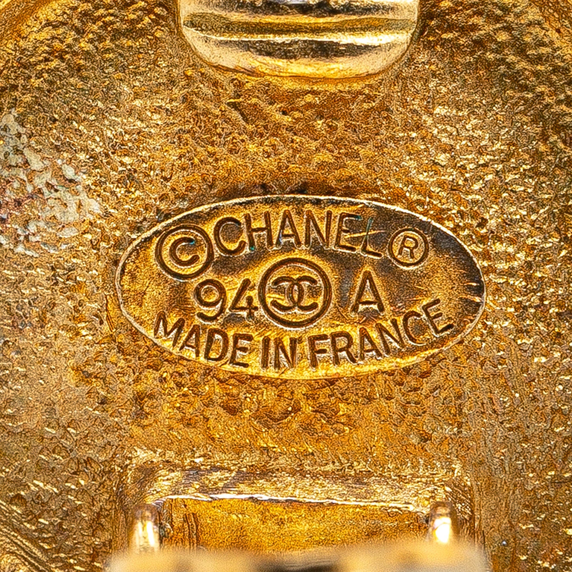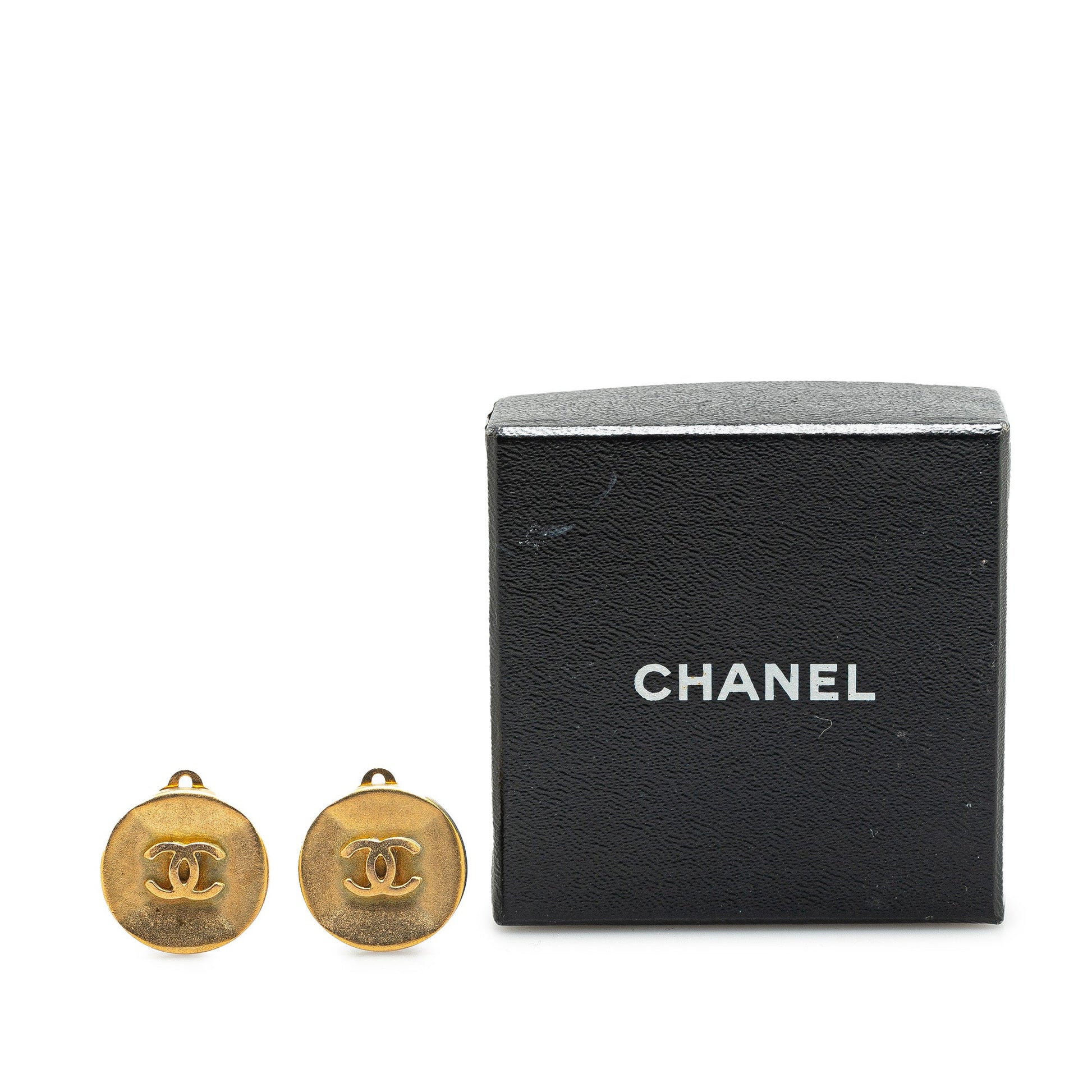 Product Details: Gold Chanel Gold Plated CC Clip On Earrings. These earrings feature a gold-plated body and clip-on closure. 0.8" L x 0.8" W x 0" D. Serial number 94A.