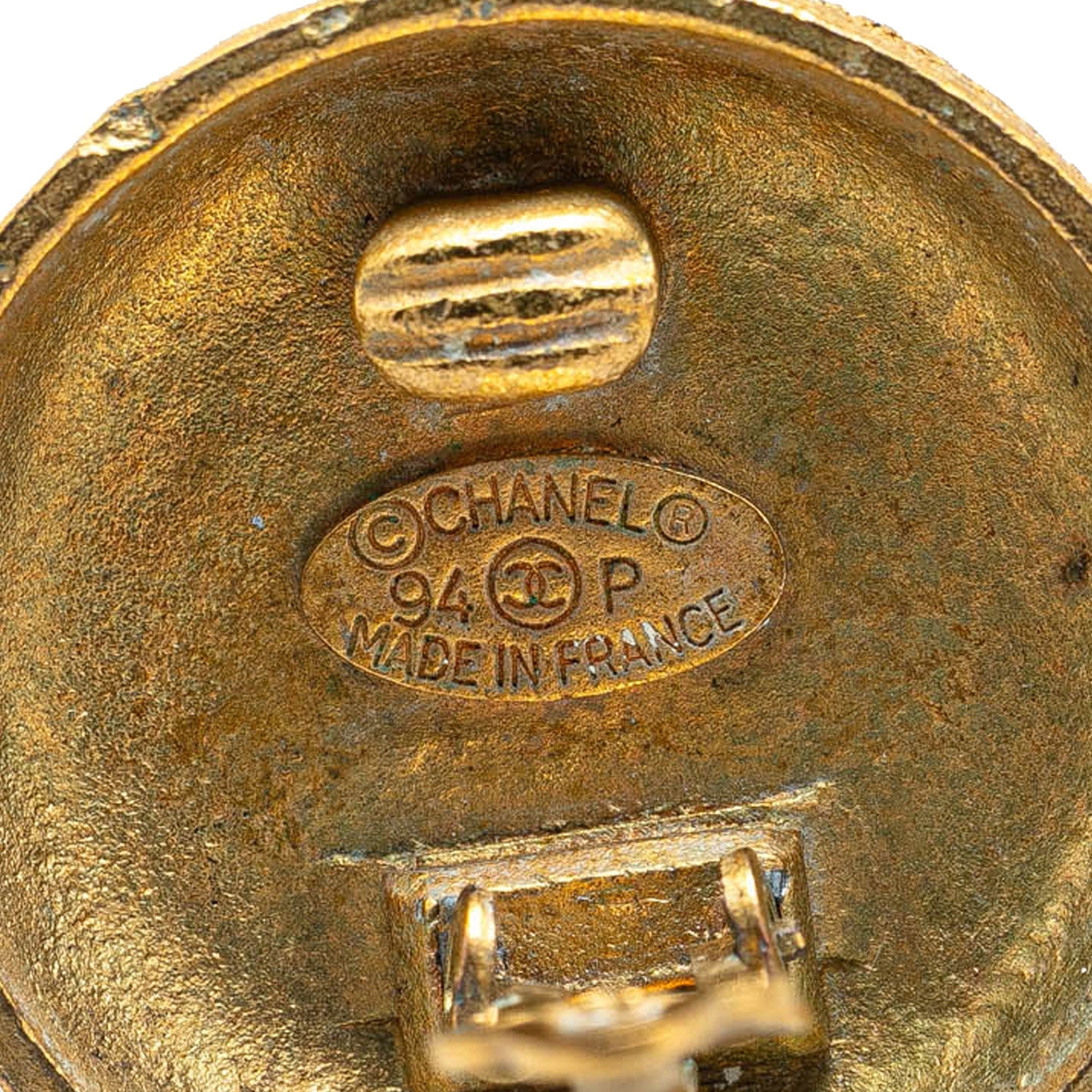 Product Details: Gold Chanel Gold Plated CC Clip On Earrings. These earrings feature a gold-plated body and back clip-on closure. 1" L x 1" W x 0" D. Serial number 94P.
