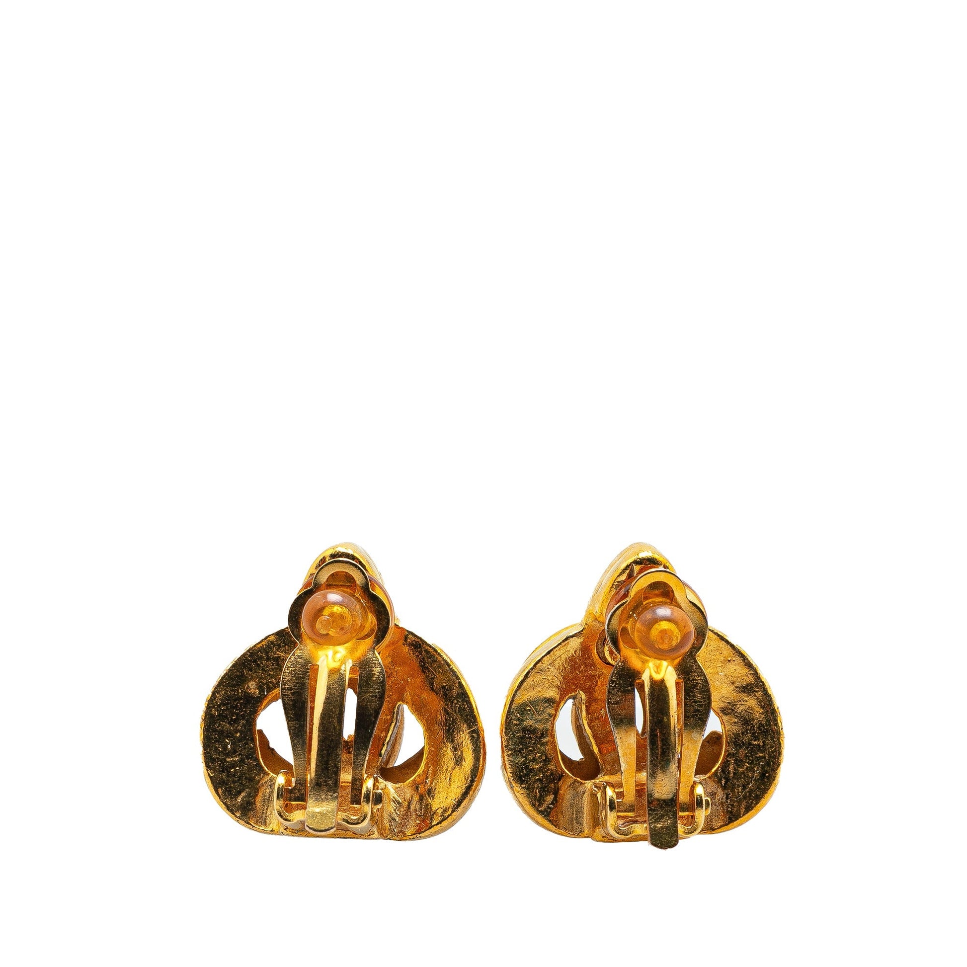 Product Details: Gold Chanel Gold Plated CC Clip On Earrings. These earrings feature a gold plated metal body and back clip on closure. 0.7" L x 0.7" W x 0" D. Serial number 97P.