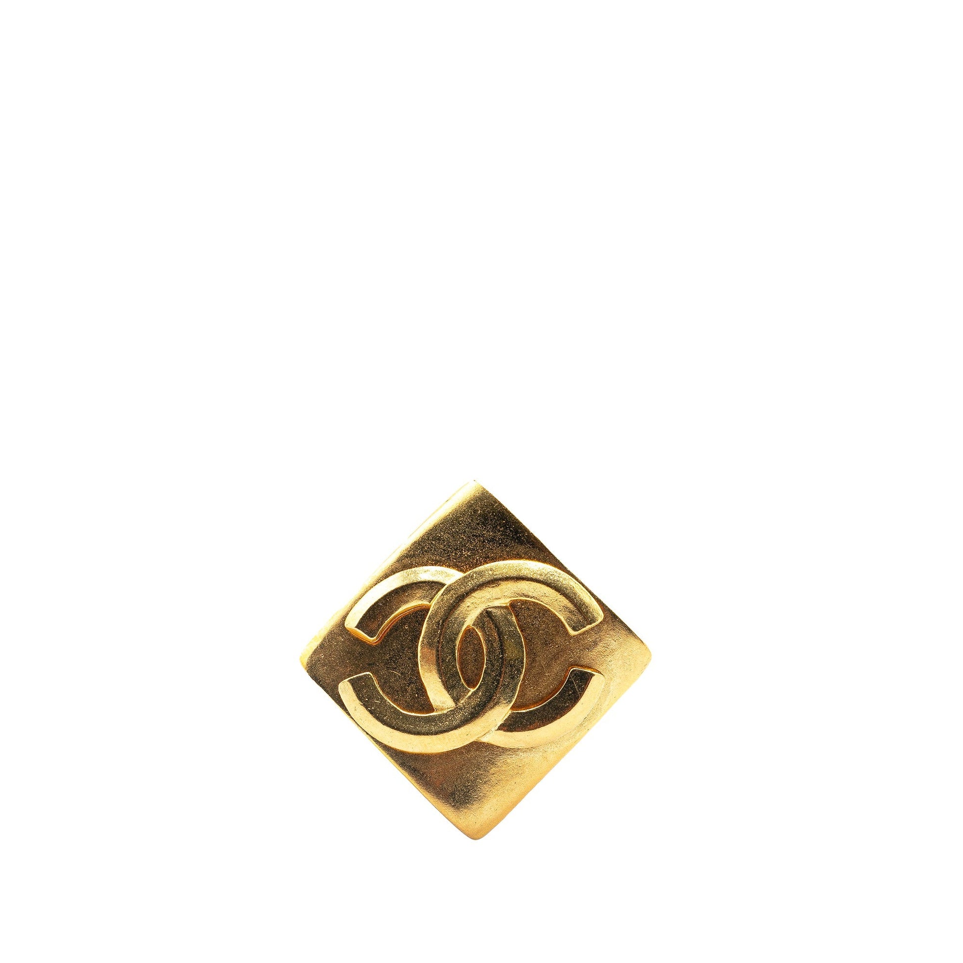 Product Details: Gold Chanel Gold Plated CC Diamond Brooch. This brooch features a gold-tone metal body and a back pin closure. 1.9" L x 1.9" W x 0" D. Serial number 96P.