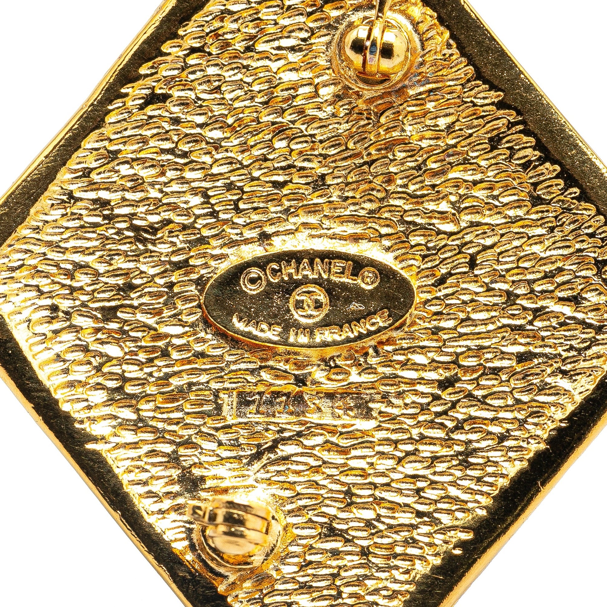Product Details: Gold Chanel Gold Plated CC Diamond Brooch. This brooch features a gold plated metal body and a back pin closure. 2" L x 1.6" W x 0" D.