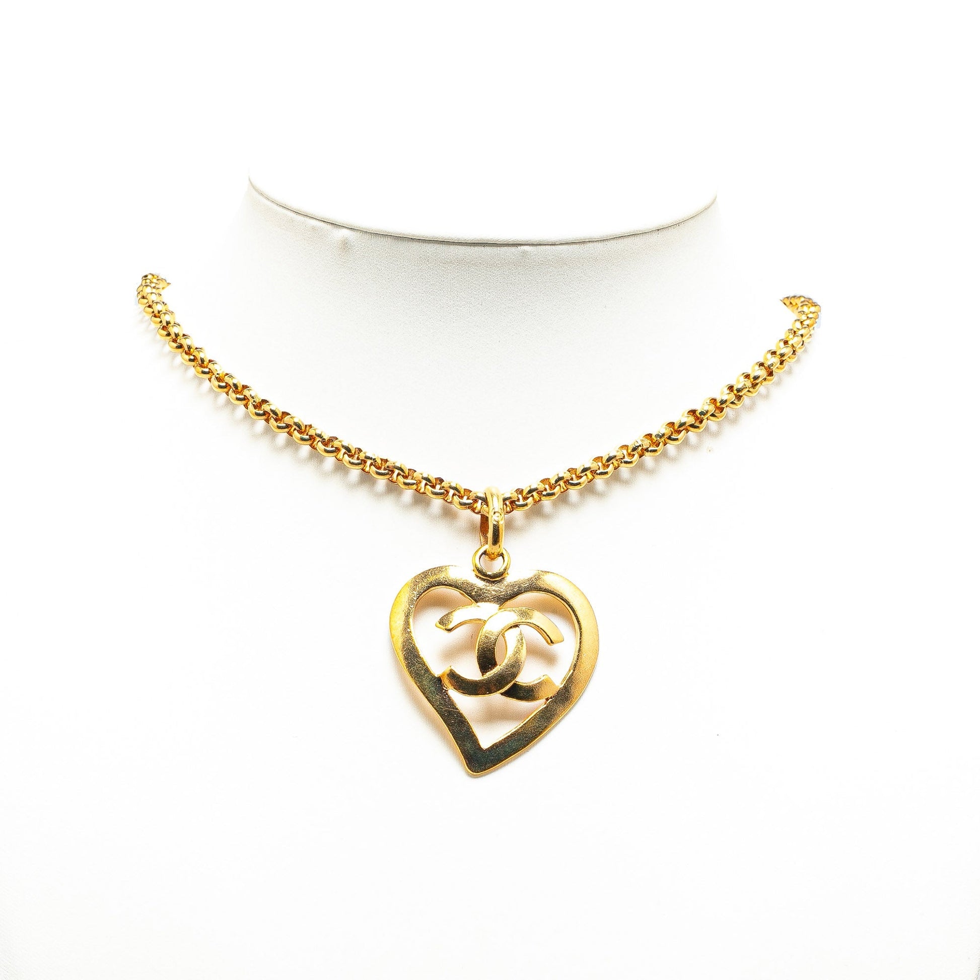 Product Details: Gold Chanel Gold Plated CC Heart Pendant Necklace. This necklace features a gold-tone pendant and chain, and a spring ring closure. 23.6" L x 1.8" W x 0" D.