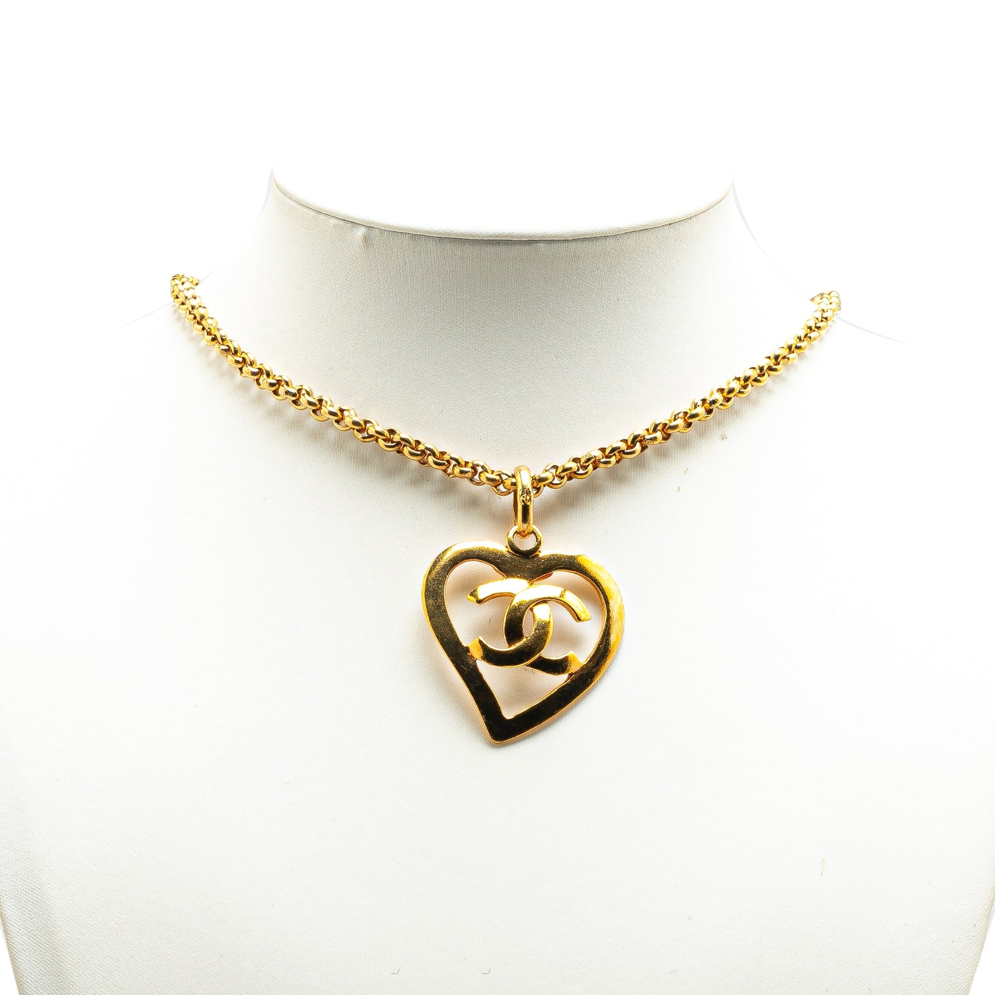 Product Details: Gold Chanel Gold Plated CC Heart Pendant Necklace. This necklace features a gold-tone pendant, a gold-tone chain, and a spring ring closure. 22.4" L x 2.2" W x 0" D. Serial number 95 P.
