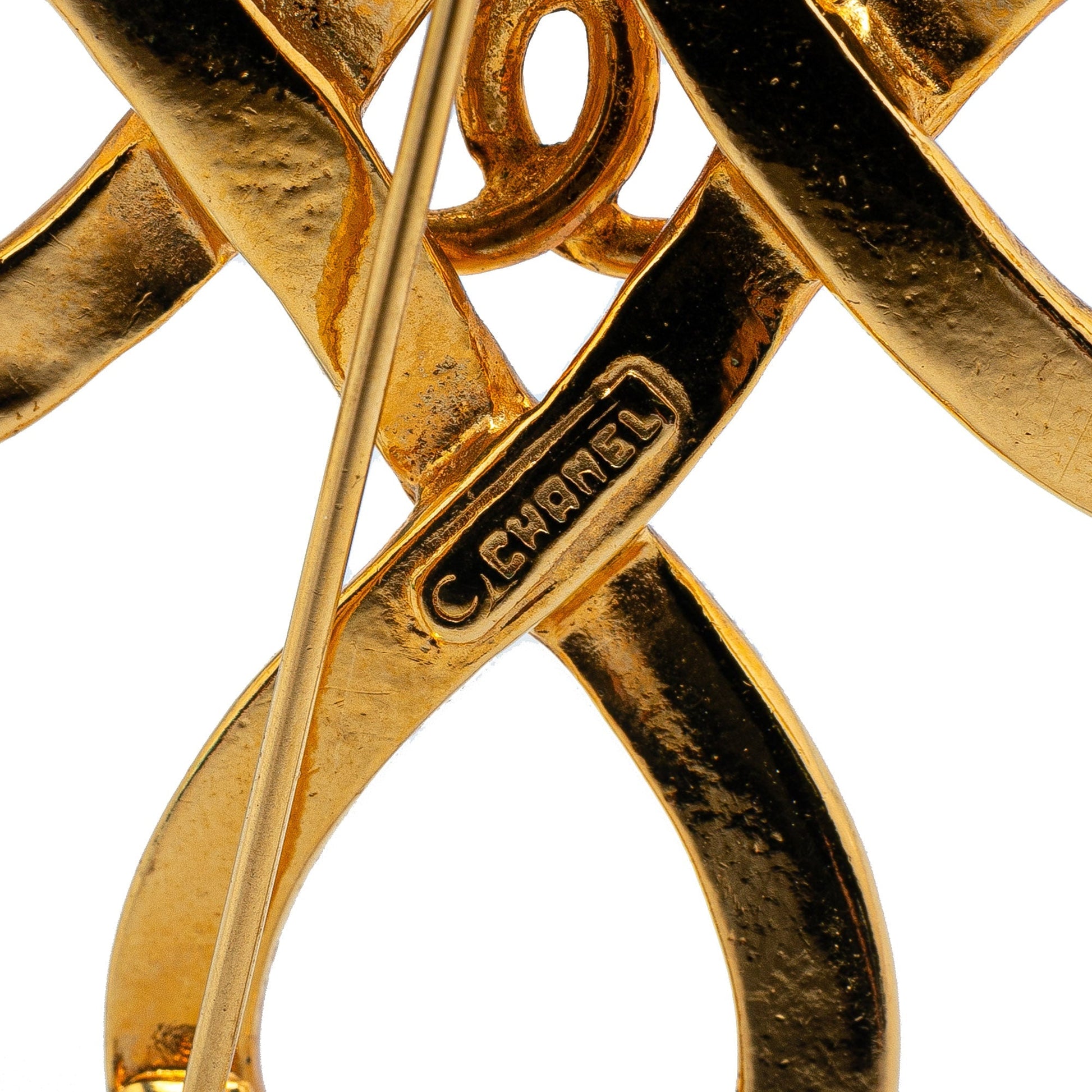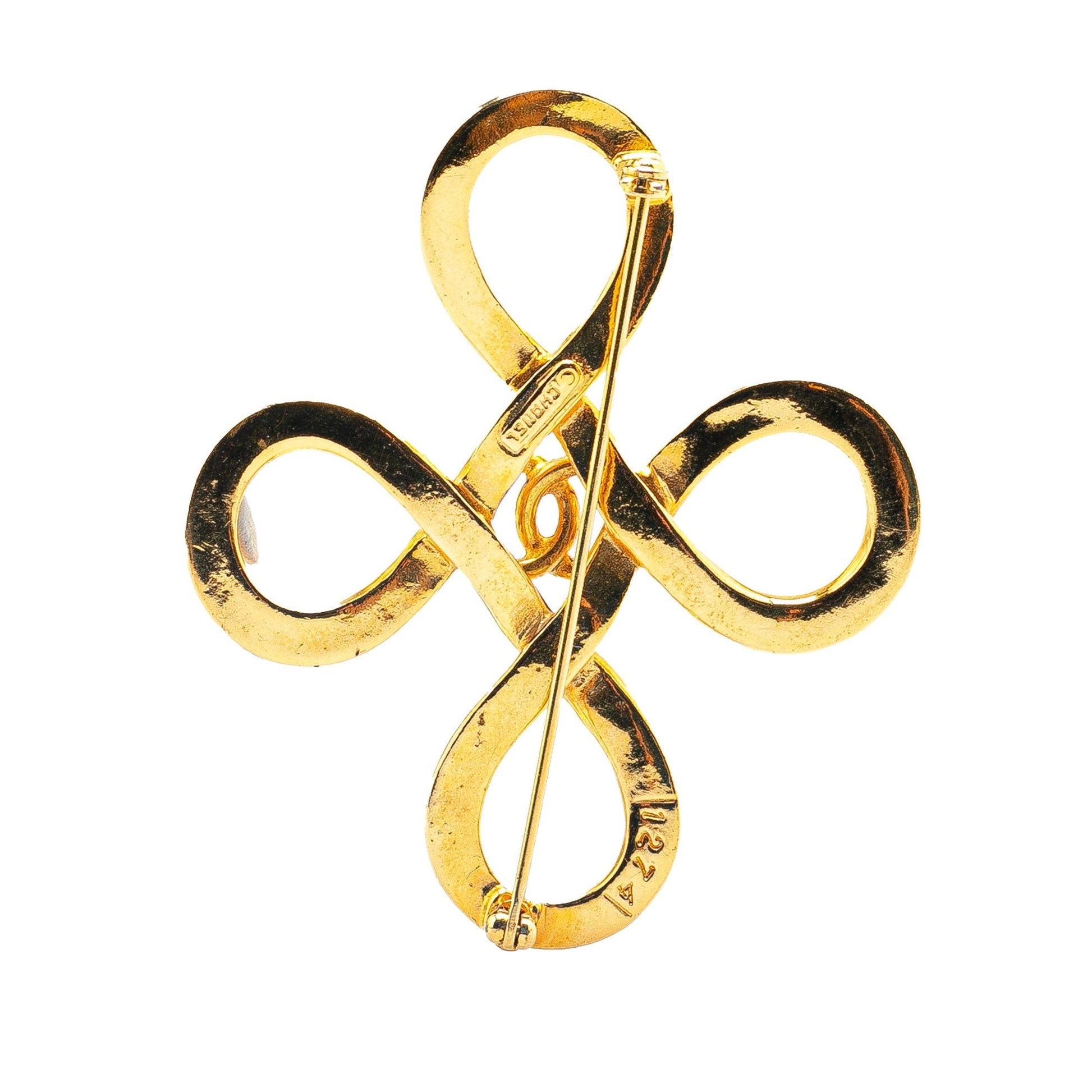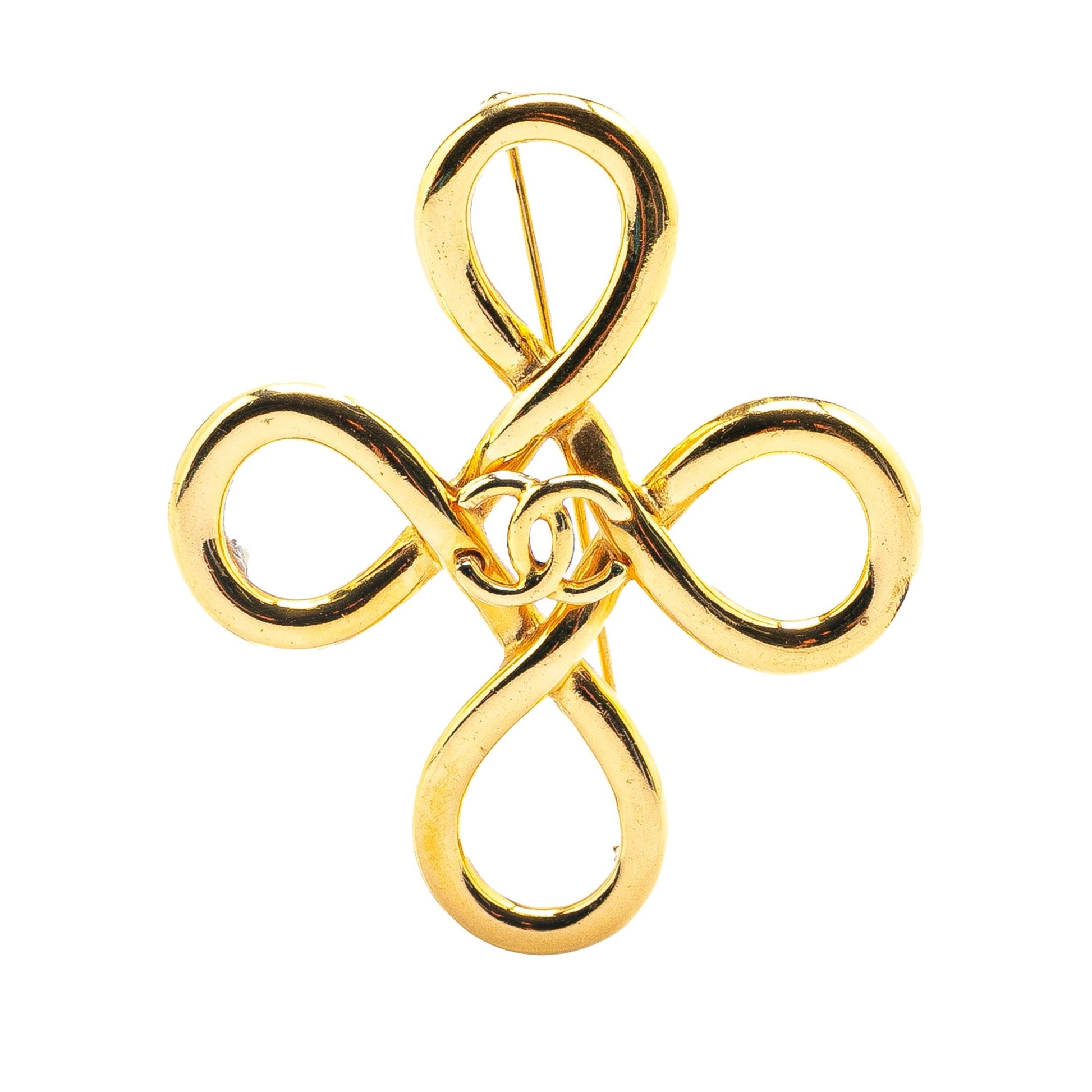 Product Details: Gold Chanel Gold Plated CC Infinity Brooch. This brooch features a gold plated metal body and a back pin closure. 2.4" L x 2" W x 0" D.