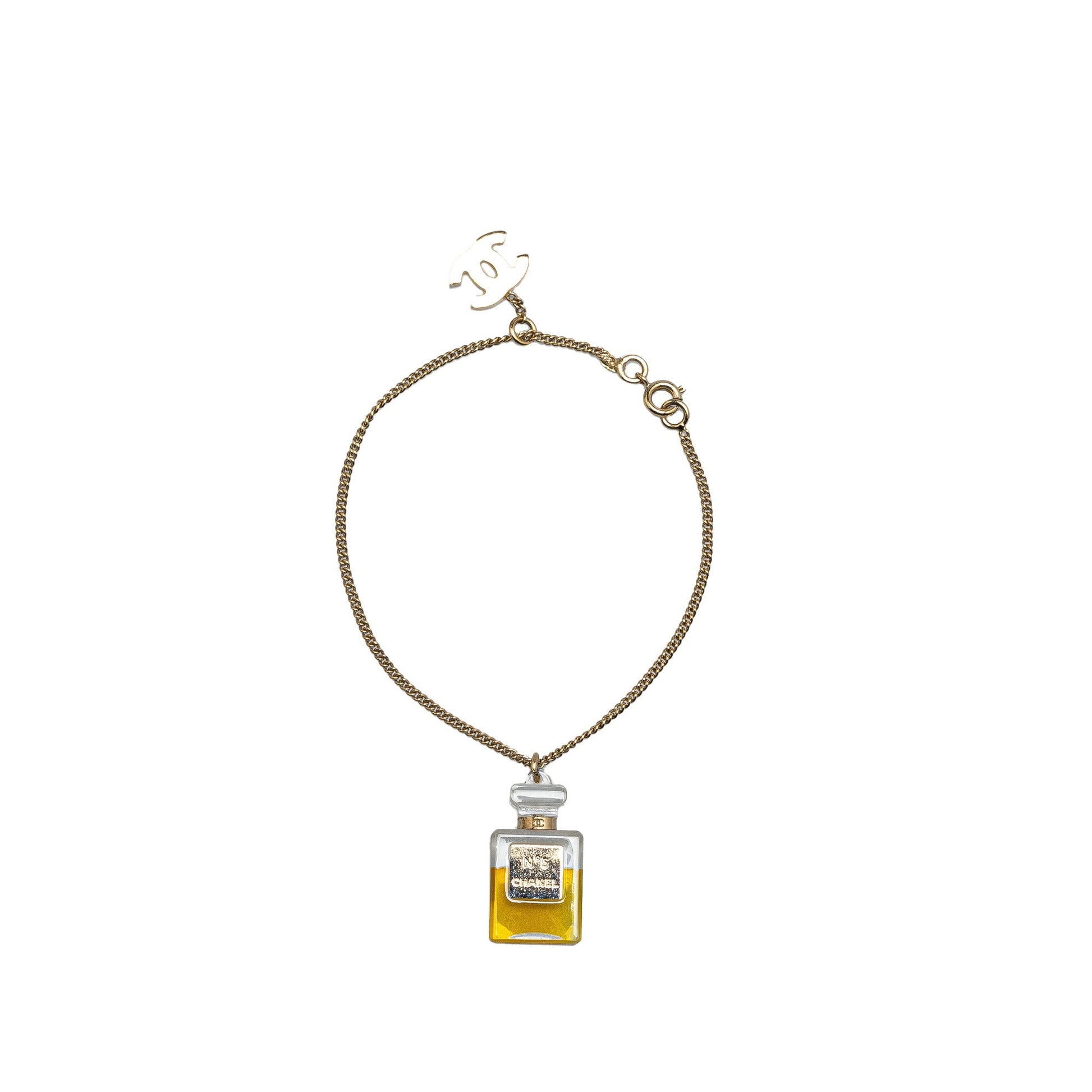 Product Details: Gold Chanel Gold Plated CC No. 5 Perfume Bottle Charm Bracelet. This bracelet features a golden plated chain, a perfume bottle charm, and a spring ring closure. 7.7" L x 0.8" W x 0" D. Serial number 04A.