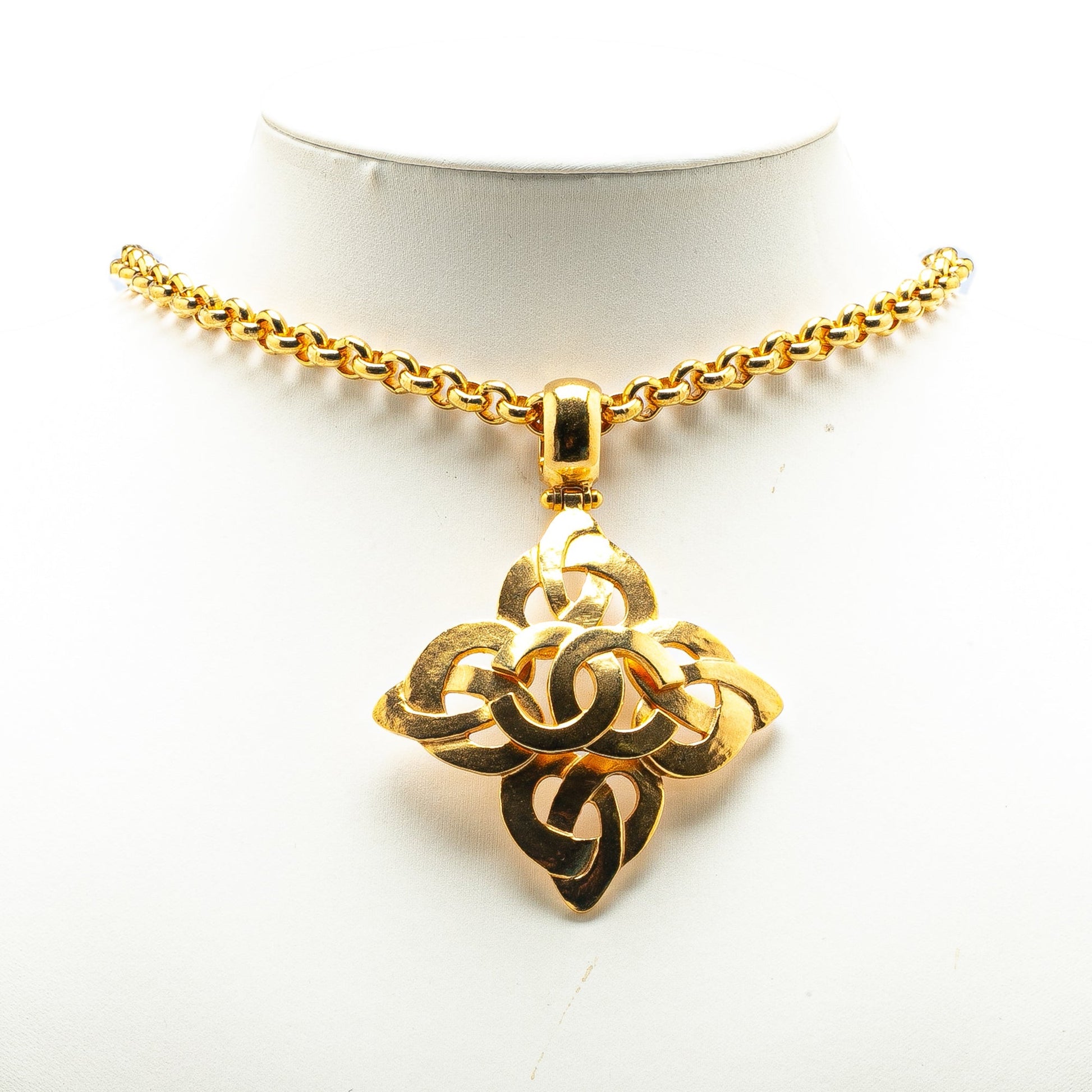 Product Details: Gold Chanel Gold Plated CC Pendant Necklace. This necklace features a gold-tone pendant, a gold-tone chain, and a hook closure. 21.3" L x 2.6" W x 0" D. Serial number 97P.