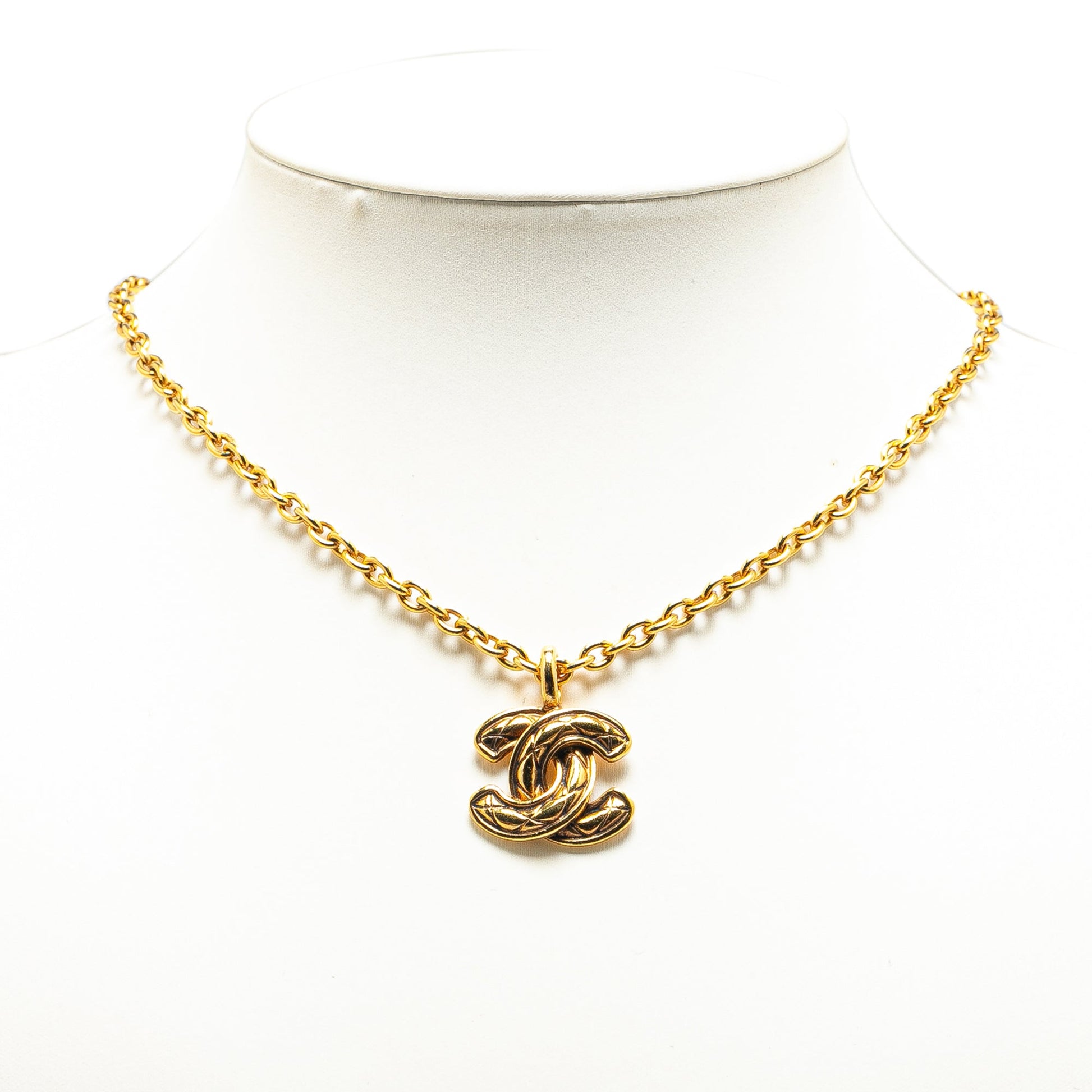Product Details: Gold Chanel Gold Plated CC Pendant Necklace. This necklace features a gold plated metal body and a spring ring closure. 21.3" L x 1.2" W x 0" D.