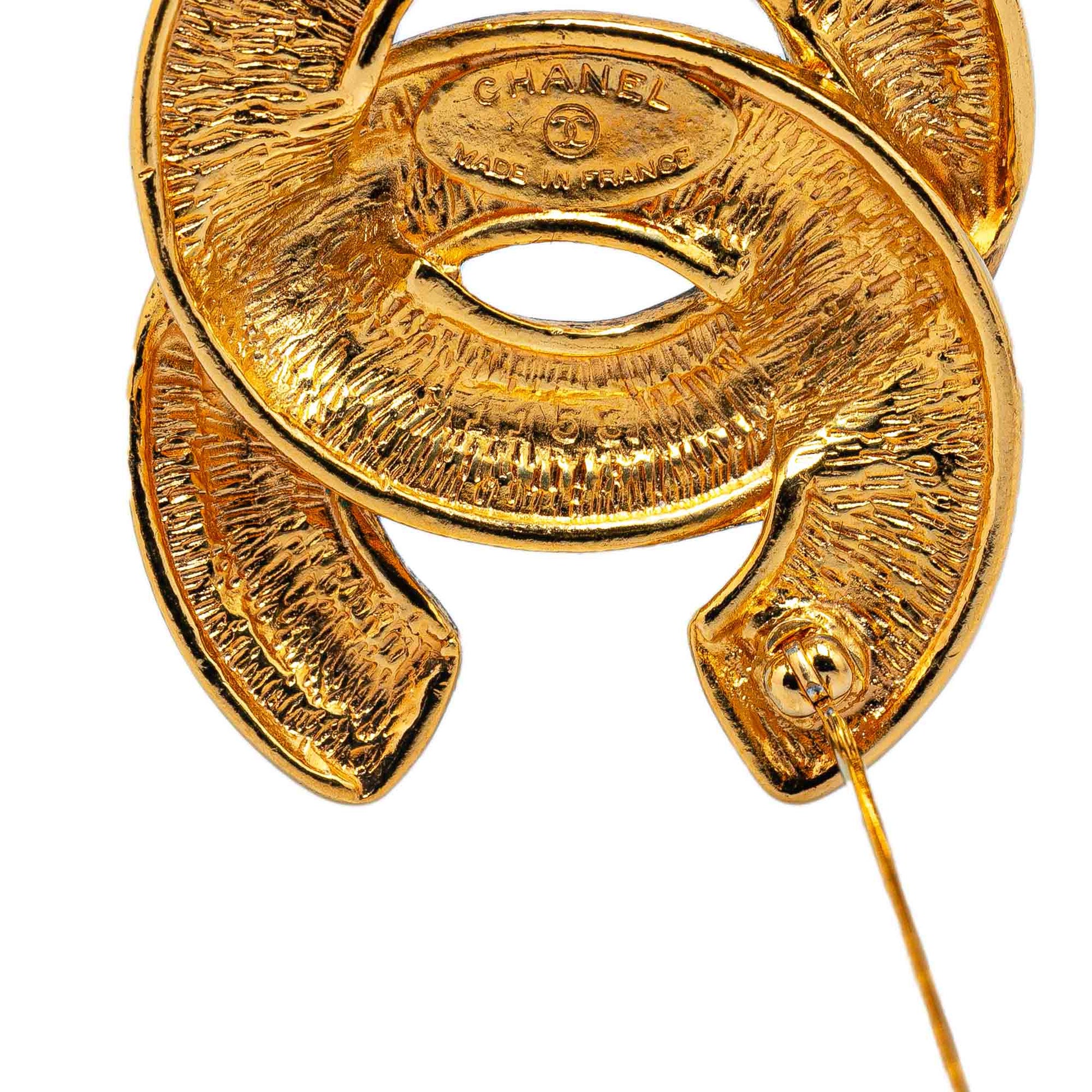 Product Details: Gold Chanel Gold Plated CC Quilted Brooch. This brooch features a gold plated body and a back pin closure. 1.5" L x 1.3" W x 0" D.