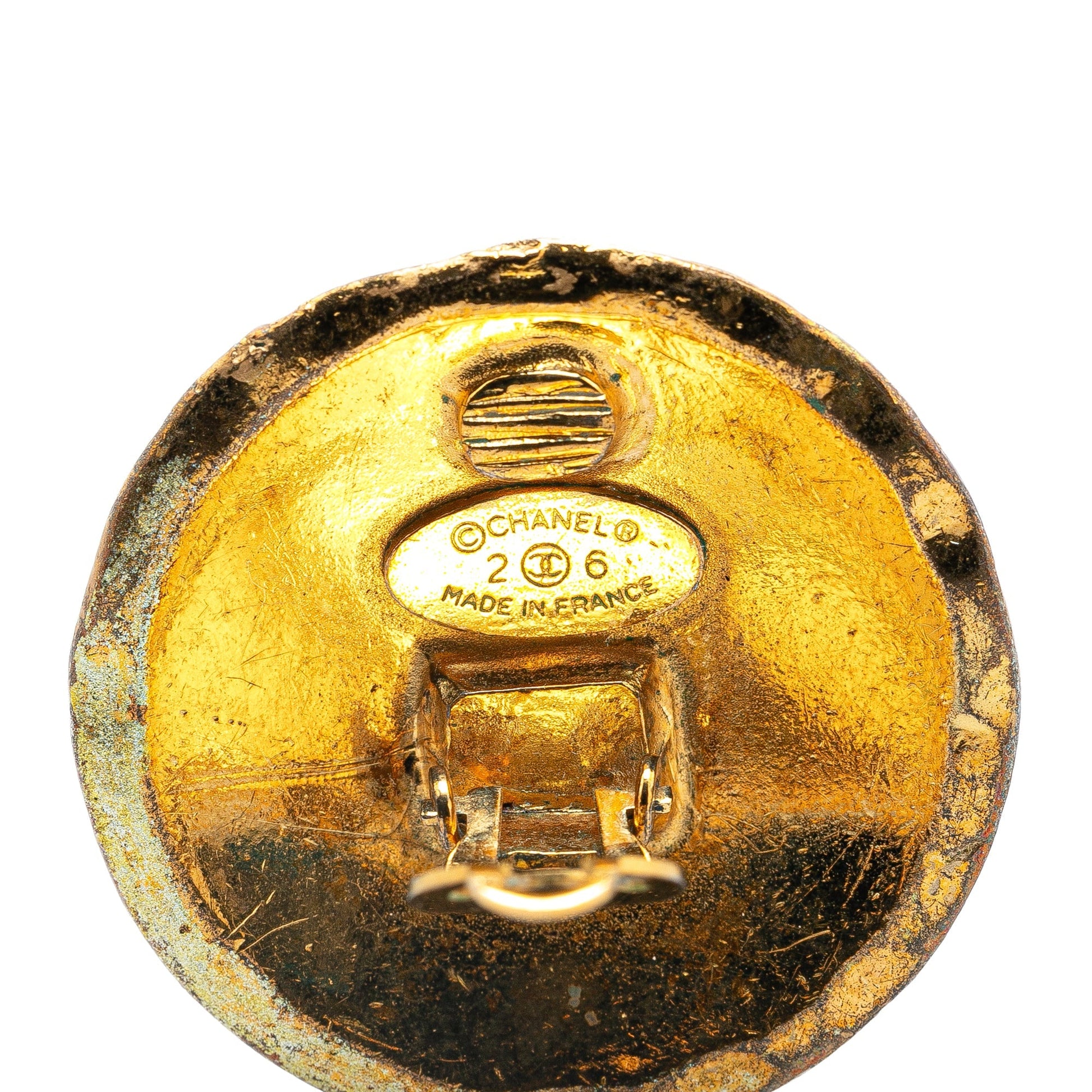 Product Details: Gold Chanel Gold Plated CC Quilted Clip On Earrings. These earrings feature a gold-plated body and a clip-on closure. 1.4" L x 1.4" W x 0" D. Serial number 2_6.
