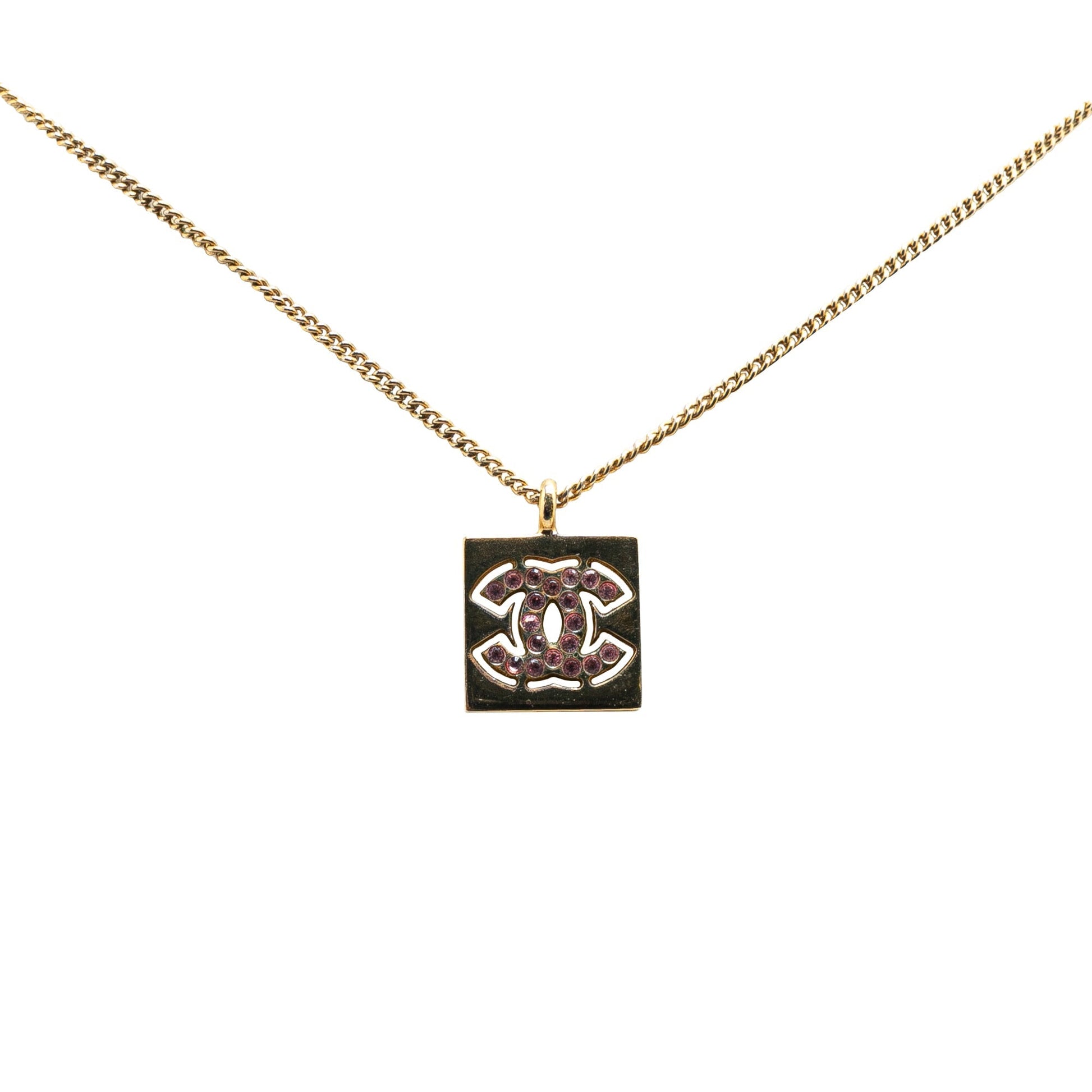 Product Details: Gold Chanel Gold Plated CC Rhinestones Pendant Necklace. This necklace features a gold-tone pendant with rhinestones, a gold-tone chain, and a spring ring closure. 17.1" L x 0.8" W x 0" D. Serial number 02P.