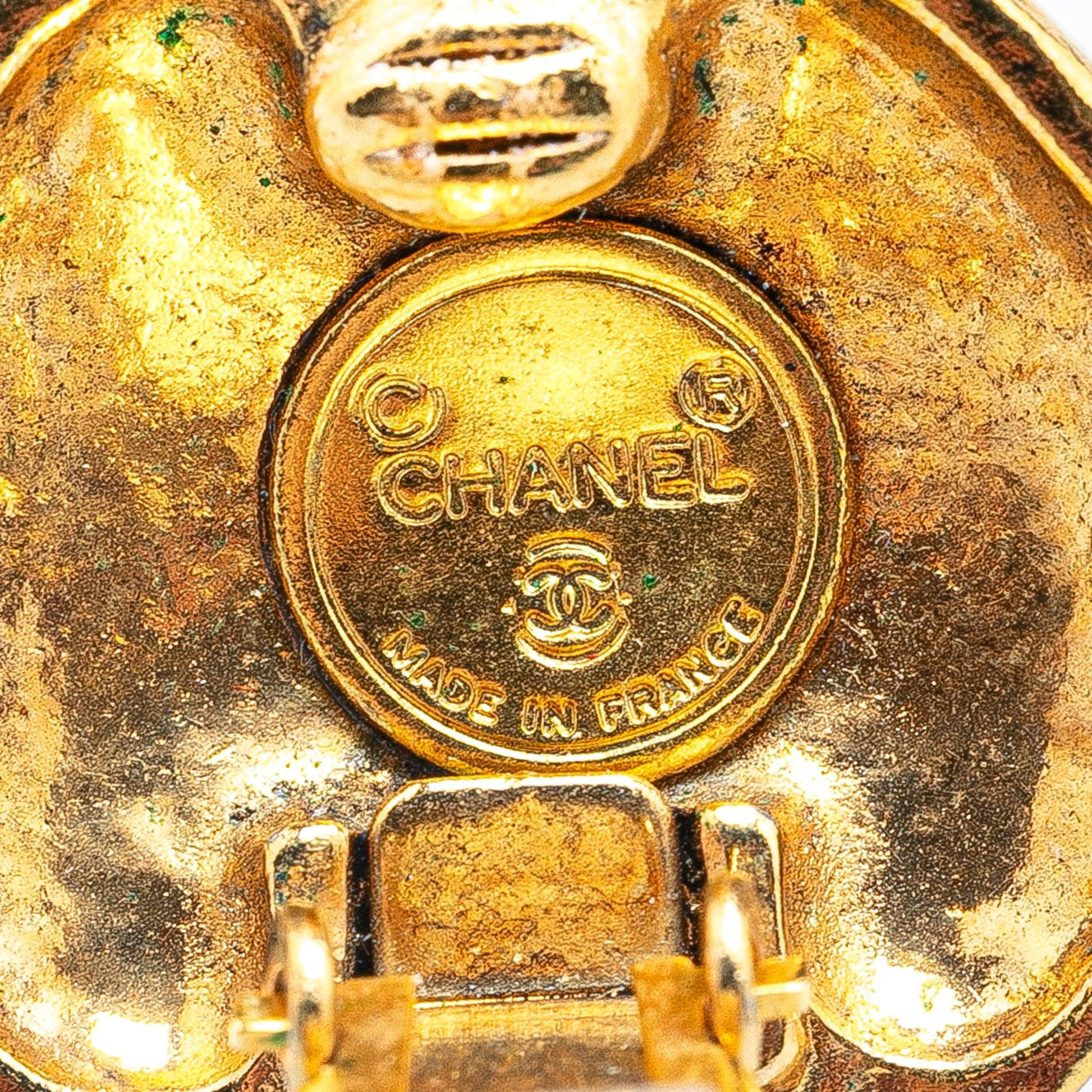 Product Details: Gold Chanel Gold Plated CC Round Clip on Earrings. These earrings feature a gold-plated body and clip-on closure. 1" L x 1" W x 0" D.