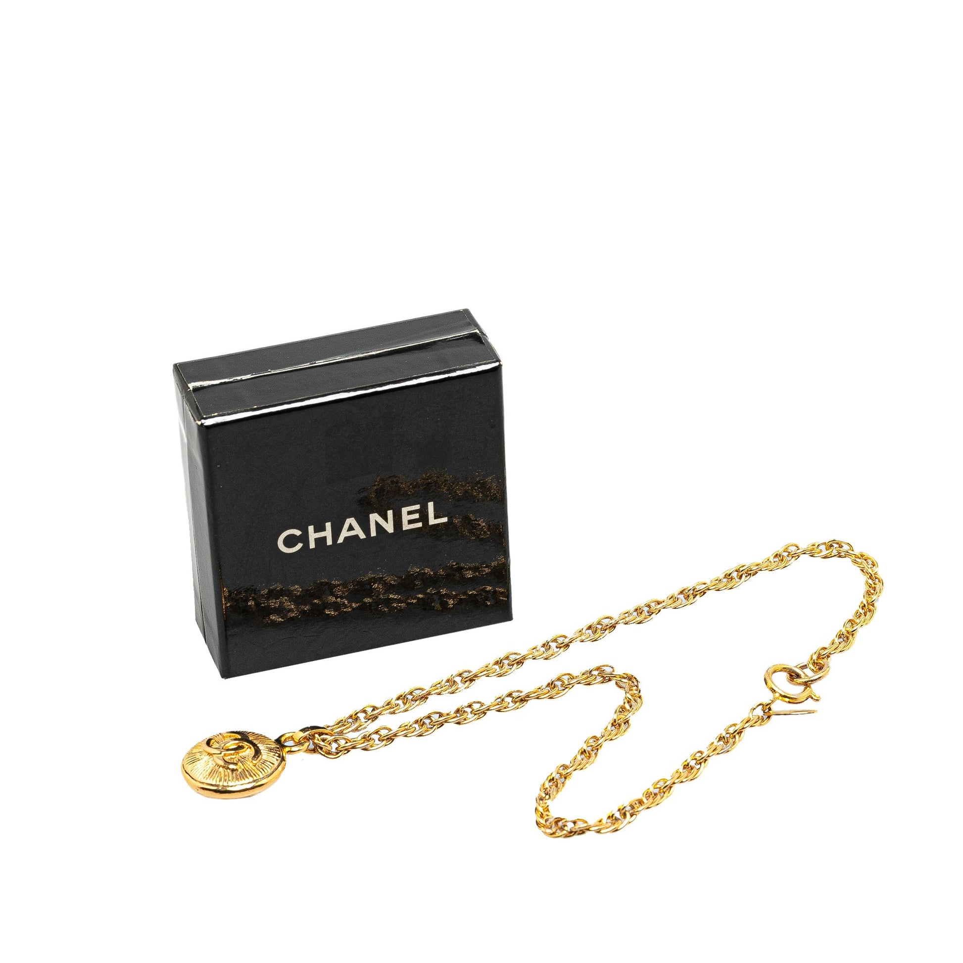 Product Details: Gold Chanel Gold Plated CC Round Pendant Necklace. This necklace features a gold-tone pendant, a gold-tone chain, and a spring ring closure. 14.8" L x 1.1" W x 0" D.