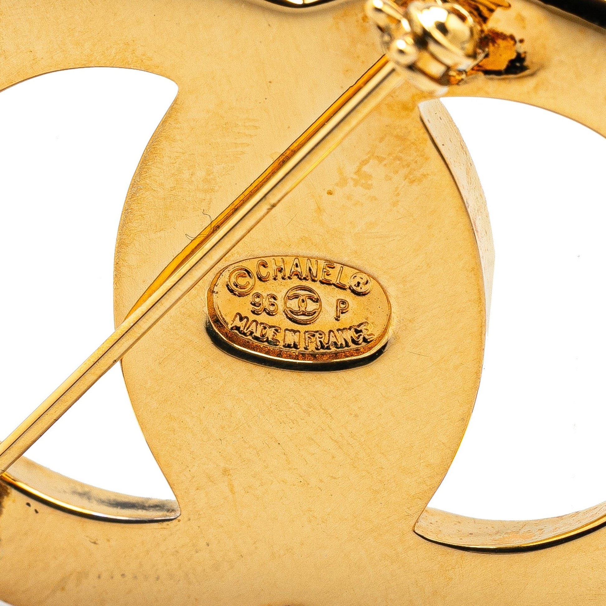 Product Details: Gold Chanel Gold Plated CC Turn-Lock Brooch. This brooch features a metal body and a back pin closure. 1.2" L x 1.6" W x 0" D. Serial number 96P.