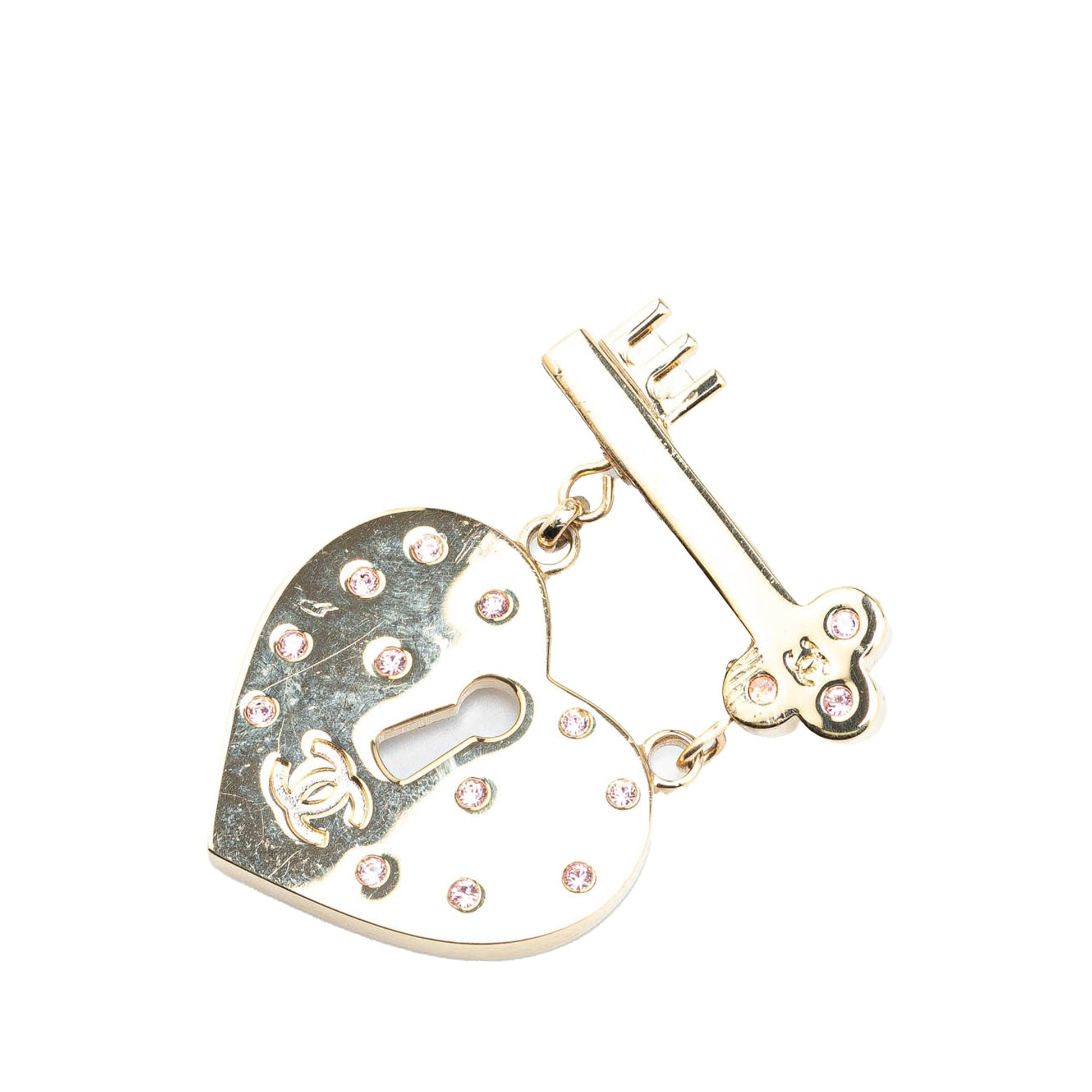 Product Details: Gold Chanel Gold Plated Heart Lock and Key Brooch Pin. This brooch features a gold-plated metal body, rhinestone embellishments, and a back pin closure. 2.4" L x 1.8" W x 0" D. Serial number 02P.