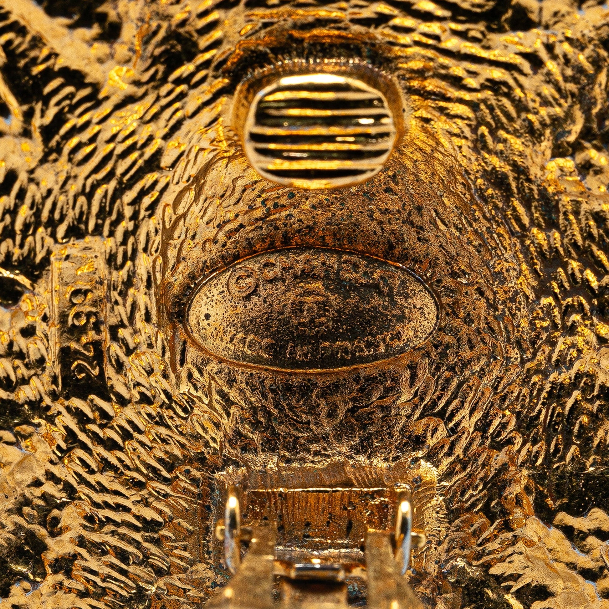 Product Details: Gold Chanel Gold Plated Lion Motif Clip On Earrings. These earrings feature a gold-plated body and clip-on closure. 1.8" L x 1.8" W x 0" D.