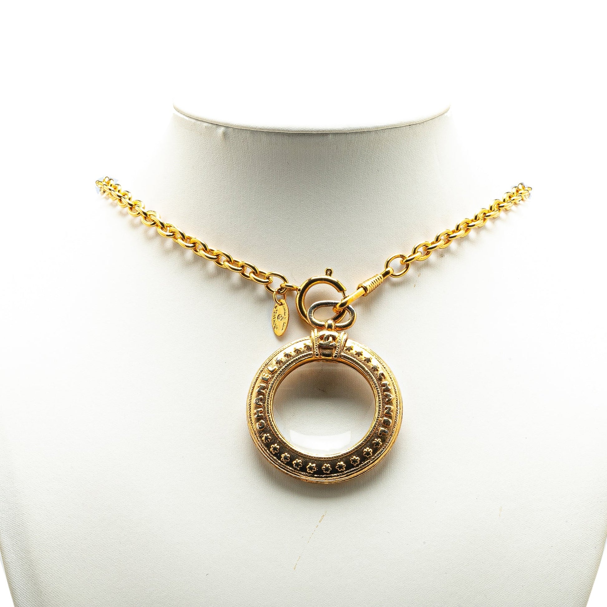 Product Details: Gold Chanel Gold Plated Logo Loupe Magnifying Glass Pendant Necklace. This necklace features a gold tone metal body, a pendant with magnifying glass, and a spring ring closure. 33.7" L x 2.4" W x 0" D.