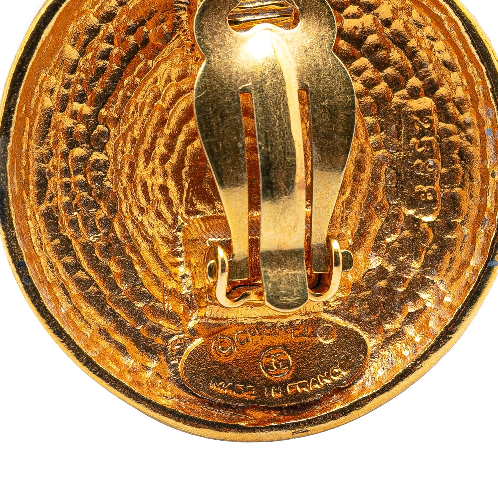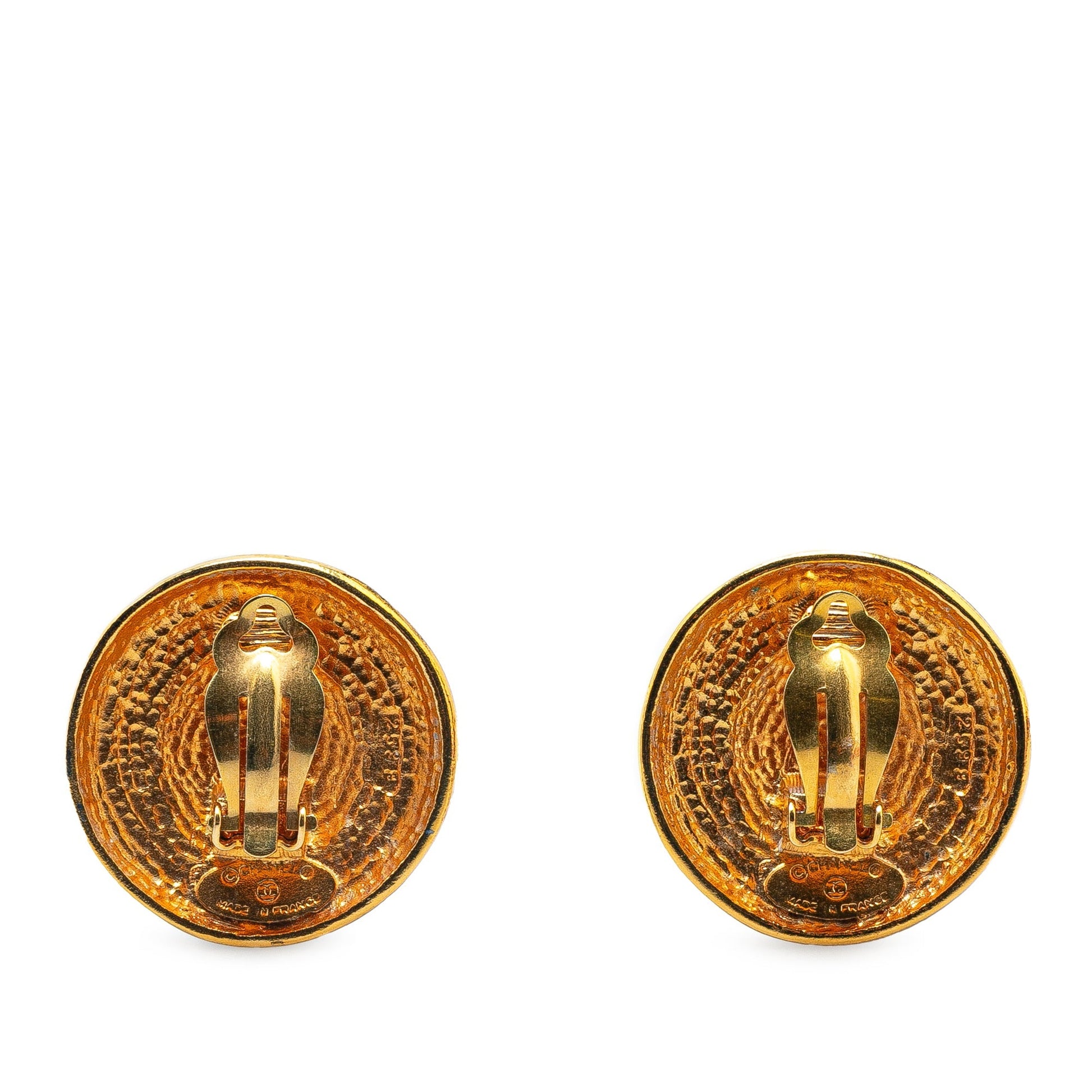 Product Details: Gold Chanel Gold Plated Stars Round Clip on Earrings. These earrings feature a gold-plated body and clip-on closure. 1.3" L x 1.3" W x 0" D.