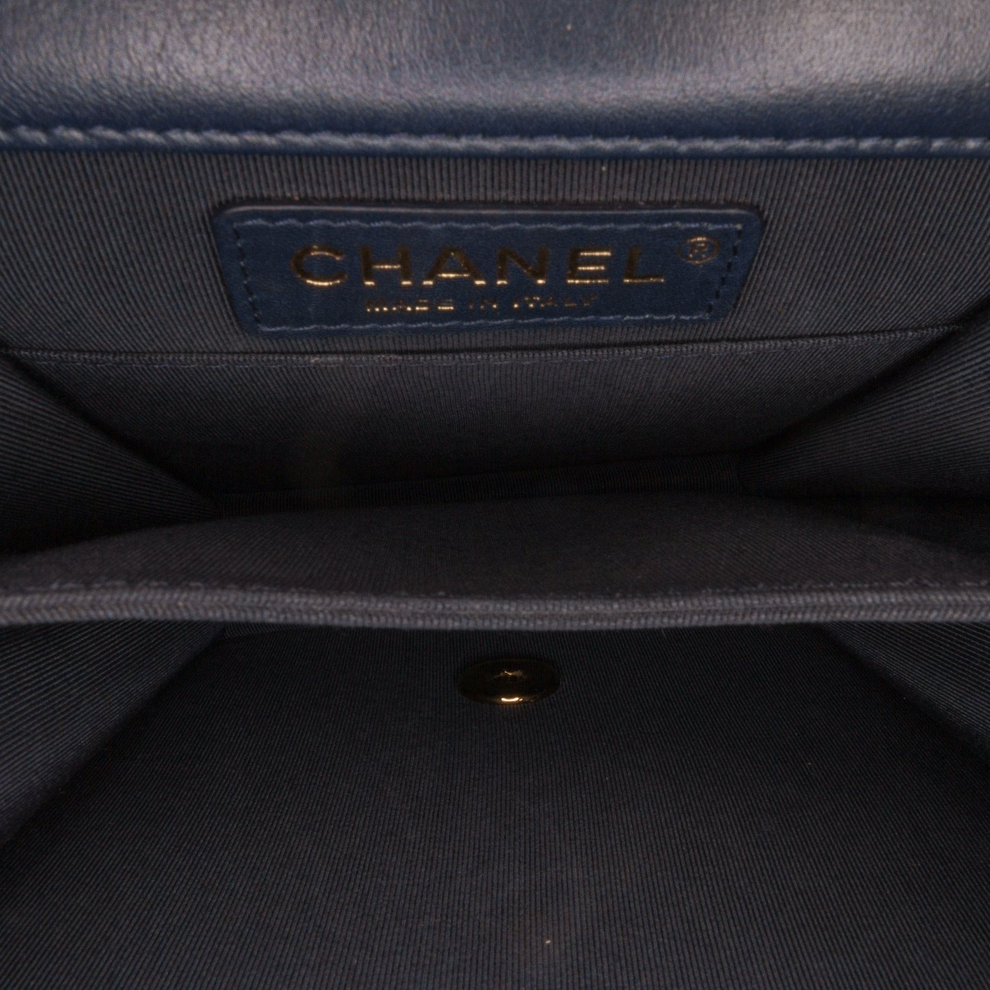 Product Details: Gold Chanel Paris-New York North South Boy Flap Crossbody Bag. This crossbody bag features a leather body, a front flap with a CC push-lock closure, a curb chain strap, and an interior slip pocket. 6.3" L x 7.9" W x 2" D. Serial number 28267997.
