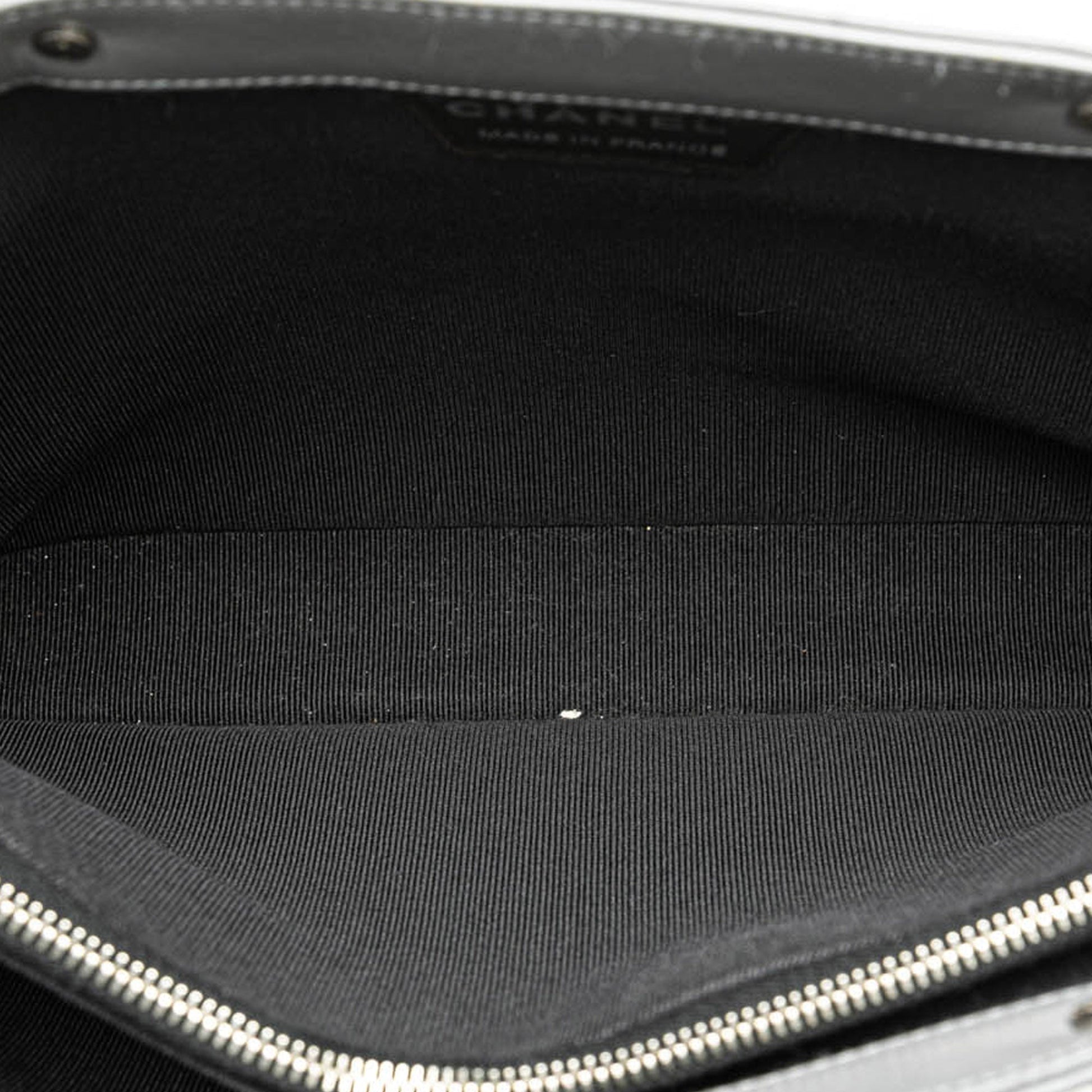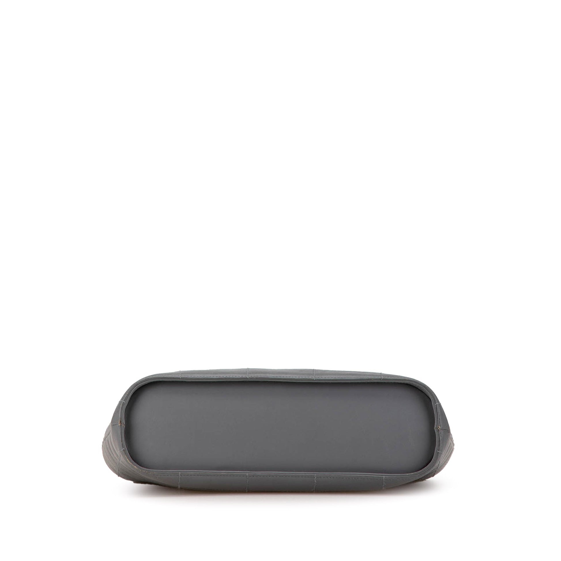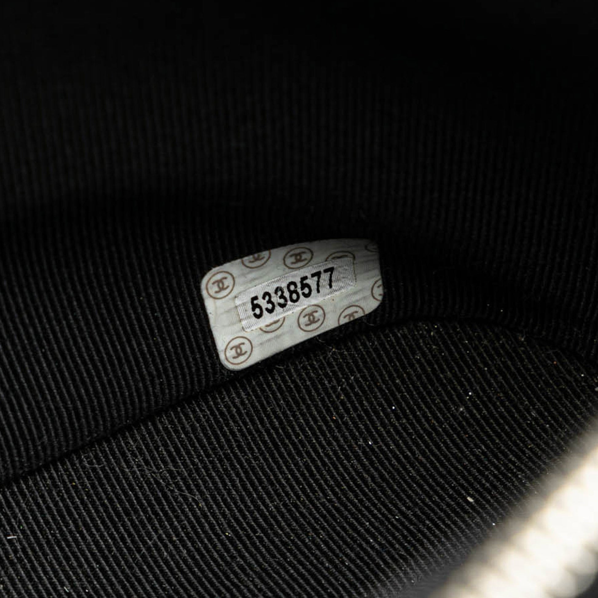 Product Details: Gray Chanel Chocolate Bar Lambskin Tote. This tote features a lambskin body, metal handles, an open top, an interior zip compartment, and an interior slip pocket. 7.5" L x 10.6" W x 3.1" D, 3.1" drop. Serial number 5338577.