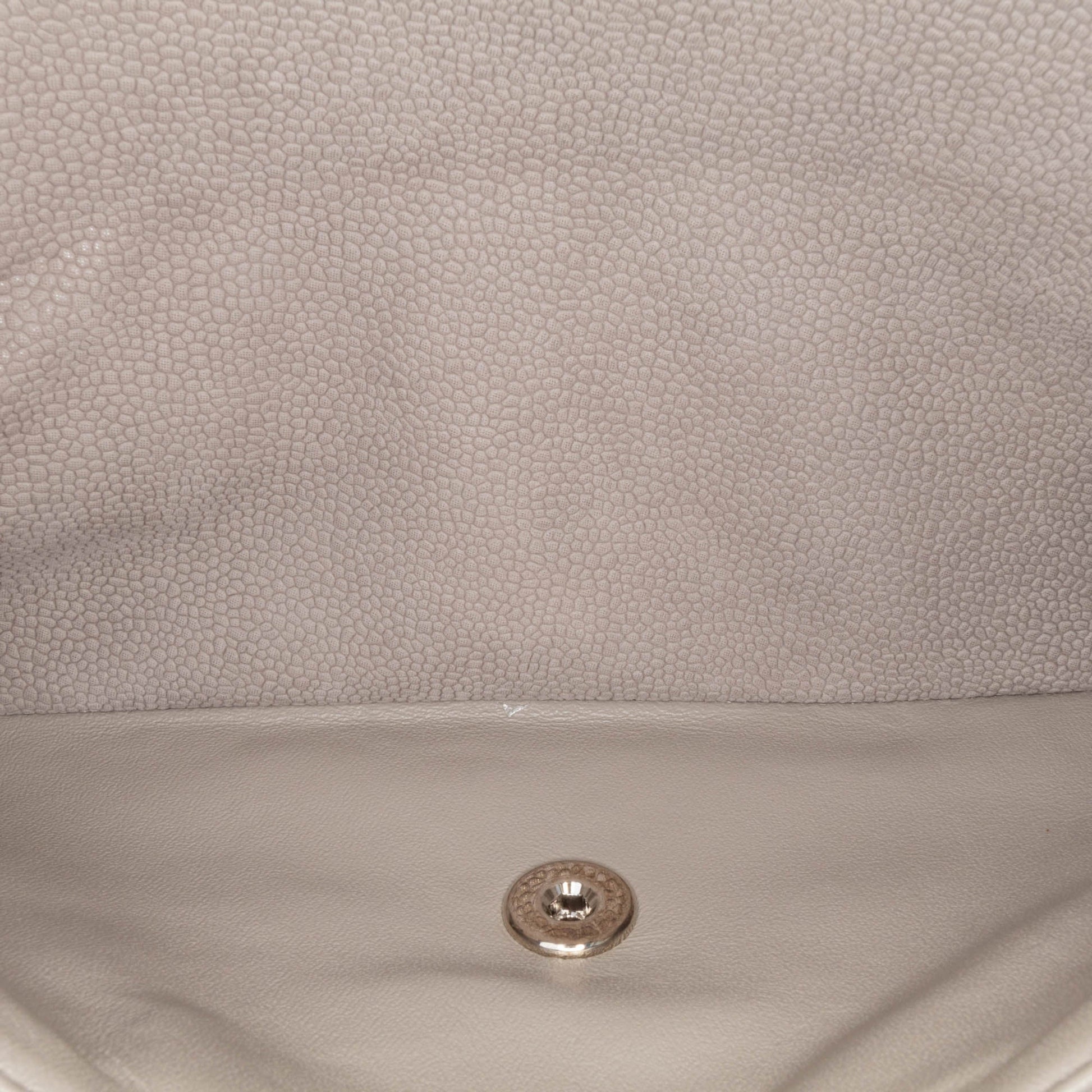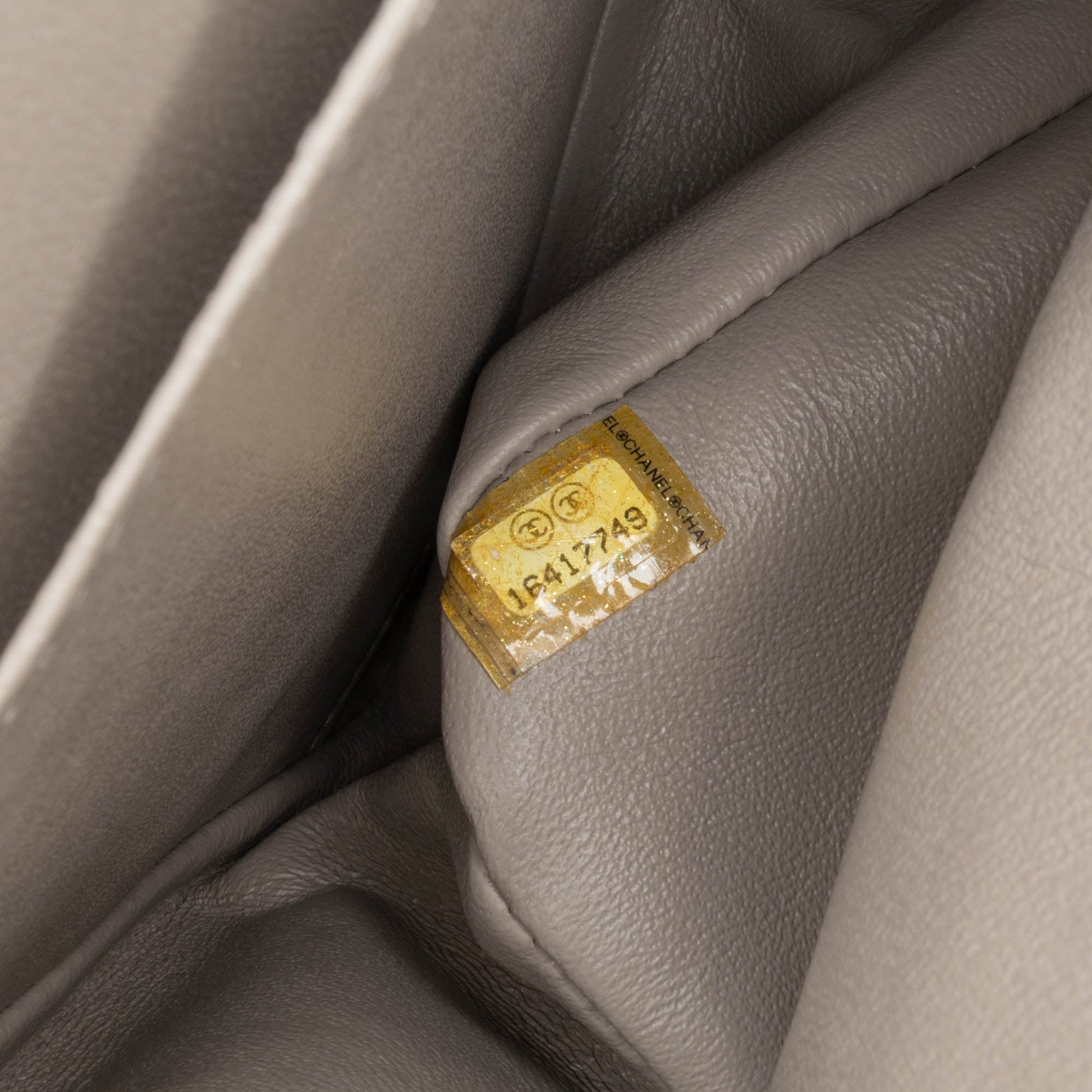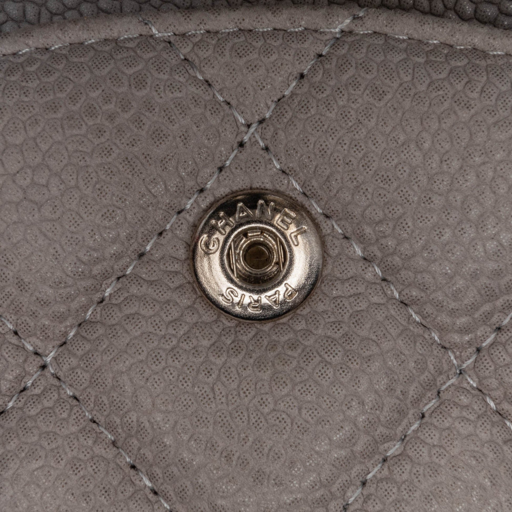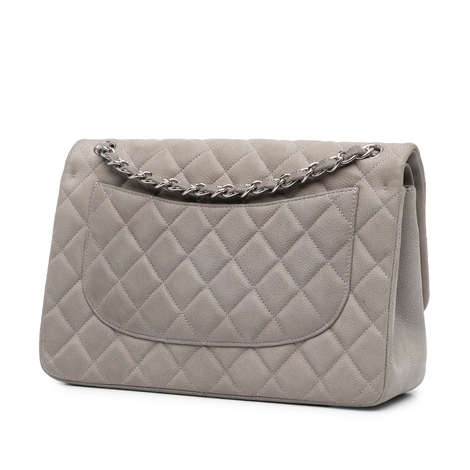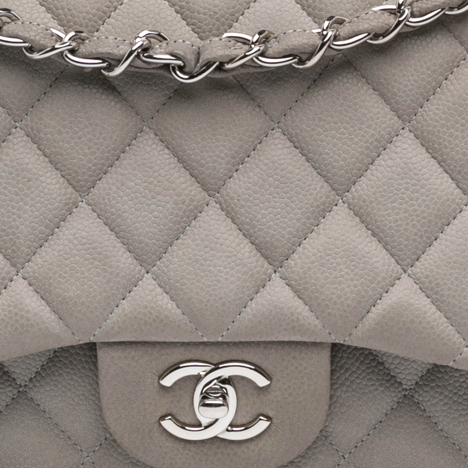 Product Details: Gray Chanel Jumbo Classic Caviar Double Flap Shoulder Bag. This shoulder bag features a quilted caviar leather body, leather woven chain straps, a double top flap with CC turn-lock closure, an exterior back slip pocket, and interior zip and slip pockets. 7.9" L x 11.8" W x 3.5" D, 13.4" drop. Serial number 16417749.