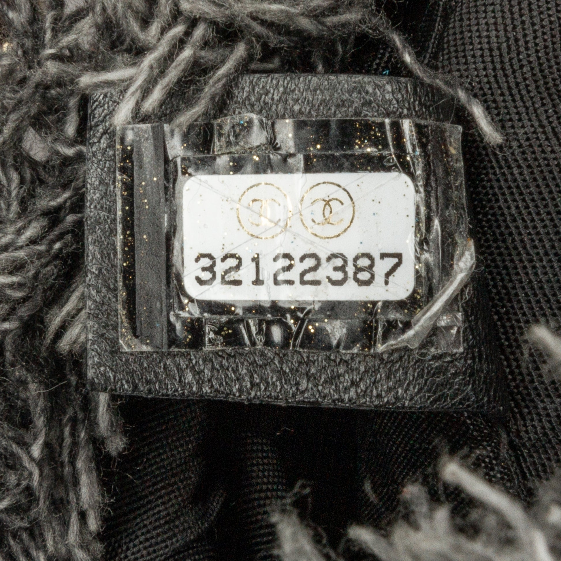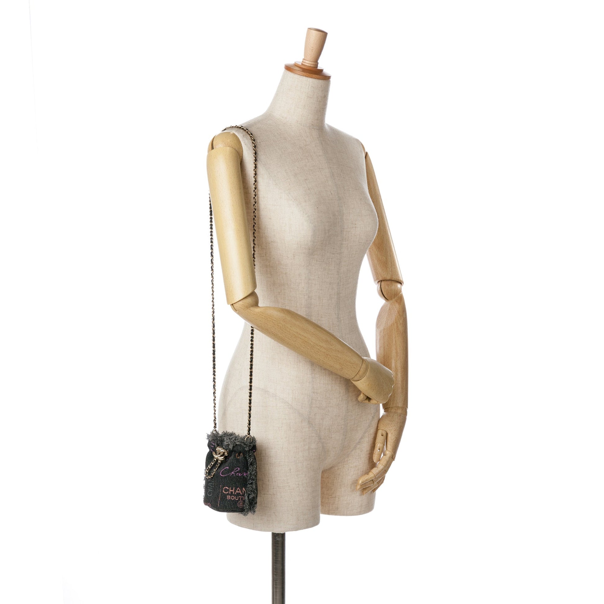 Product Details: Gray Chanel Mini Denim Mood Bucket with Chain. This bucket bag features a quilted denim body, a chain link shoulder strap, and a drawstring chain link with CC embellishment closure. 4.7" L x 5.5" W x 2.4" D. Serial number 32122387.