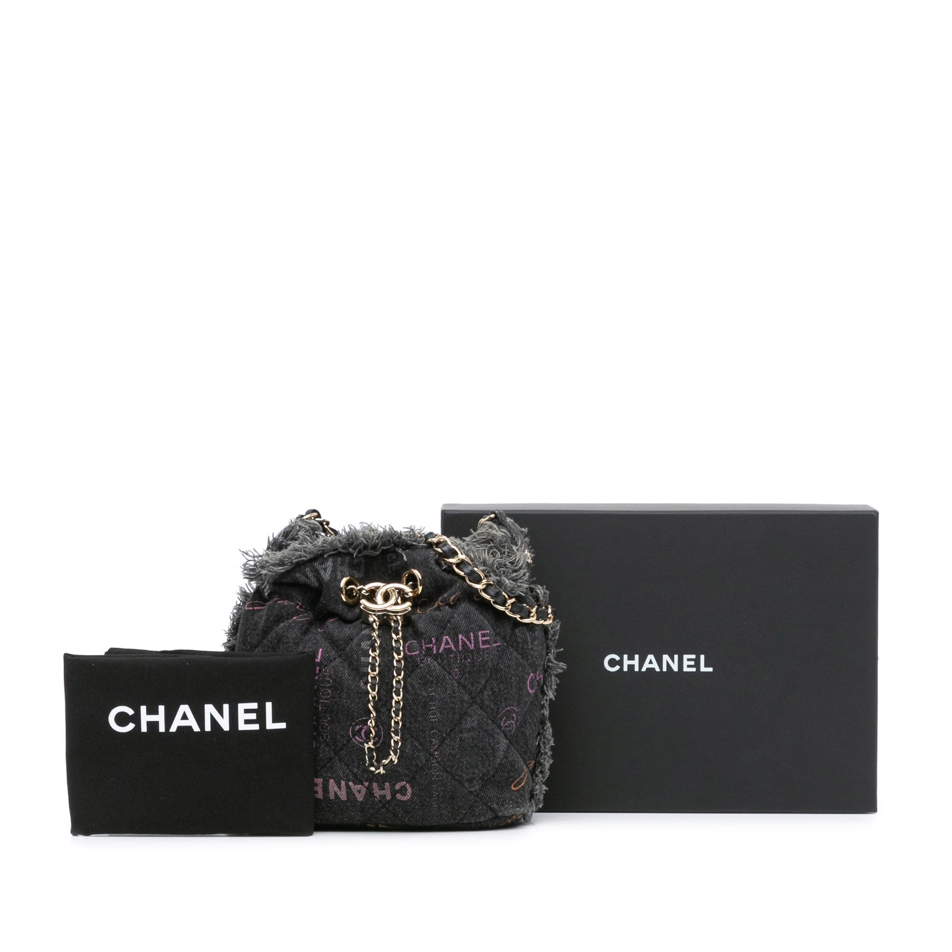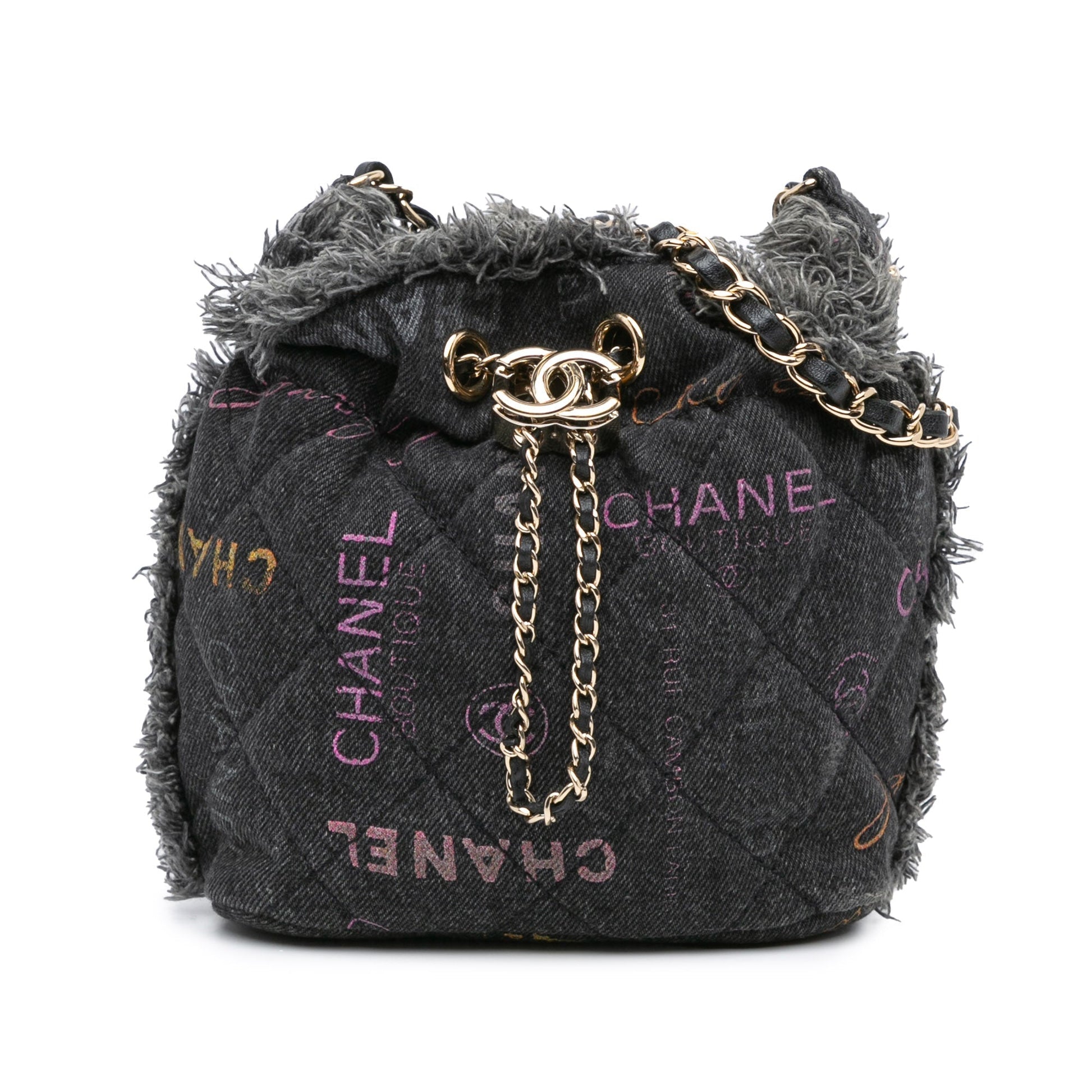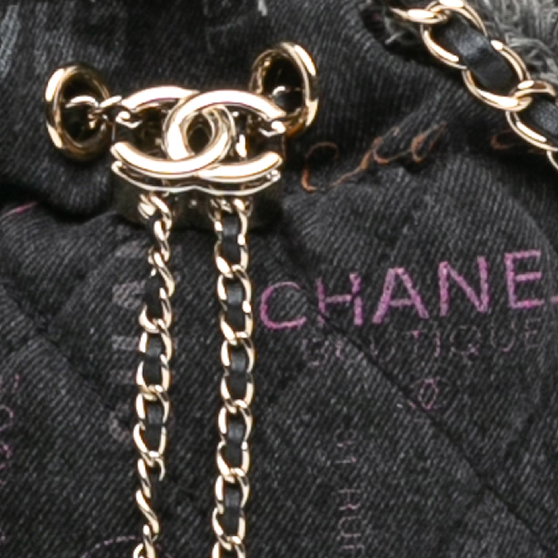 Product Details: Gray Chanel Small Denim Mood Bucket with Chain. This bucket bag features a quilted denim body, a leather woven chain shoulder strap, a drawstring chain link with CC embellishment closure, and an interior slip pocket. 7.1" L x 8.7" W x 3.1" D. Serial number ANHGU438.