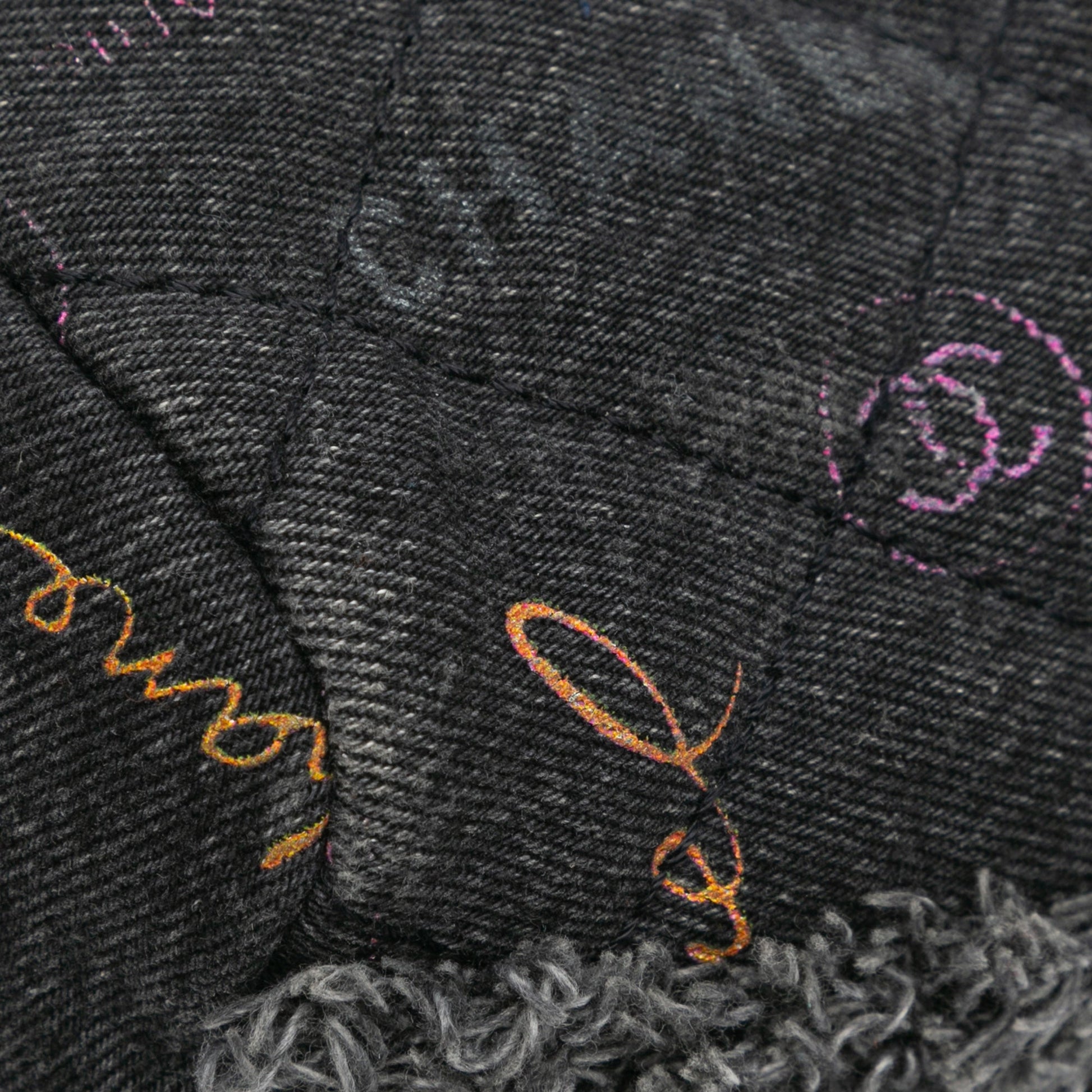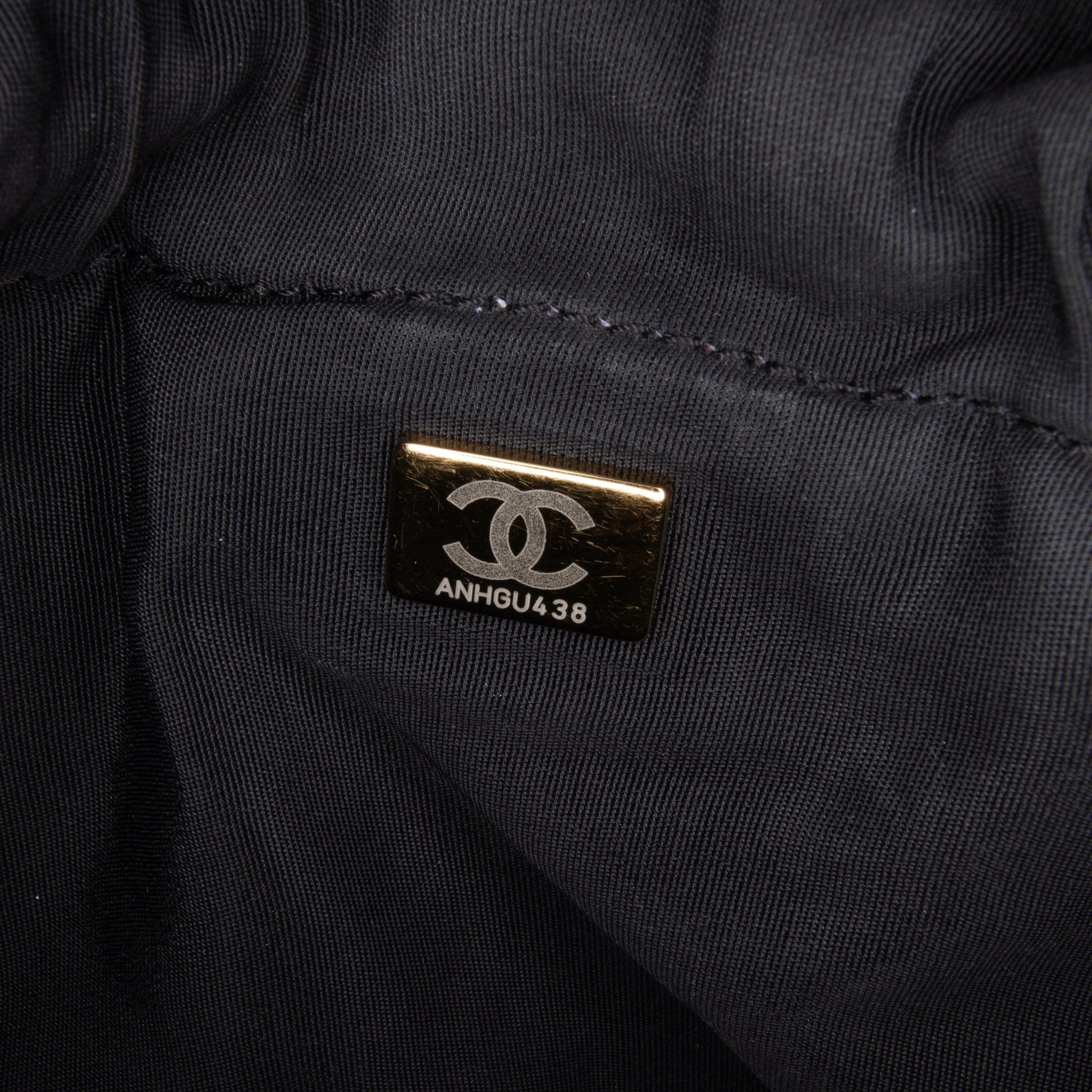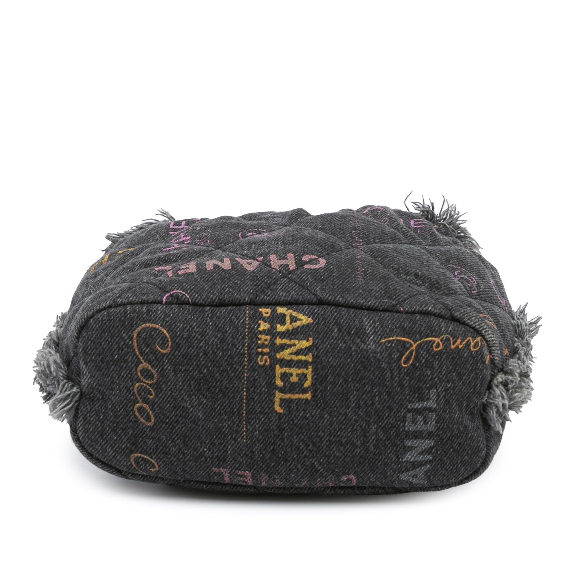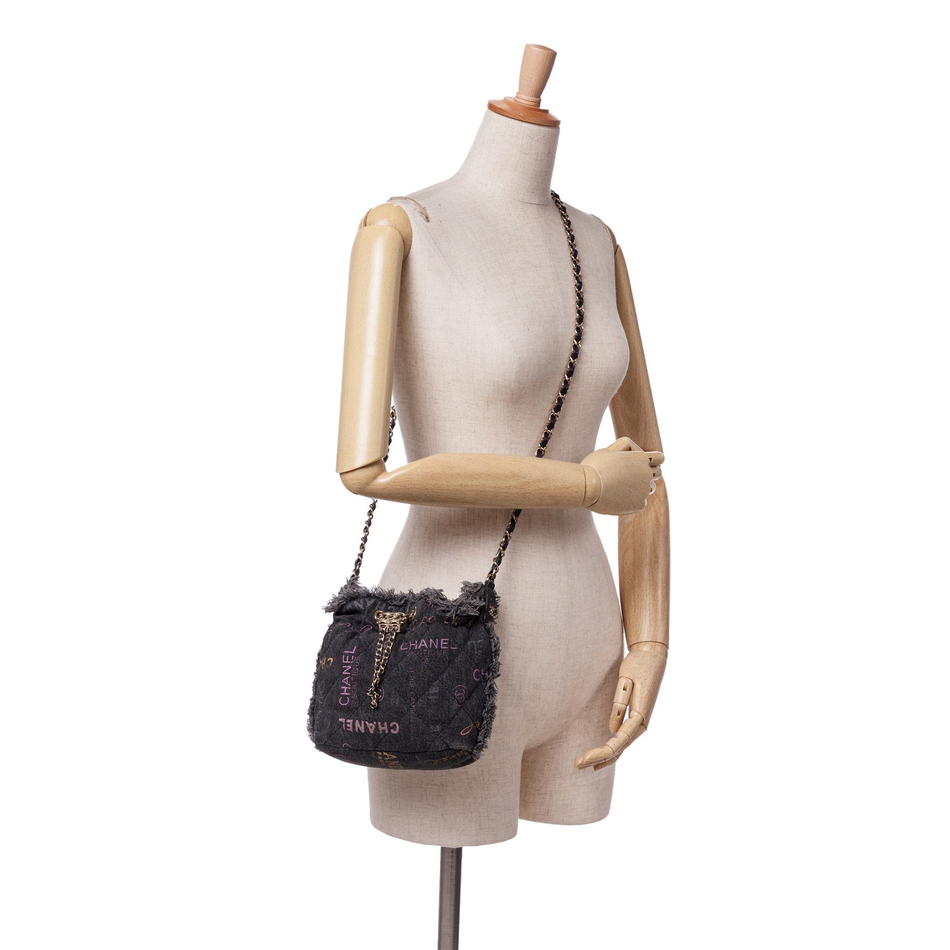 Product Details: Gray Chanel Small Denim Mood Bucket with Chain. This bucket bag features a quilted denim body, a leather woven chain shoulder strap, a drawstring chain link with CC embellishment closure, and an interior slip pocket. 7.1" L x 8.7" W x 3.1" D. Serial number ANHGU438.