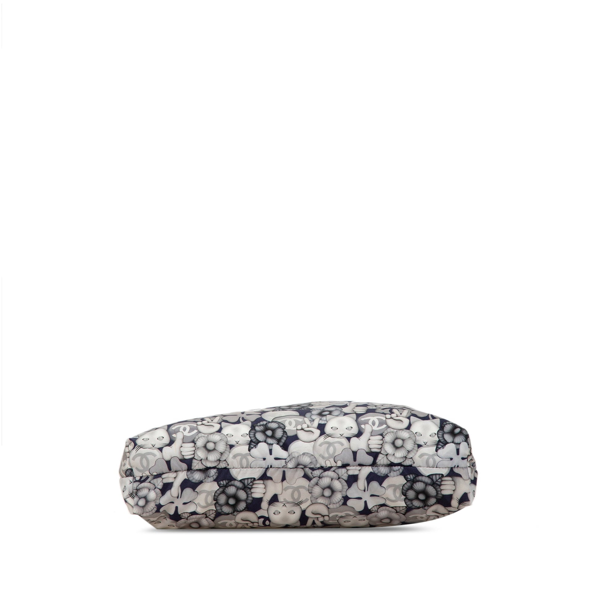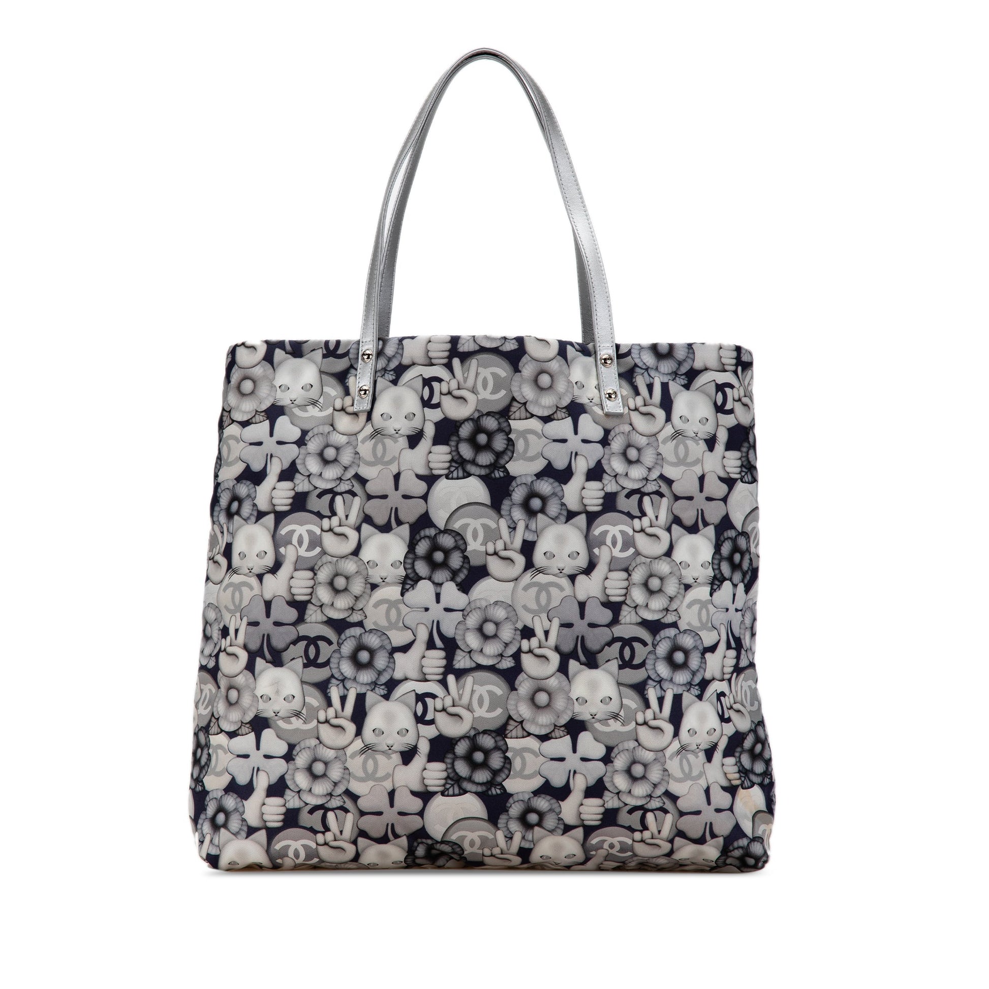 Product Details: Gray Chanel Small Nylon Cat Emoticon Shopping Tote. This tote features a printed nylon body, dual flat leather shoulder straps, quilted nylon lining, an open top, and an interior zip pouch. 13.8" L x 14.2" W x 3.1" D, 7.5" drop. Serial number 23418630.