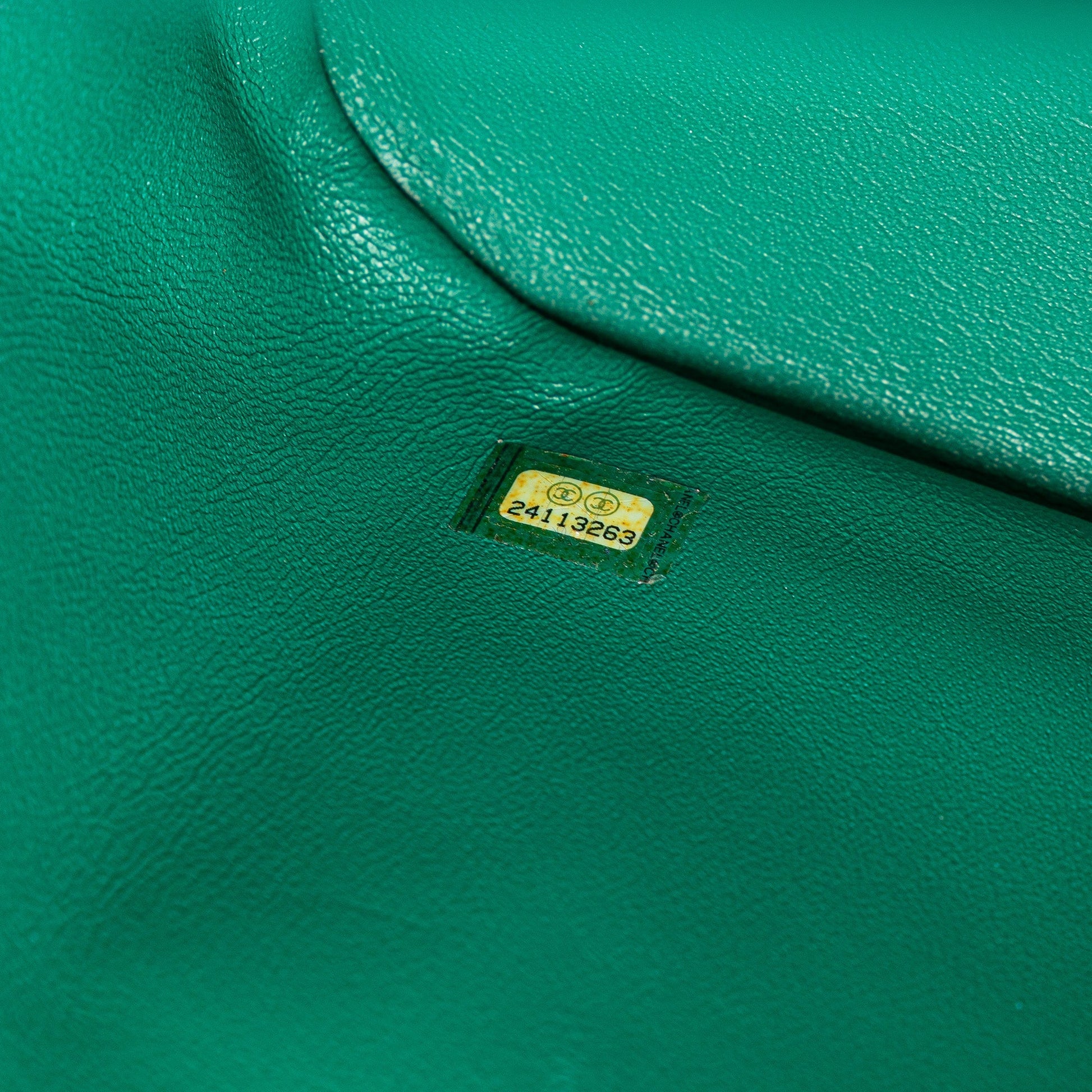 Product Details: Green Chanel Caviar Business Affinity Backpack. The Business Affinity backpack features a caviar leather body, a leather woven chain top handle, flat leather back straps, a top flap with double Cs and a twist lock closure, exterior zip and slip pockets, and an interior zip pocket. 10.2" L x 9.1" W x 5.9" D, 2.8" drop. Serial number 24113263.
