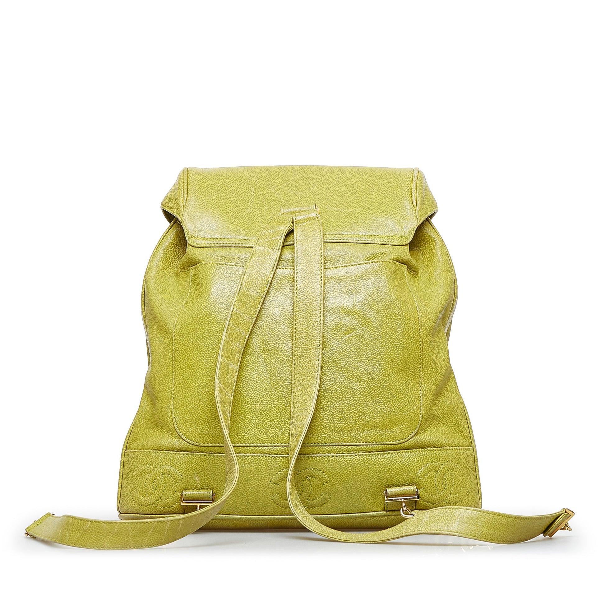Product Details: Green Chanel Caviar Triple CC Backpack. This backpack features a caviar leather body, flat leather straps, top flap with gold-tone interlocking Cs and twist lock closure, and interior zip pockets. 13" L x 13.4" W x 3.5" D. Serial number 4055889.