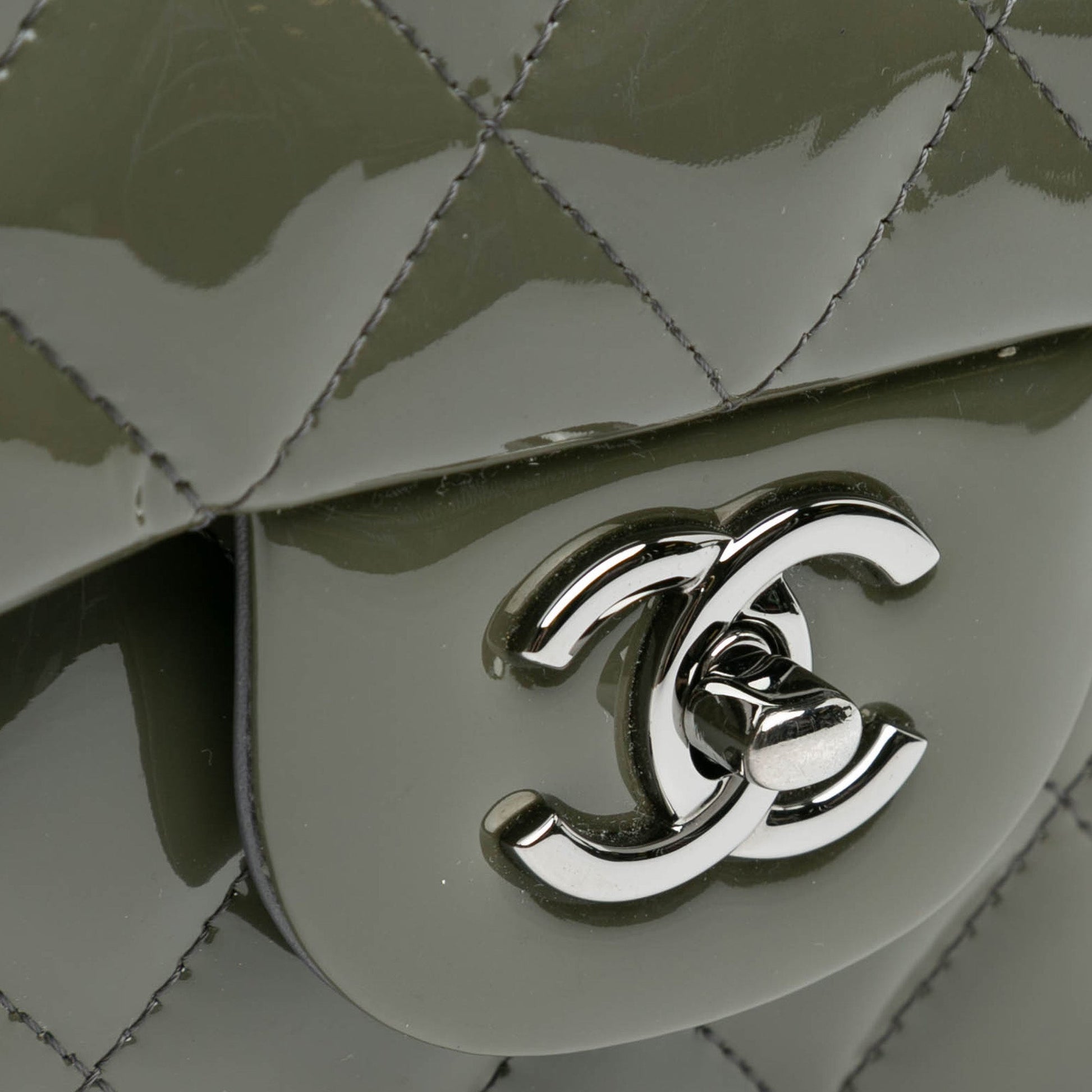 Please note this is a item that may display signs of wear consistent with the condition listed above and shown in photos. Designer Revival this is an Green Chanel Jumbo Classic Patent Double Flap Shoulder Bag or . .