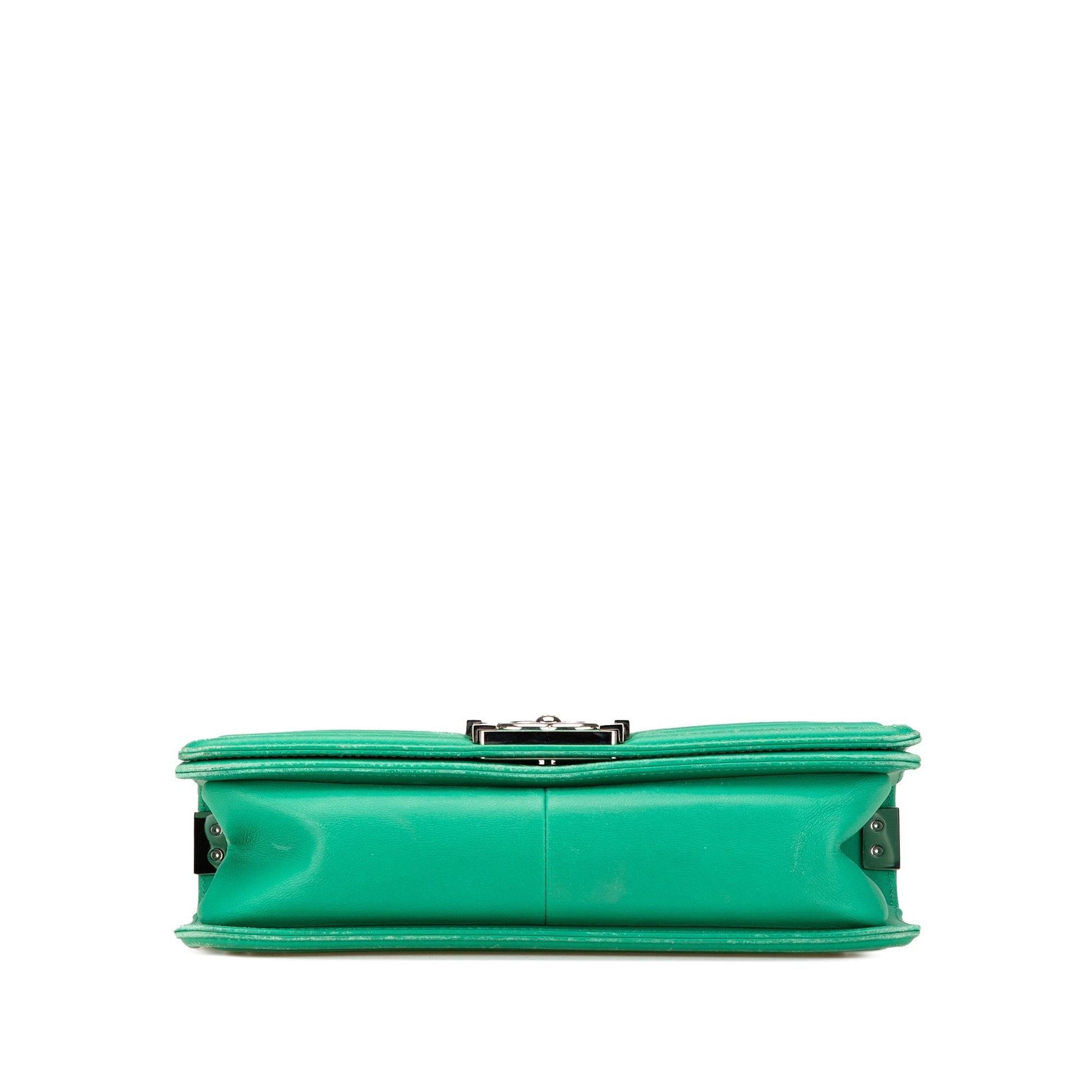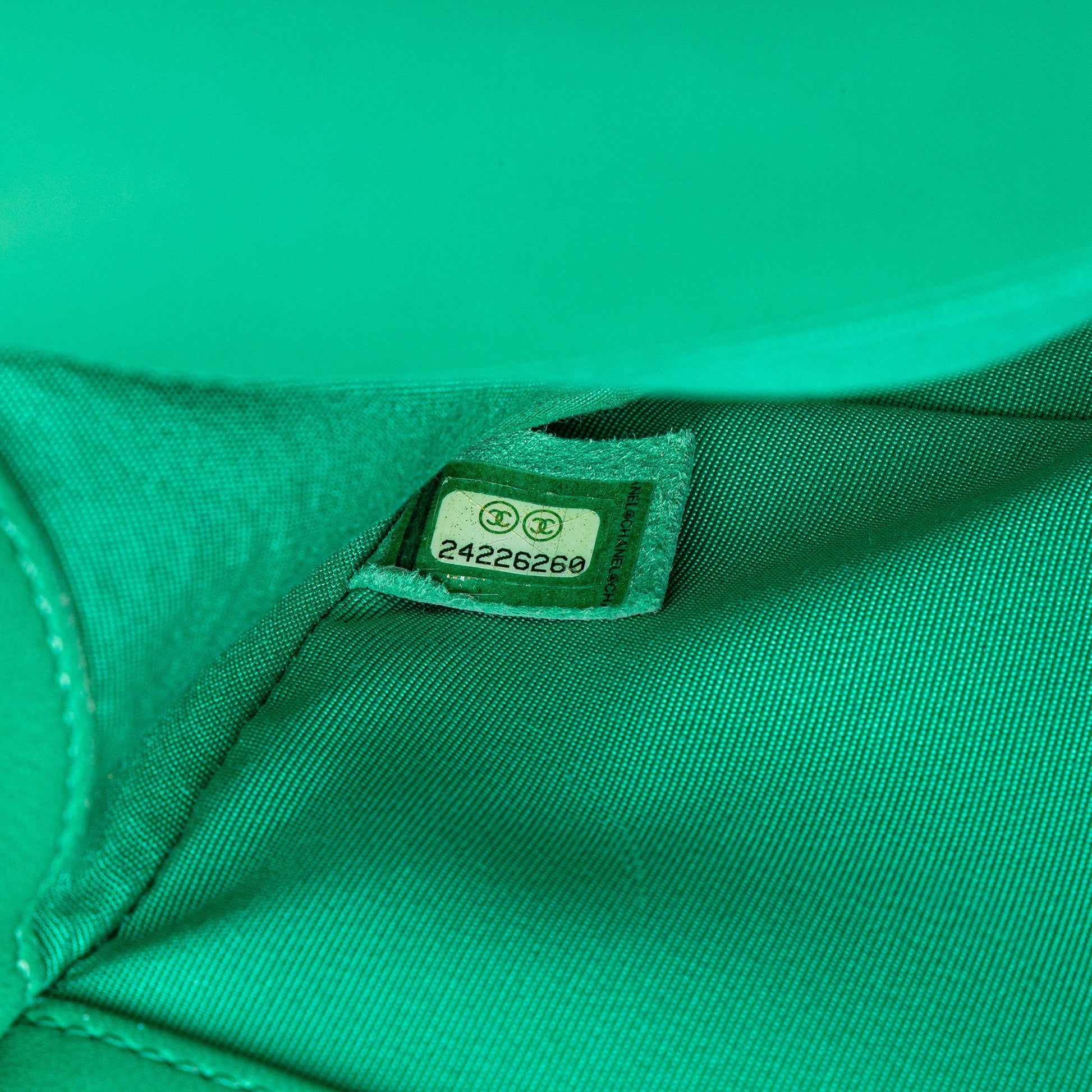 Product Details: Green Chanel Medium Chevron Lambskin and Iridescent PVC Boy Flap Crossbody Bag. The Boy Flap bag features a quilted lambskin leather body with PVC trim, a curb chain shoulder strap with leather guard, a front flap with interlocking Cs and twist lock closure, and interior slip pockets. 5.9" L x 9.8" W x 2.8" D. Serial number 24226260.