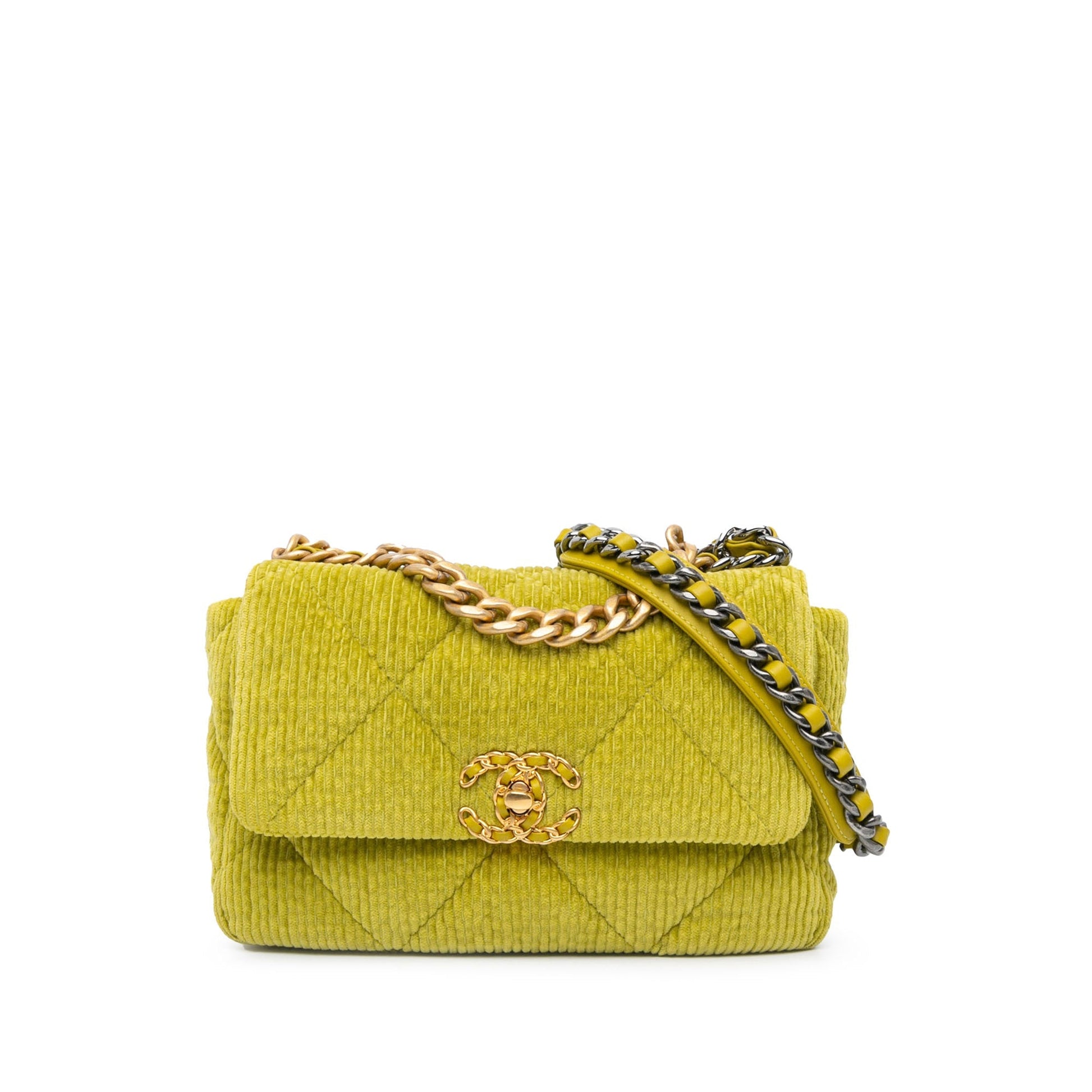 Product Details: Green Chanel Medium Corduroy 19 Flap Satchel. The Medium 19 Flap bag features a quilted corduroy body, chain handle, a woven leather chain shoulder strap, a flap with a CC twist lock closure, an exterior slip pocket, and an interior zip pocket. 6.7" L x 10.2" W x 2.8" D, 3.9" drop. Serial number EHHPEN7G.