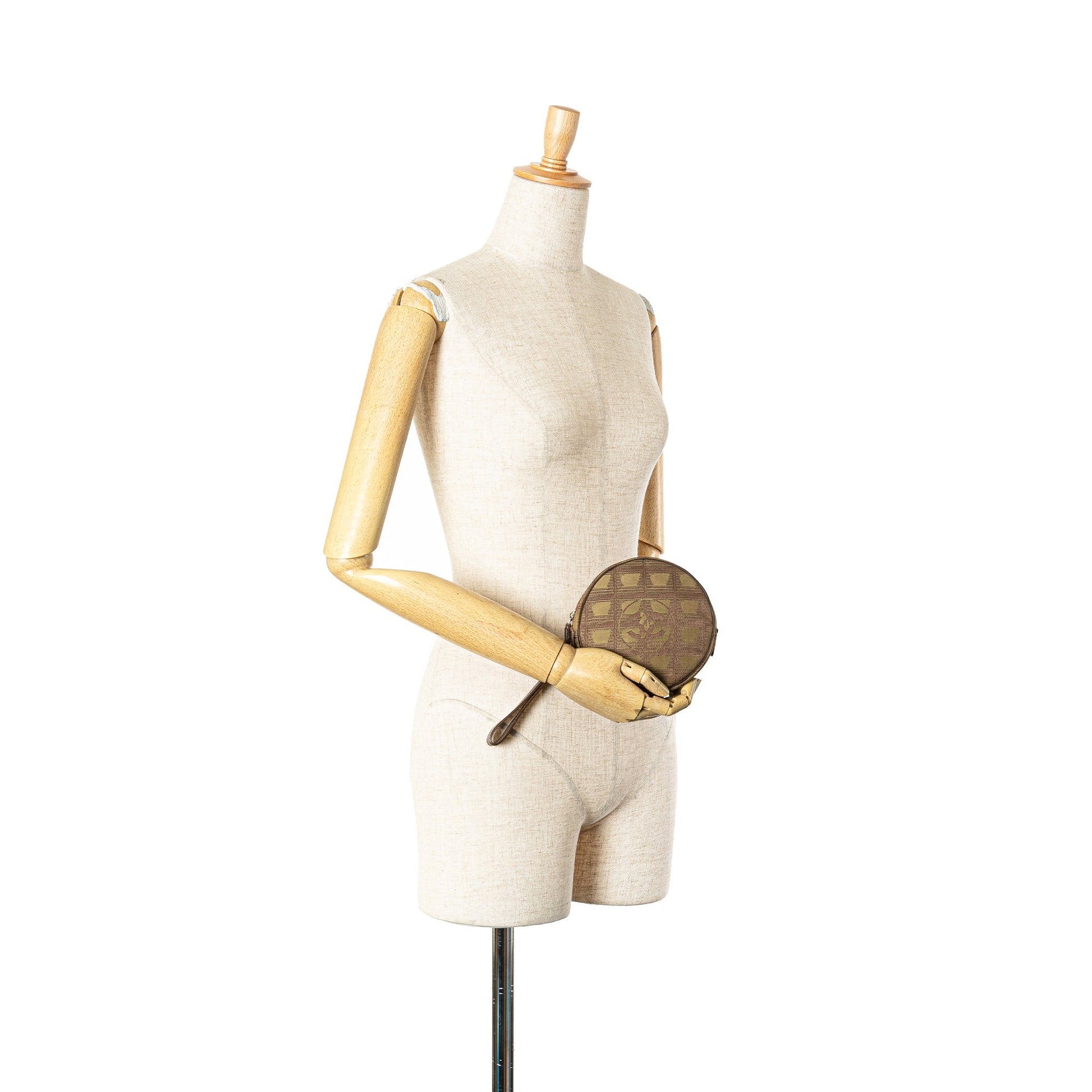 Product Details: Green Chanel New Travel Line Nylon Pouch. This pouch features a nylon body, a flat leather wrist strap, a top zip closure, and an interior slip pocket. 5.5" L x 5.5" W x 1.4" D, 4.9" drop. Serial number 7239069.
