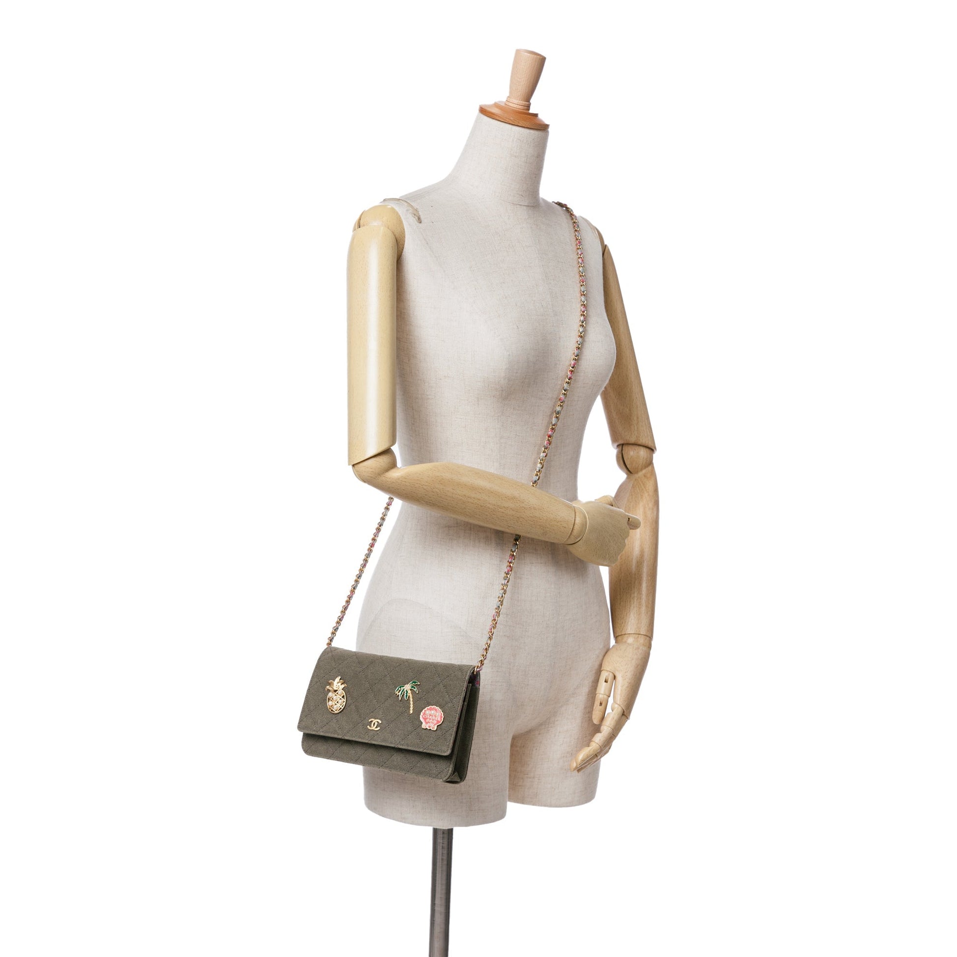 Product Details: Green Chanel Quilted Canvas Coco Cuba Charms Wallet On Chain Crossbody Bag. The Coco Cuba Charms Wallet On Chain features a quilted canvas body, a fabric woven chain link shoulder strap, a front flap with a magnetic closure, an exterior back slip pocket, and interior zip pockets and card slots. 5.1" L x 7.5" W x 1.6" D. Serial number 23015547.