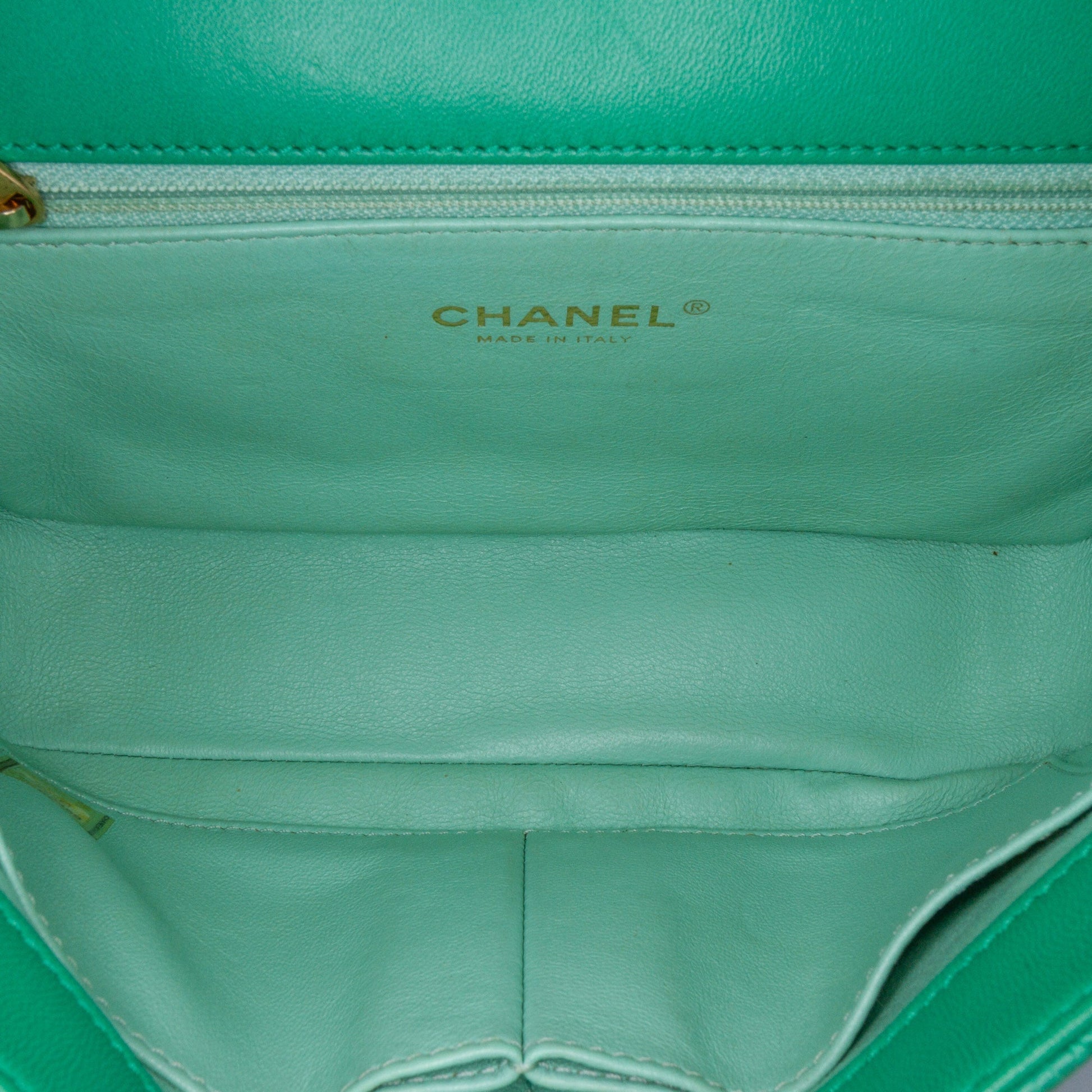 Product Details: Green Chanel Small Caviar CC Filigree Flap Crossbody Bag. The Filigree flap bag features a quilted caviar leather body, a leather woven chain shoulder strap with leather guard, a front flap with magnetic snap closure, an exterior back slip pocket, and interior zip and slip pockets. 5.3" L x 8.7" W x 2.2" D, 12.4" drop. Serial number 24065459.