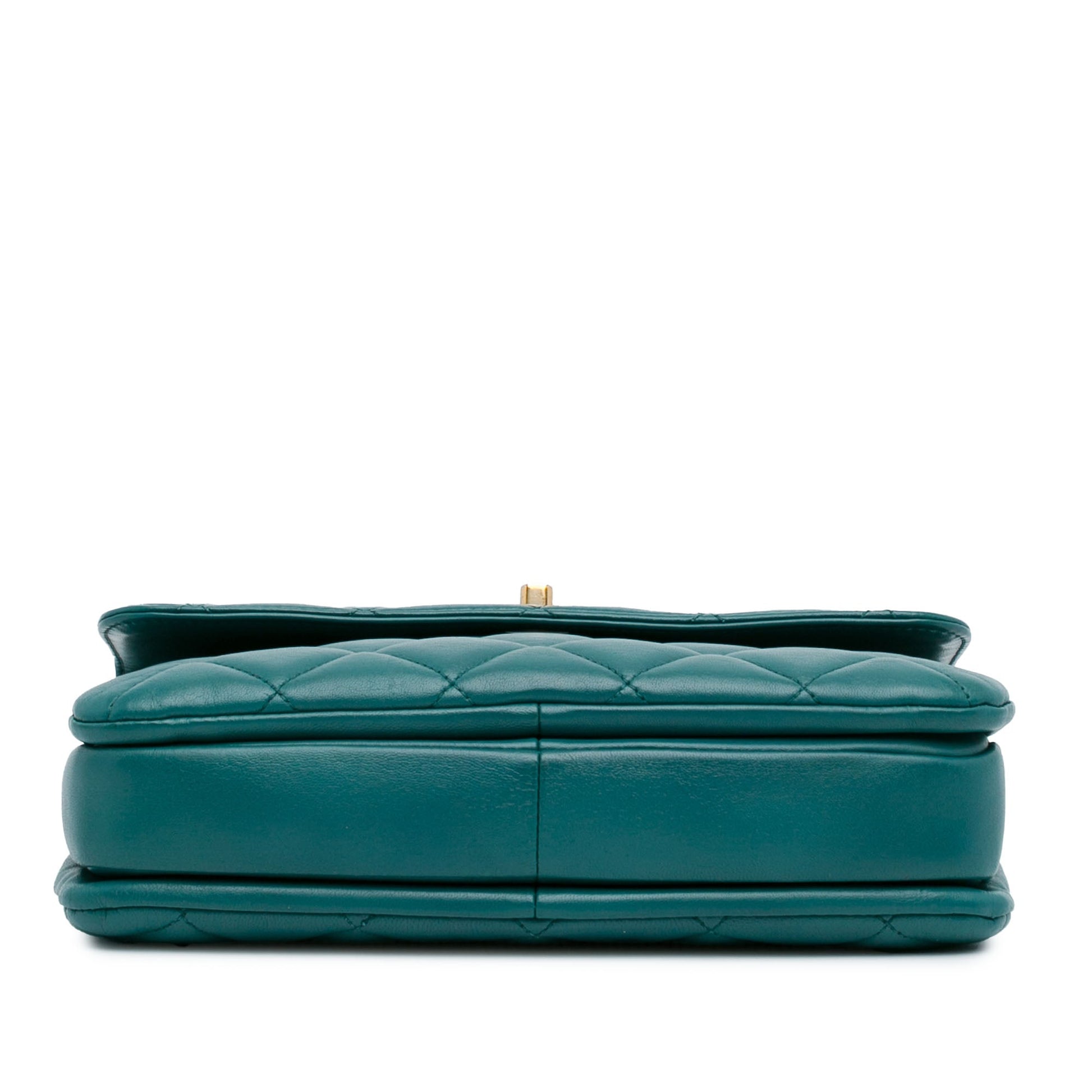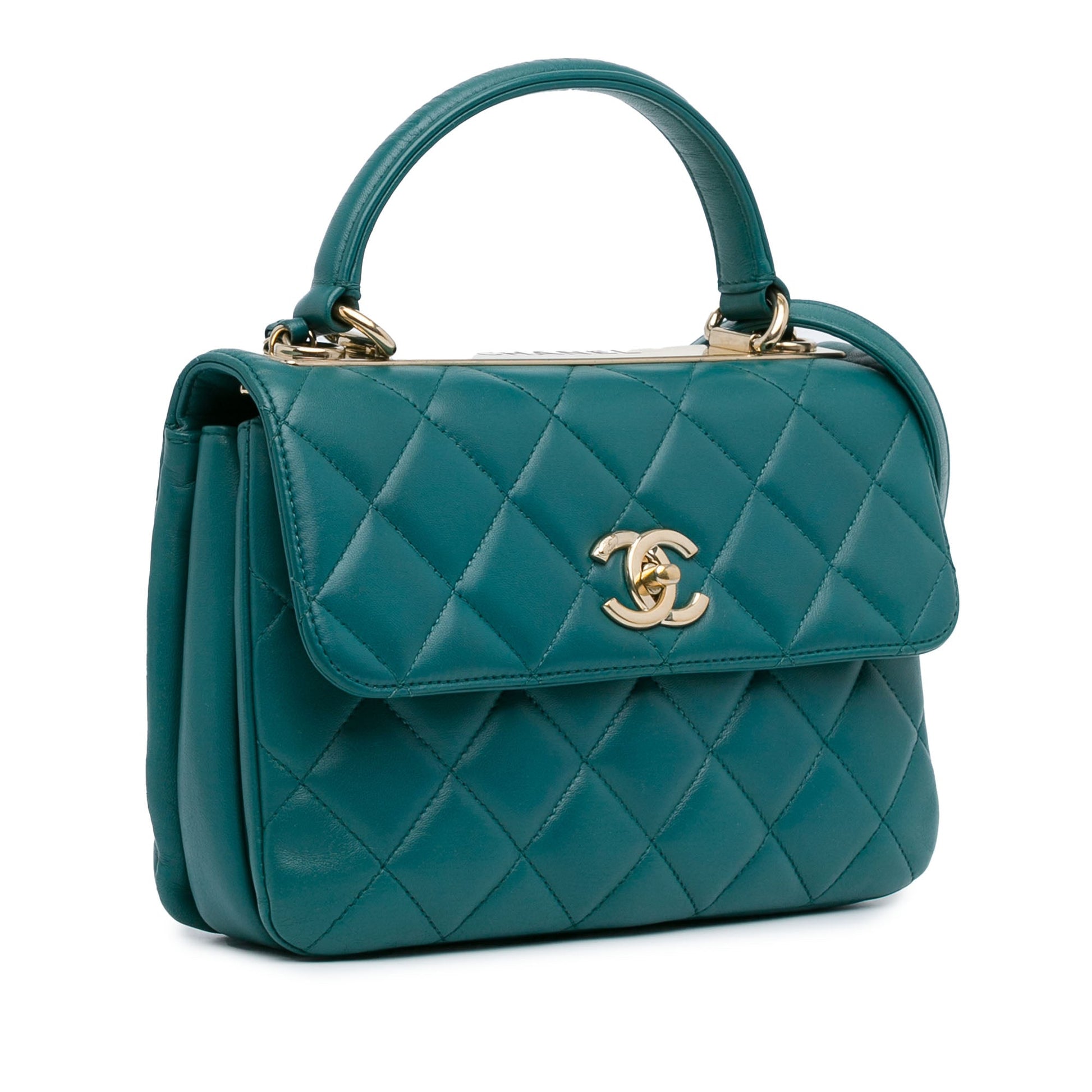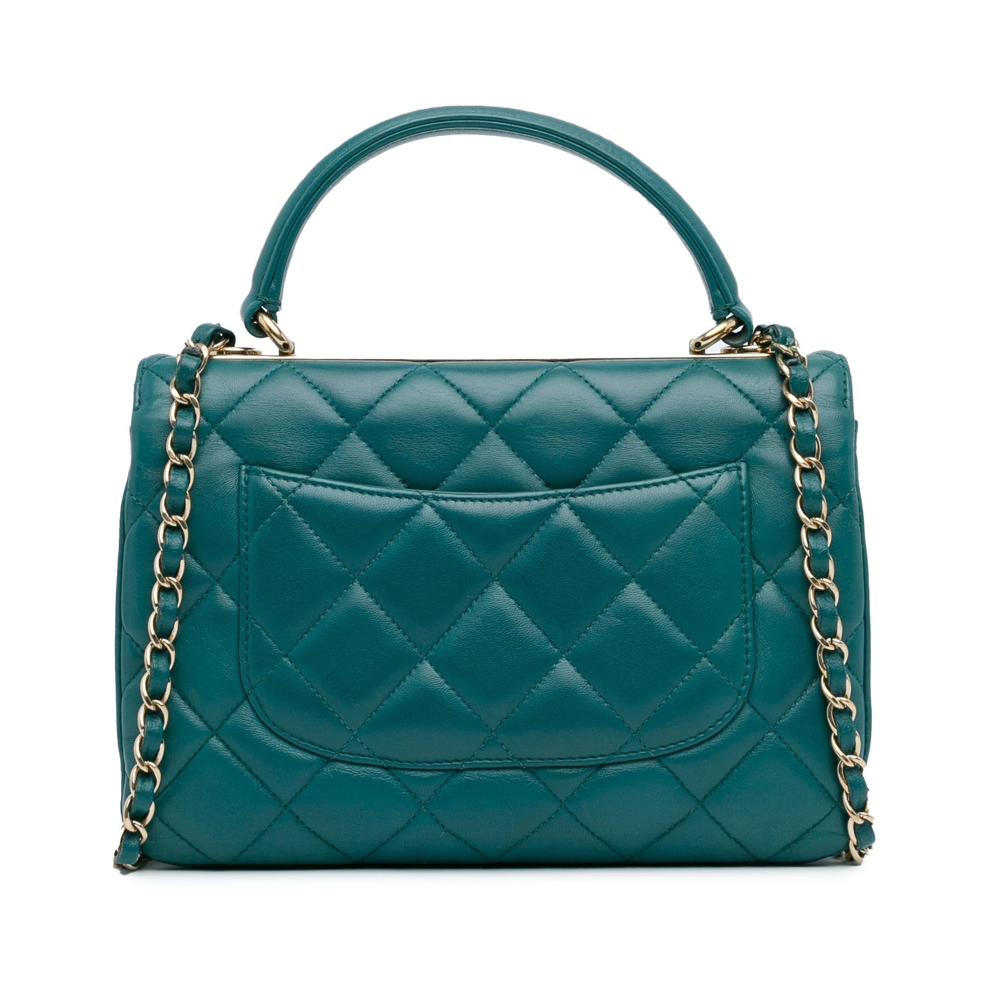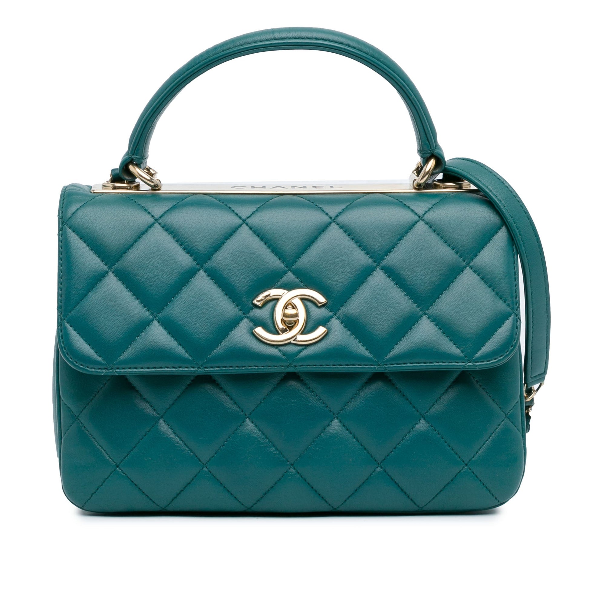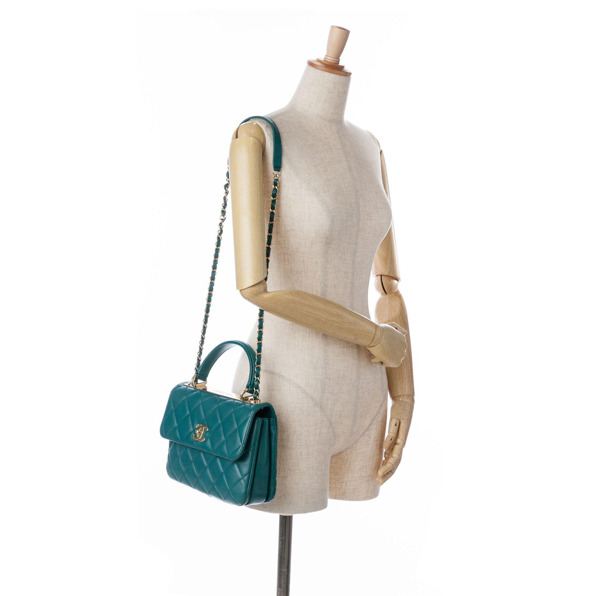 Product Details: Green Chanel Small Lambskin Trendy CC Flap Satchel. The Trendy CC satchel features a quilted lambskin leather body, a flat leather top handle, a leather-woven chain strap with leather shoulder guard, a front flap with CC turn-lock closure, an exterior back slip pocket, and interior slip pockets. 7.5" L x 9.8" W x 3.1" D, 3.9" drop. Serial number 20415933.