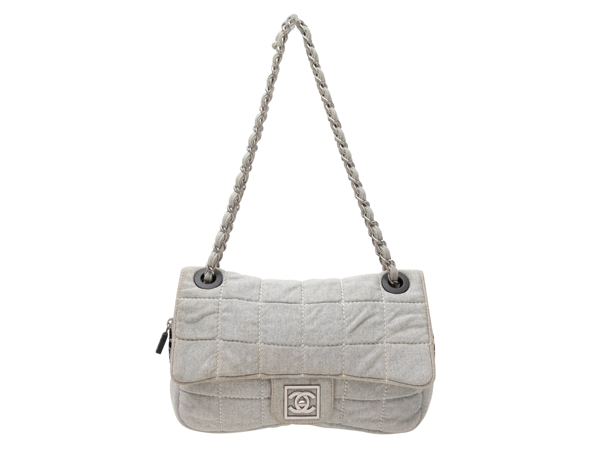 Product Details: Grey Chanel 2006 Quilted Jersey Shoulder Bag. This shoulder bag features a quilted jersey body, silver-tone hardware, dual chain-link and fabric shoulder strap, and a top zip and front CC turn-lock closures. 11" L x 7" H x 2" D, 10" strap drop, 17" shoulder strap drop.