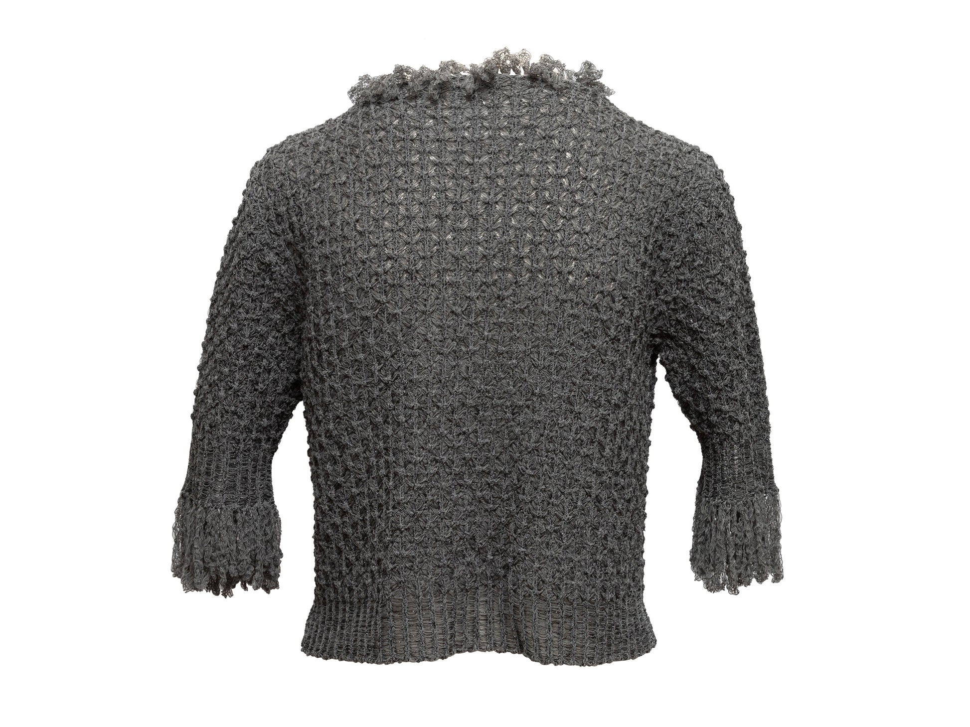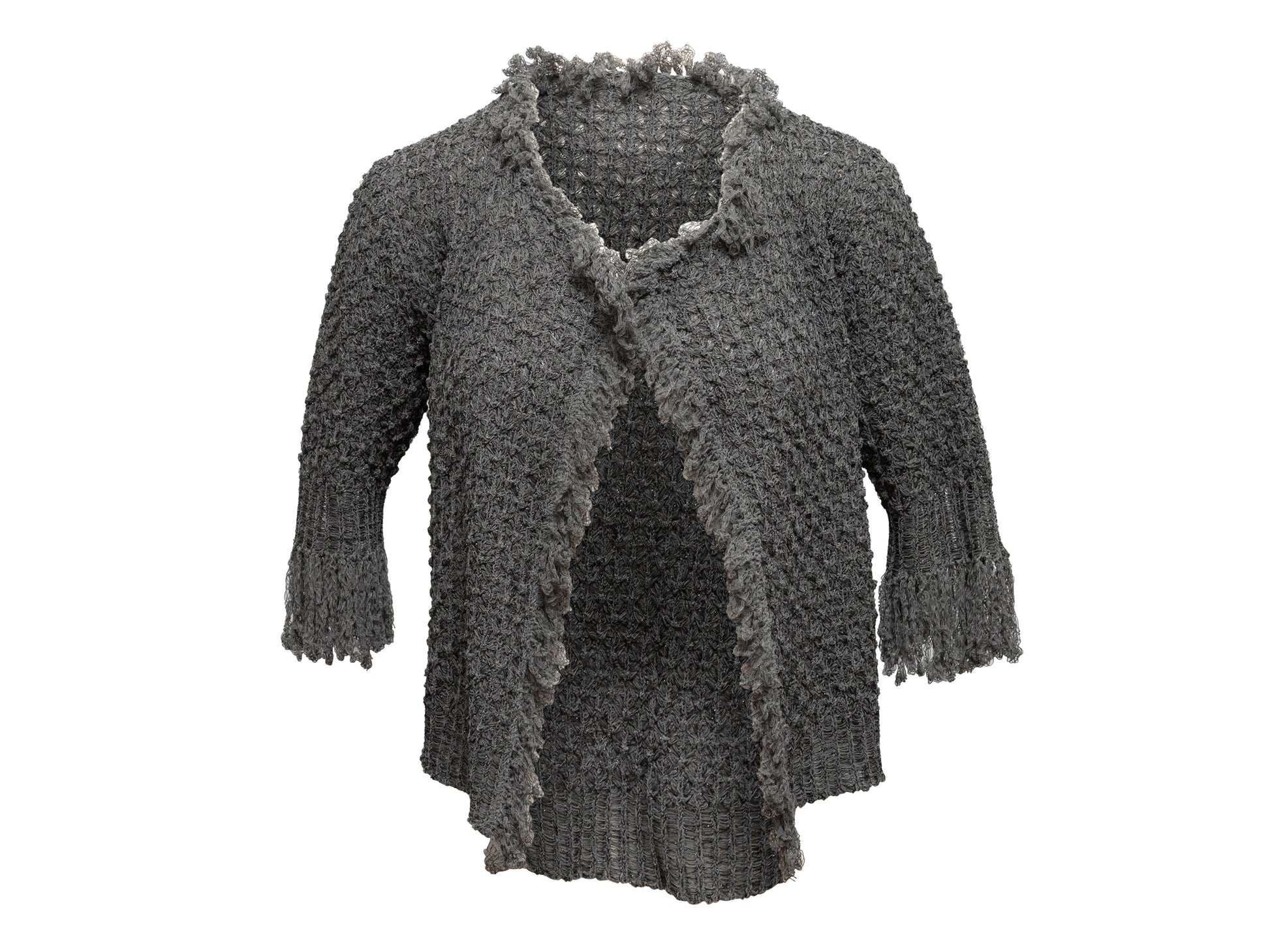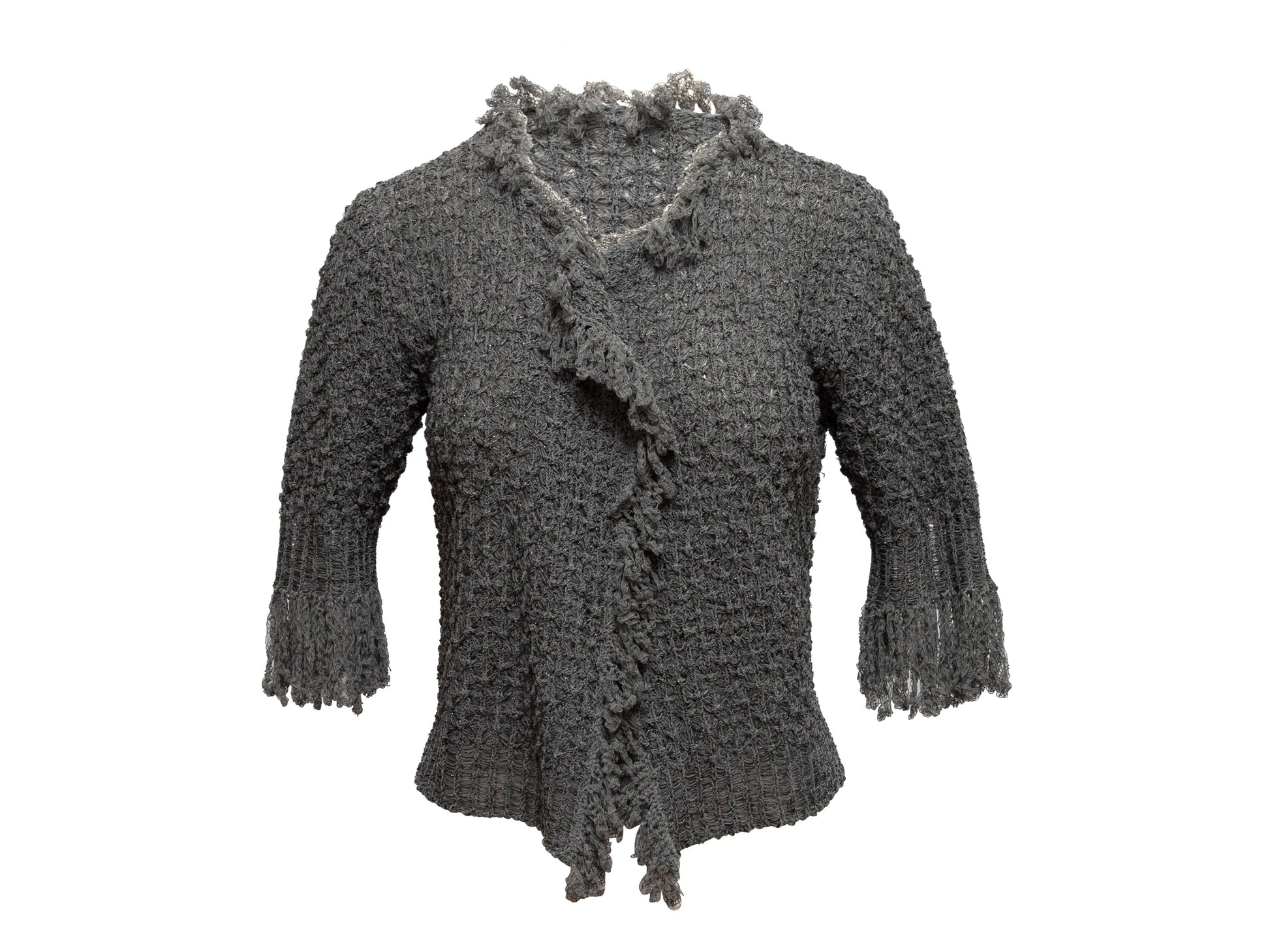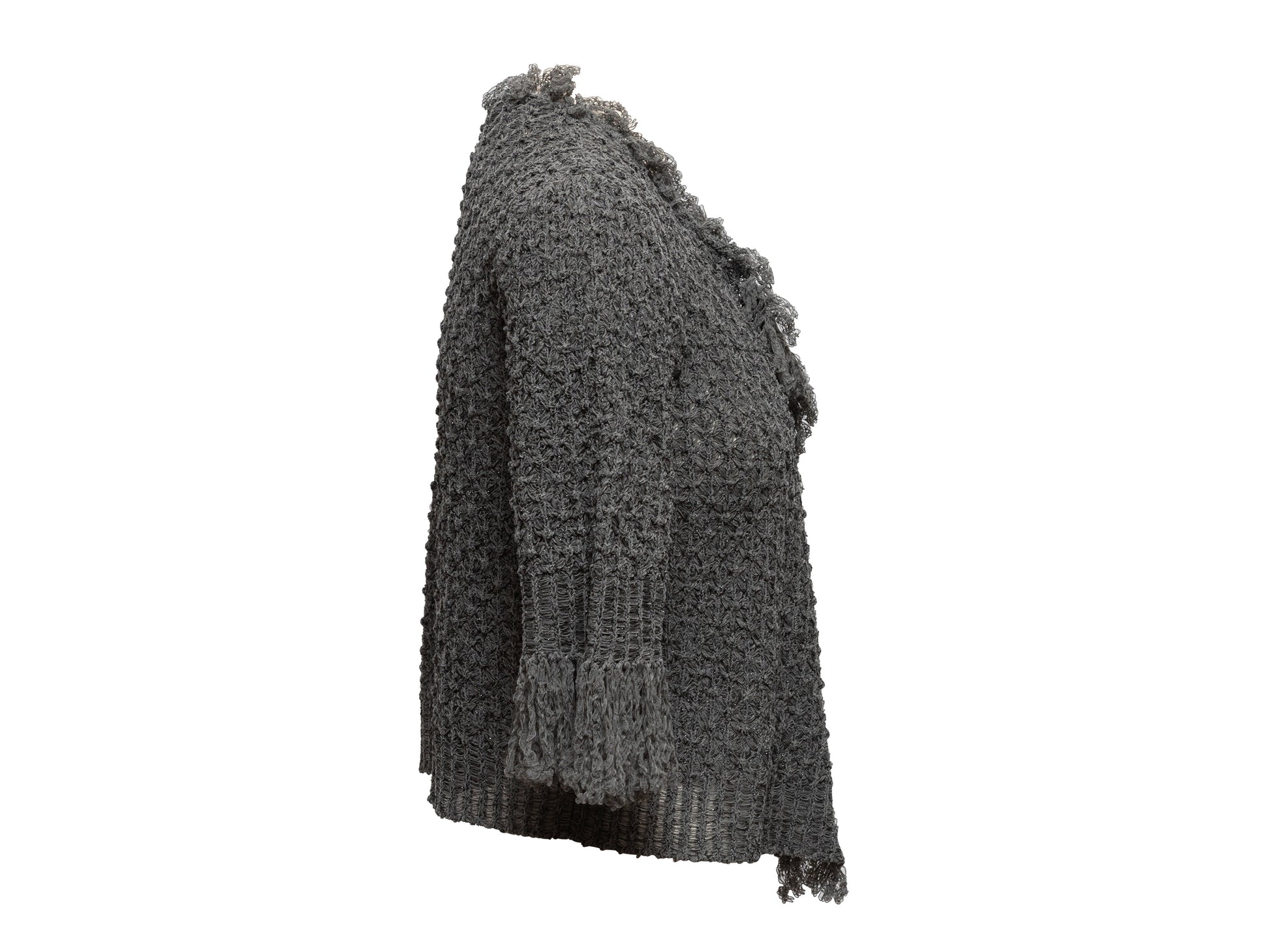 Product Details: Grey fringe-trimmed knit cardigan by Chanel. Three-quarter sleeves. Designer size 40. 38" bust, 18" shoulder width, 13" sleeve length, 18" length.
